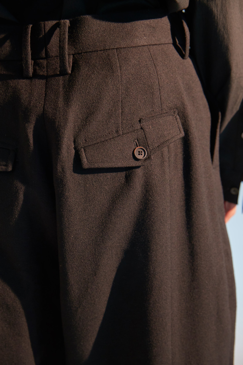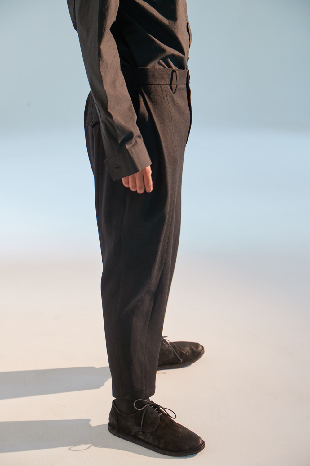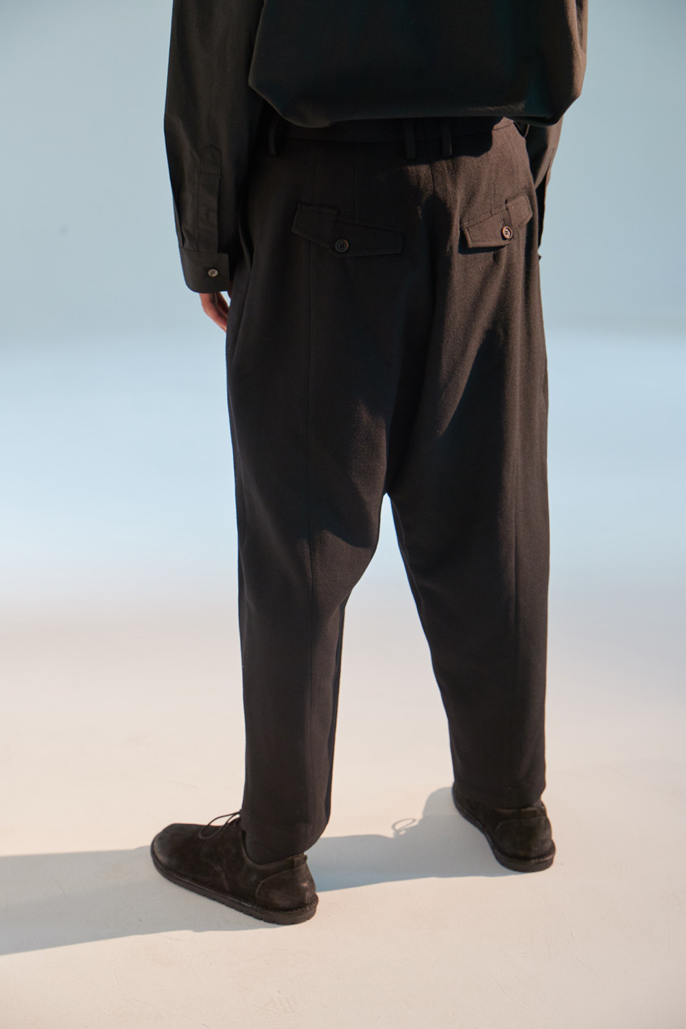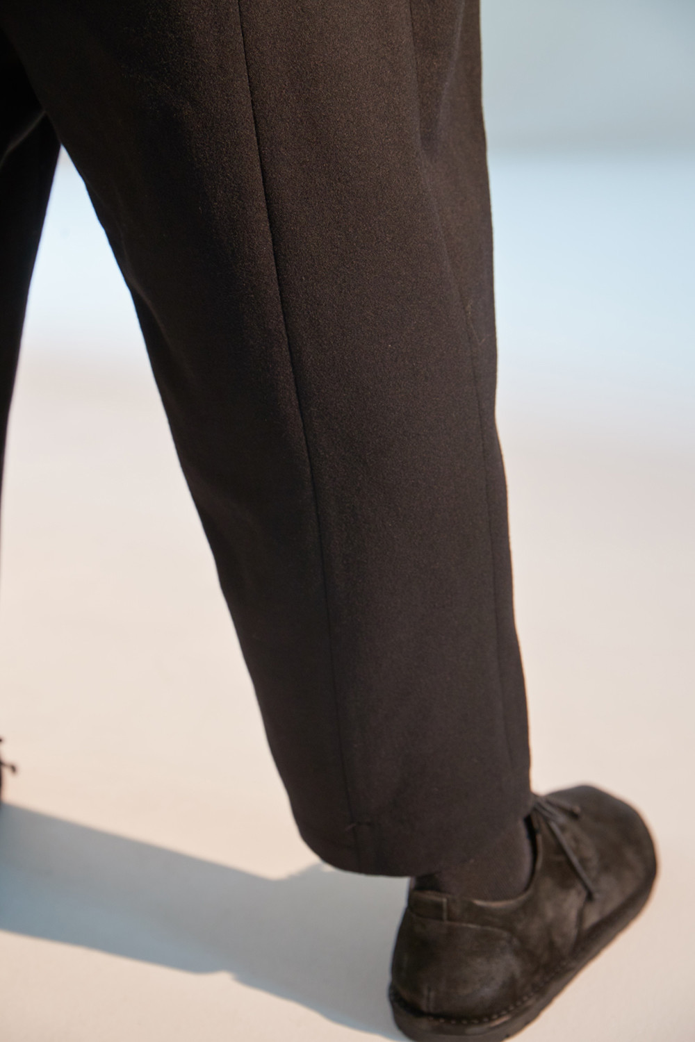 Disconnected Lapel Detailed Jacket 002 과 풀세트로 스타일링된 바지. tapered 형태의 바지. 앞뒤 중앙에 seam(절개)가 있고 이 절개를 기점으로 밑단에서 hem 스티치 높이가 다름. 소모 이중지 원단으로 두께감이 어느정도 있기 때문에 가을부터 한겨울까지 따뜻하게 입을 수 있음. 뒷주머니 flap이 반으로 잘리면서 슬라이드된 듯한 느낌의 디테일. 고급 너트단추 사용.