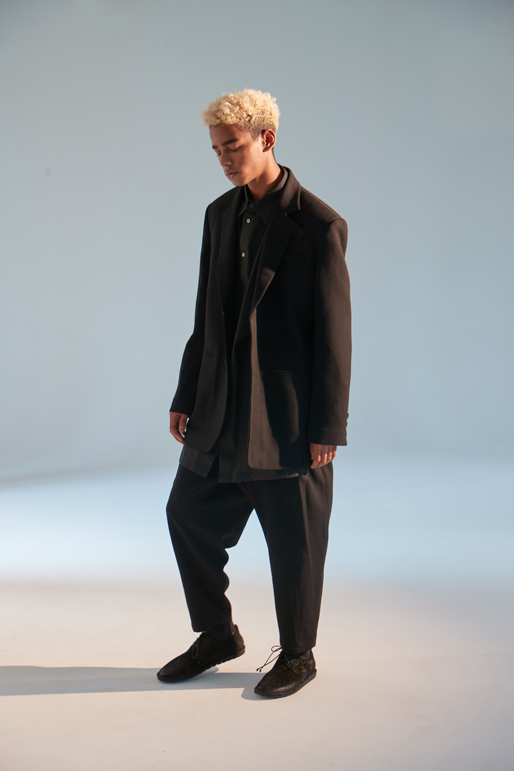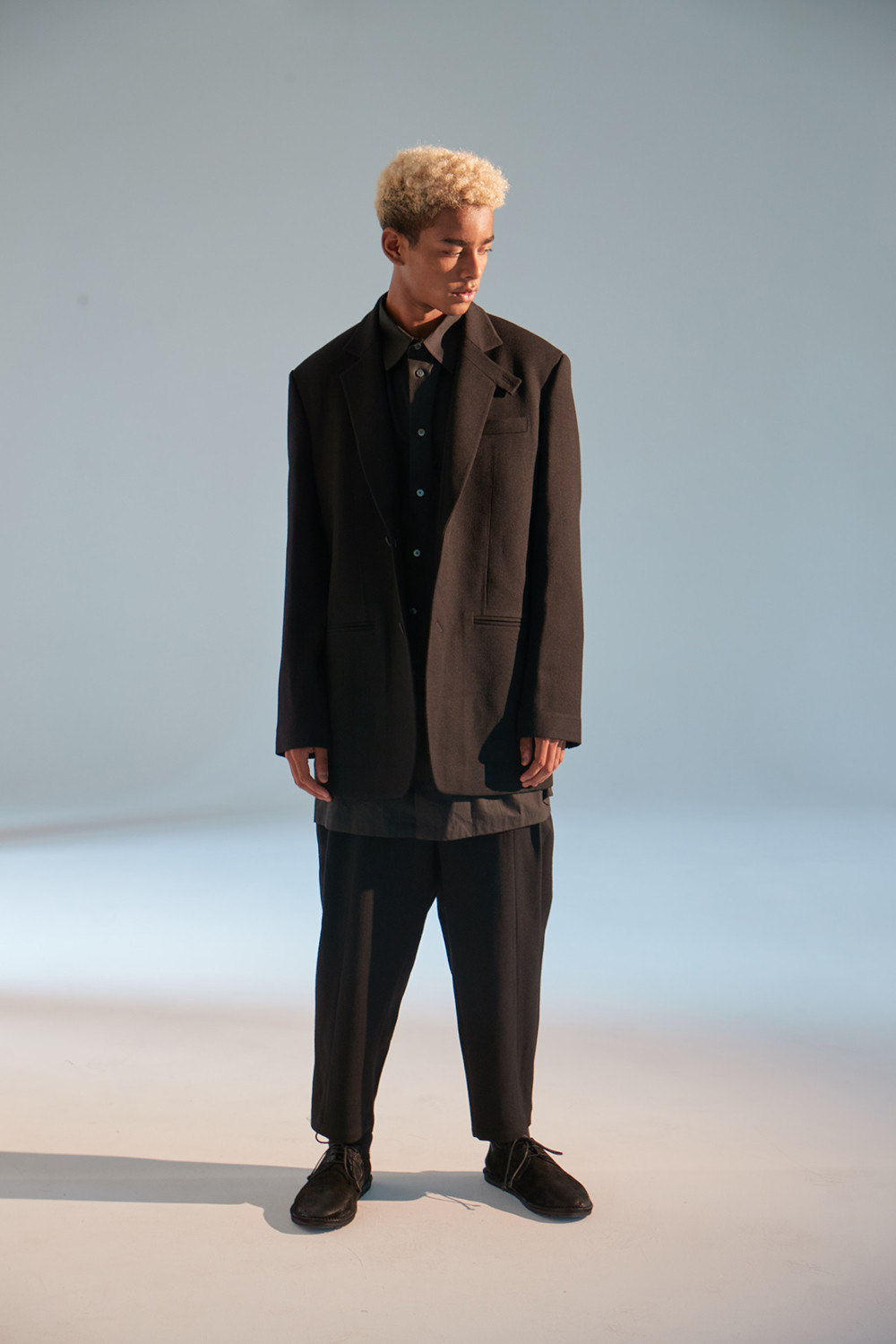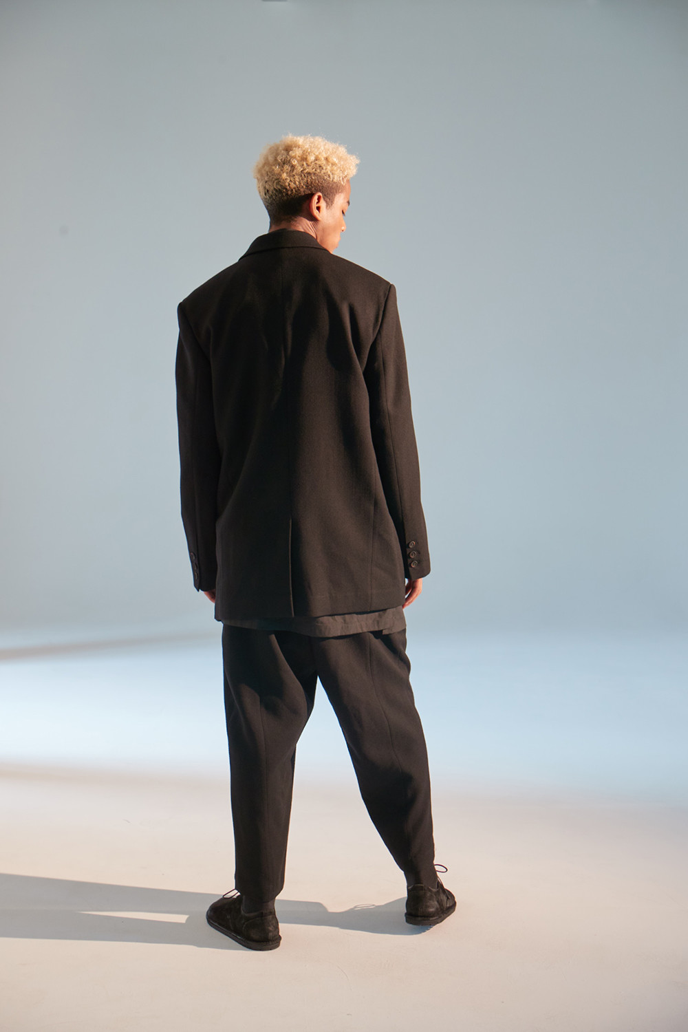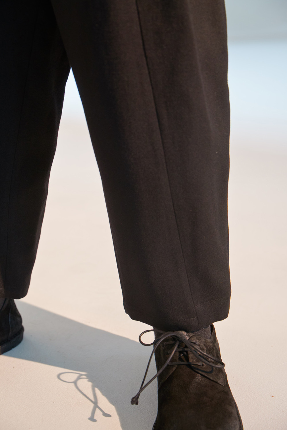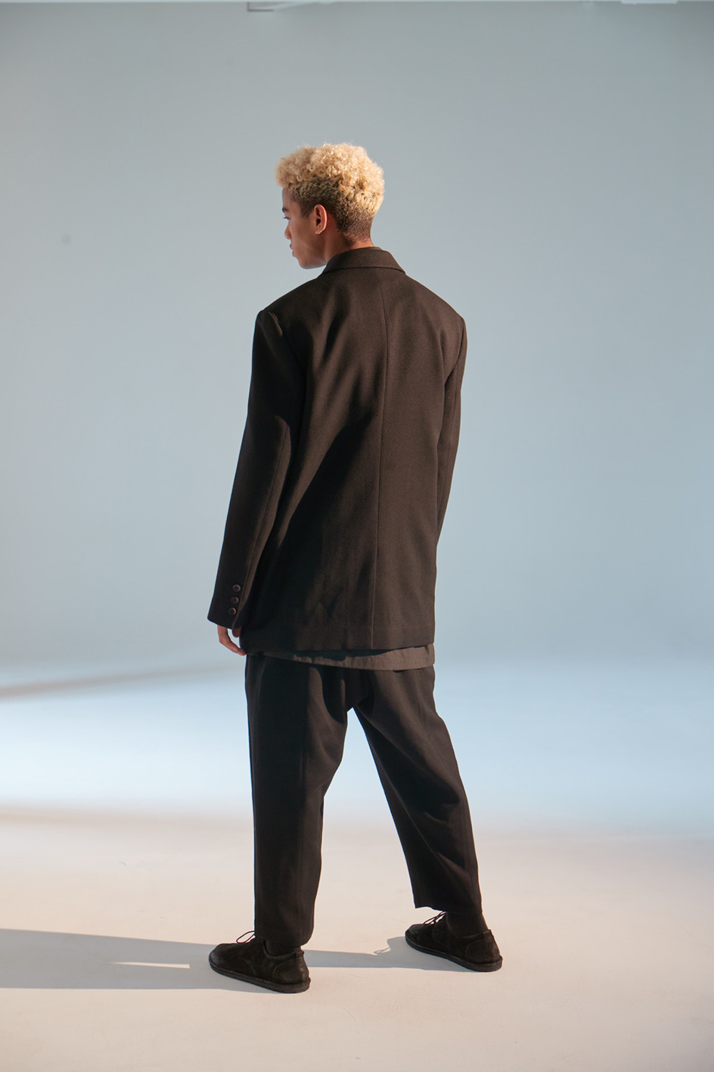 Disconnected Lapel Detailed Jacket 002 과 풀세트로 스타일링된 바지. tapered 형태의 바지. 앞뒤 중앙에 seam(절개)가 있고 이 절개를 기점으로 밑단에서 hem 스티치 높이가 다름. 소모 이중지 원단으로 두께감이 어느정도 있기 때문에 가을부터 한겨울까지 따뜻하게 입을 수 있음. 뒷주머니 flap이 반으로 잘리면서 슬라이드된 듯한 느낌의 디테일. 고급 너트단추 사용.