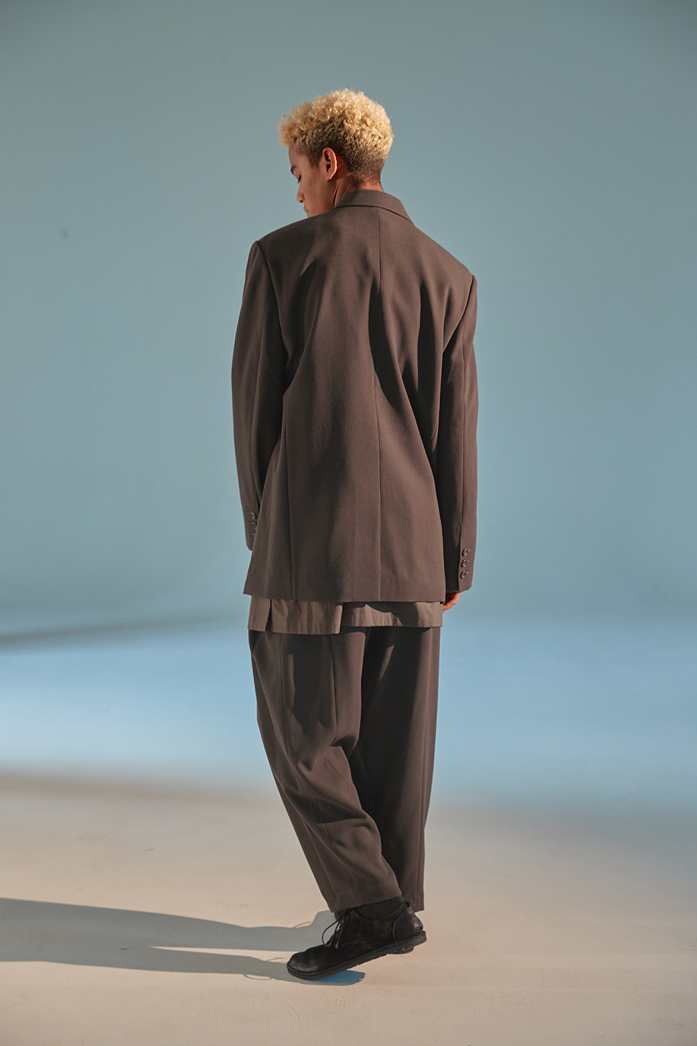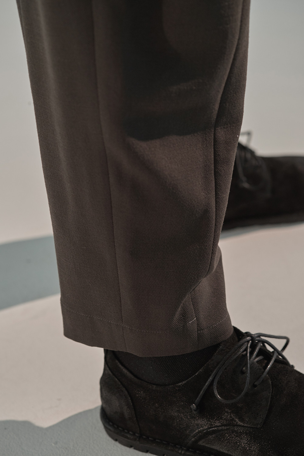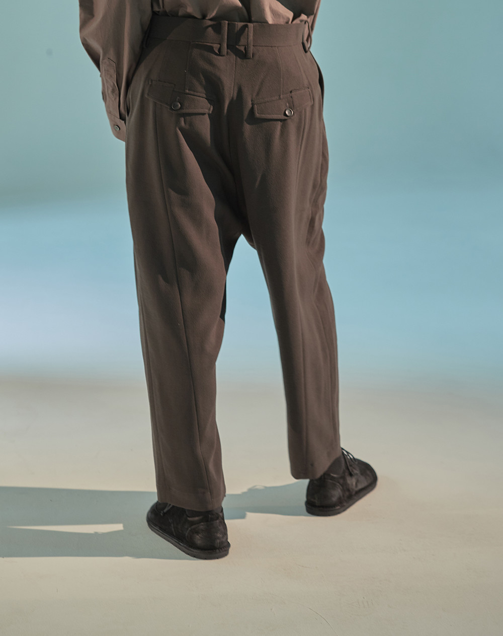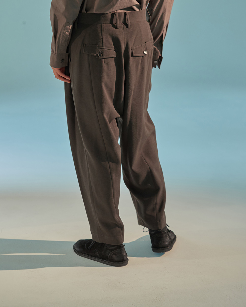 Disconnected Lapel Detailed Jacket 003 과 풀세트로 스타일링된 같은 원단을 사용한 셋업 바지. 약간 러프하고 거친느낌의 텍스쳐, 터치감이 있는 것이 매력인 원단. tapered 실루엣. 앞뒤 중앙에 seam(절개)가 있고 이 절개를 기점으로 밑단에서 hem 스티치 높이가 다름. 뒷주머니 flap이 반으로 잘리면서 슬라이드된 듯한 느낌의 디테일. 고급 너트단추 사용.