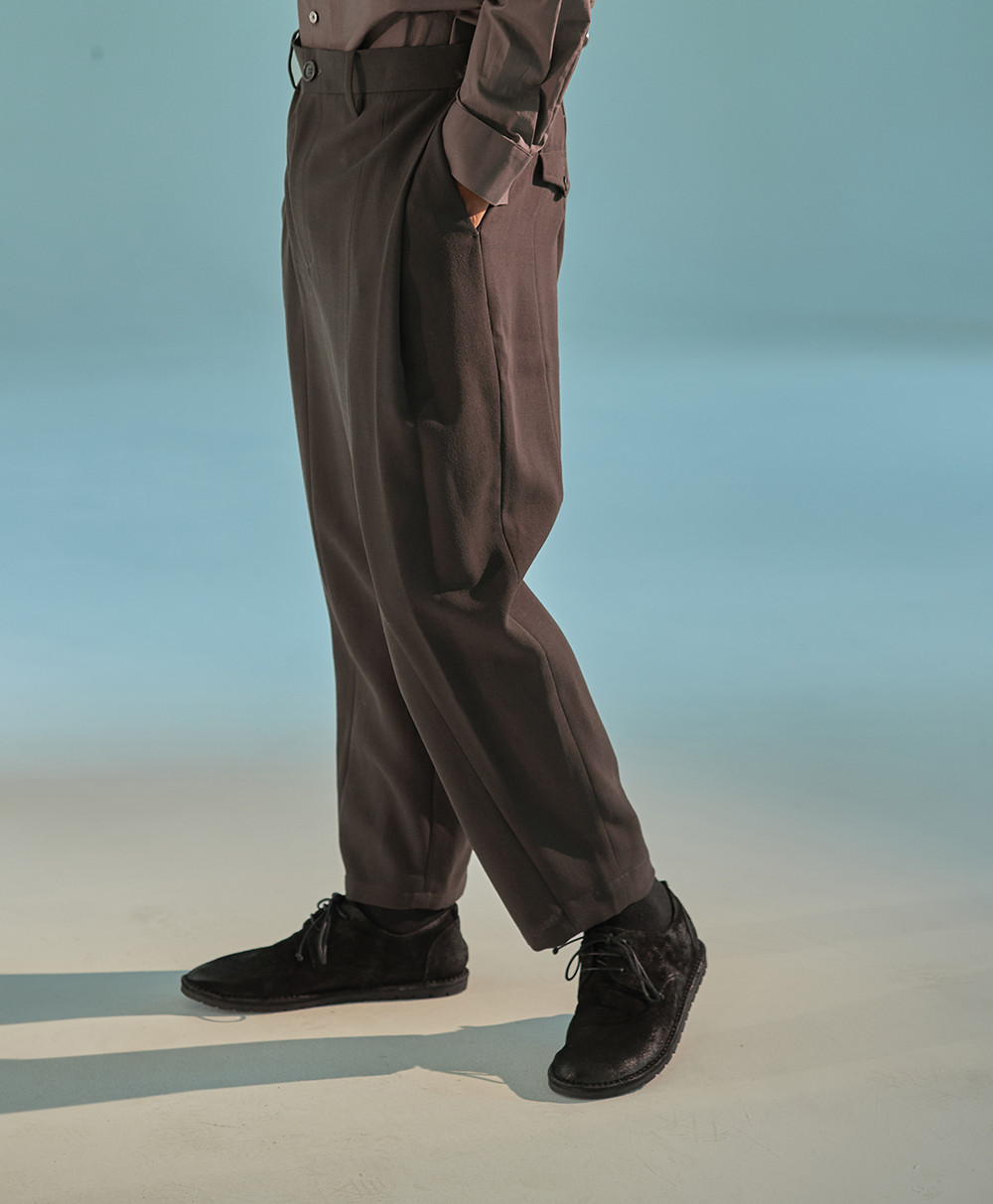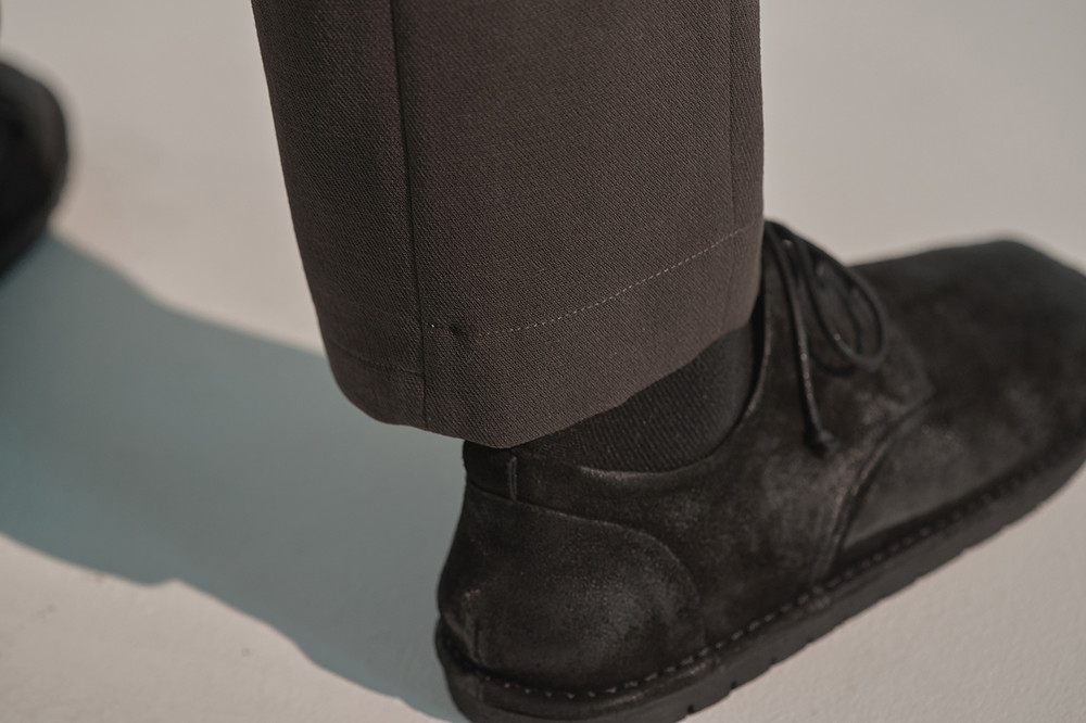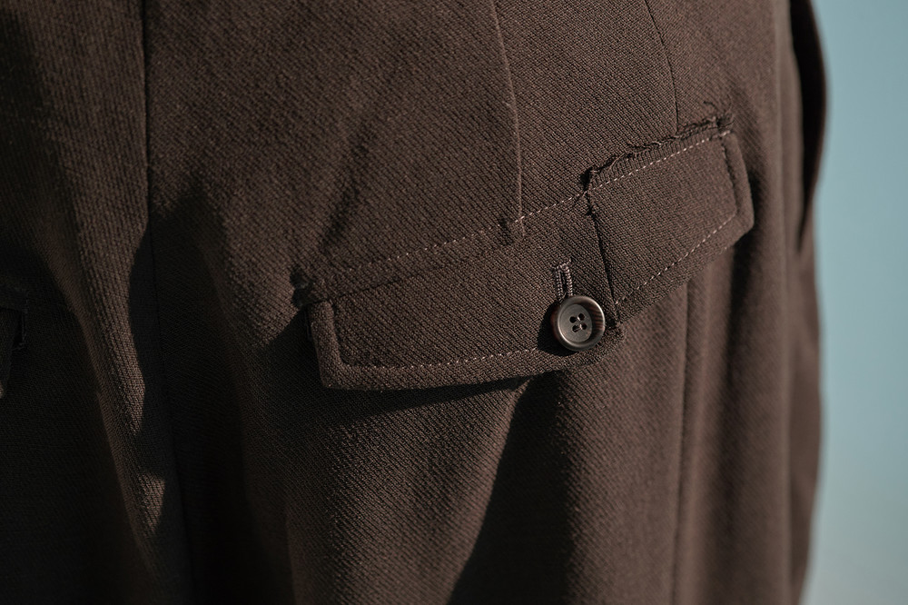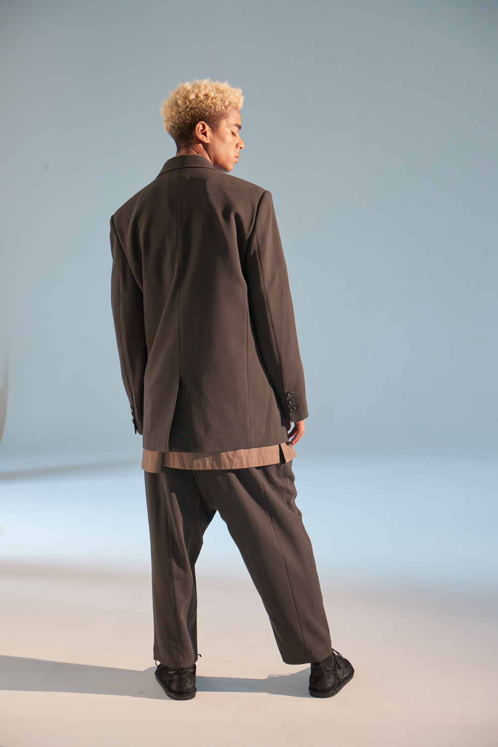 Disconnected Lapel Detailed Jacket 003 과 풀세트로 스타일링된 같은 원단을 사용한 셋업 바지. 약간 러프하고 거친느낌의 텍스쳐, 터치감이 있는 것이 매력인 원단. tapered 실루엣. 앞뒤 중앙에 seam(절개)가 있고 이 절개를 기점으로 밑단에서 hem 스티치 높이가 다름. 뒷주머니 flap이 반으로 잘리면서 슬라이드된 듯한 느낌의 디테일. 고급 너트단추 사용.