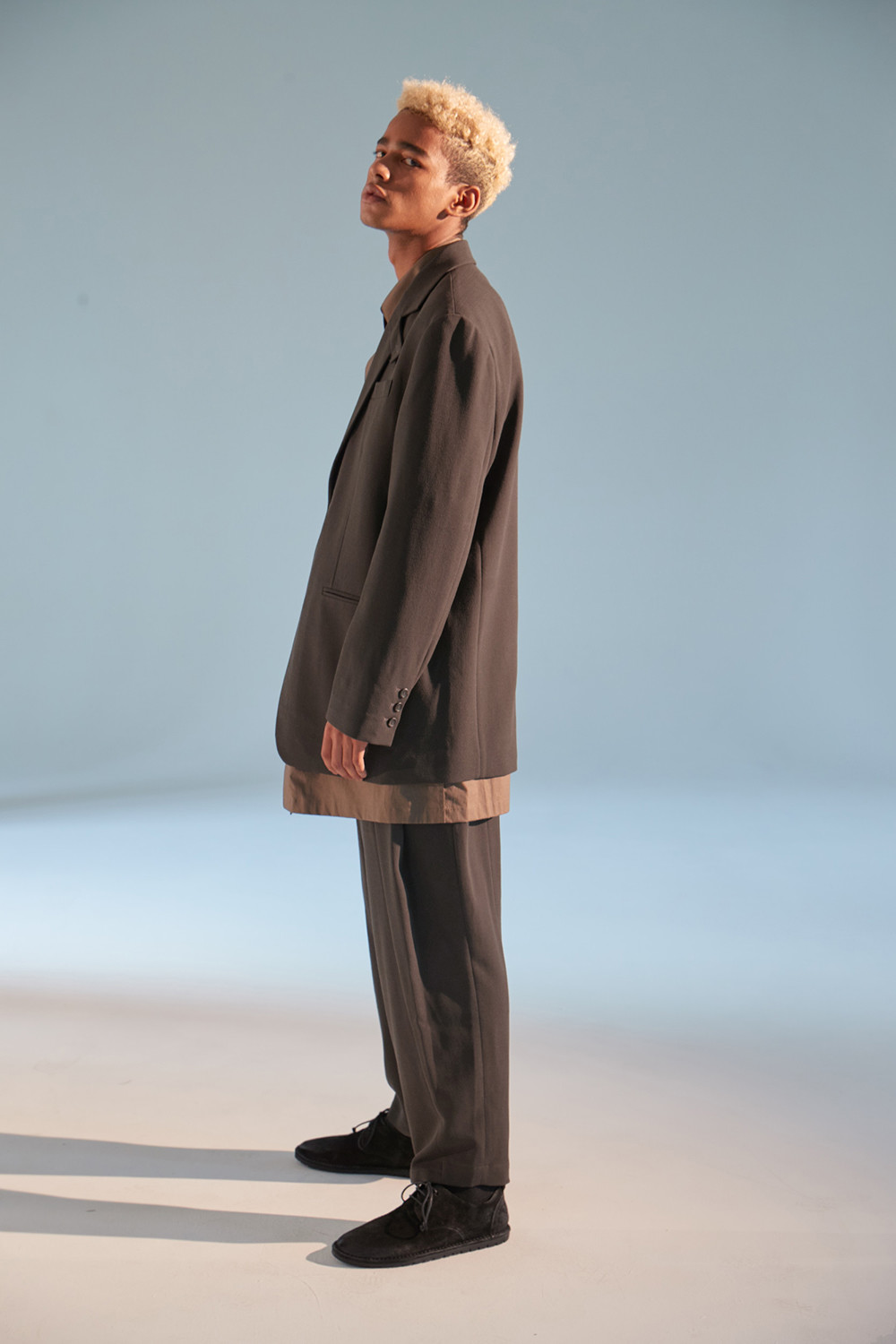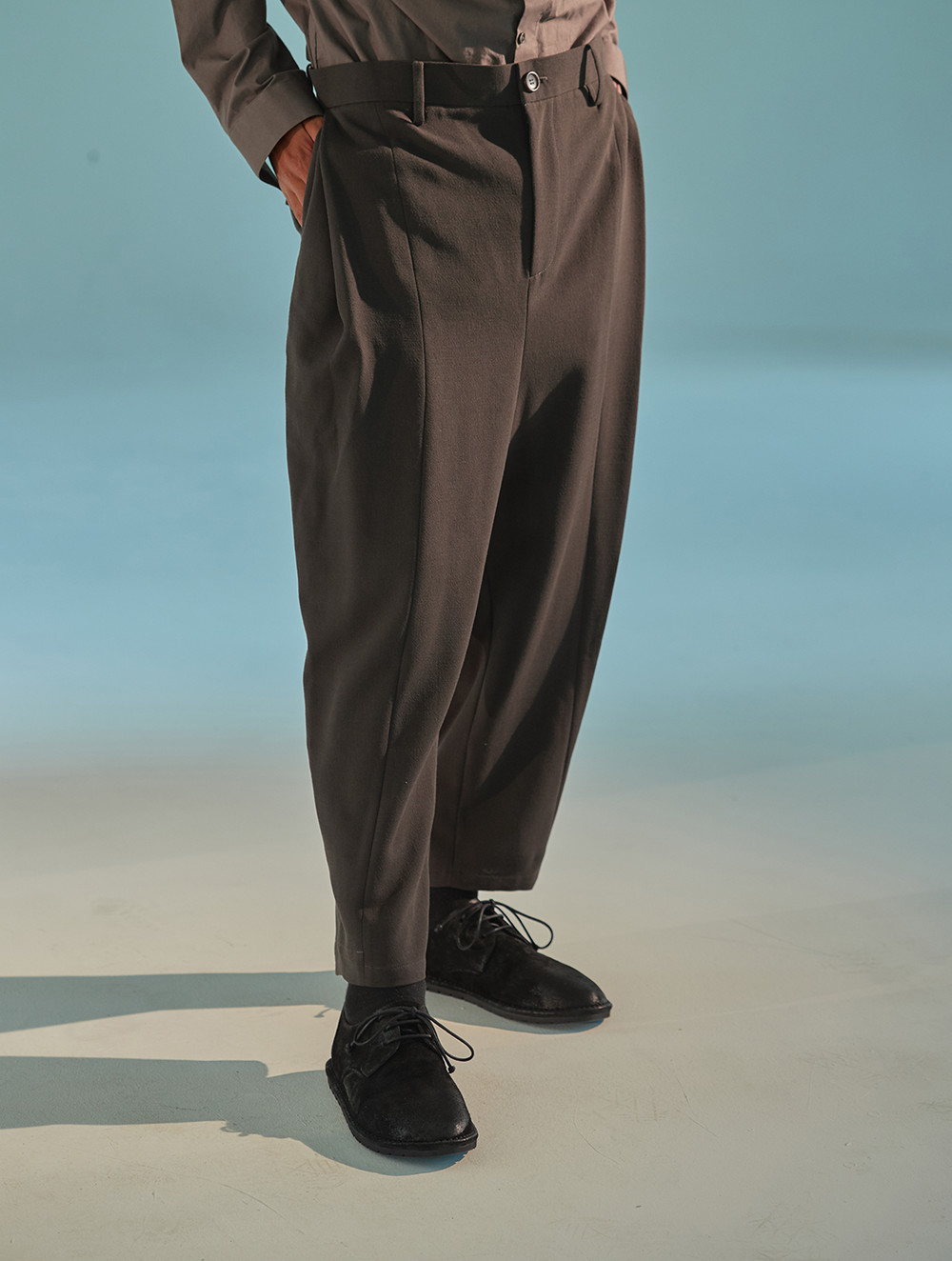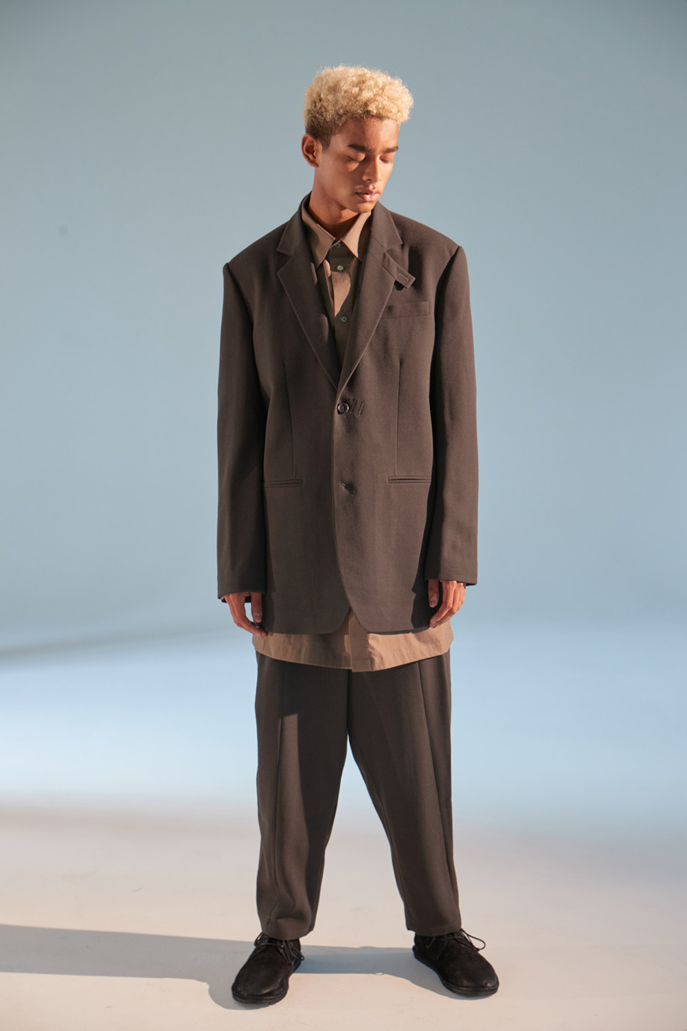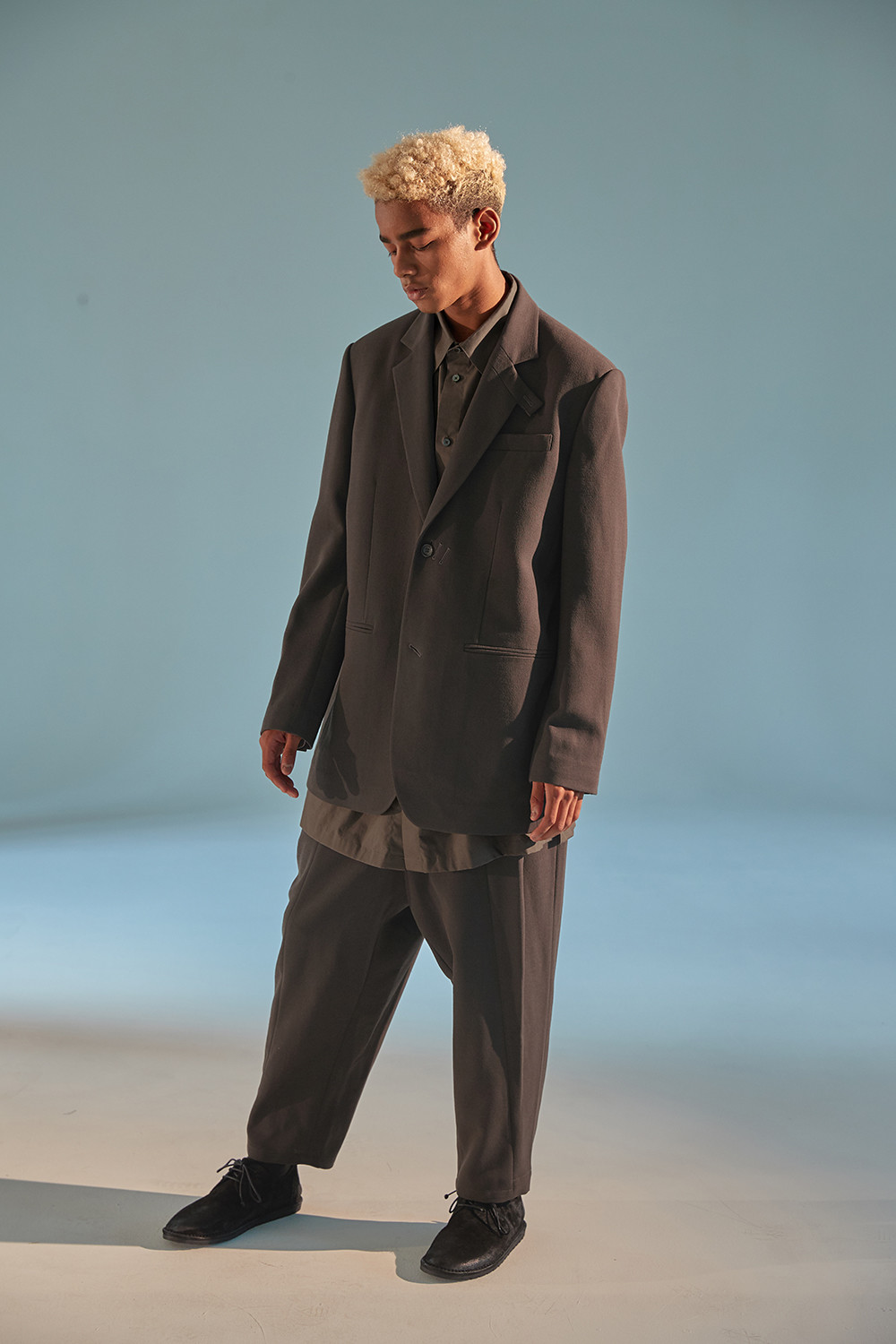 Disconnected Lapel Detailed Jacket 003 과 풀세트로 스타일링된 같은 원단을 사용한 셋업 바지. 약간 러프하고 거친느낌의 텍스쳐, 터치감이 있는 것이 매력인 원단. tapered 실루엣. 앞뒤 중앙에 seam(절개)가 있고 이 절개를 기점으로 밑단에서 hem 스티치 높이가 다름. 뒷주머니 flap이 반으로 잘리면서 슬라이드된 듯한 느낌의 디테일. 고급 너트단추 사용.