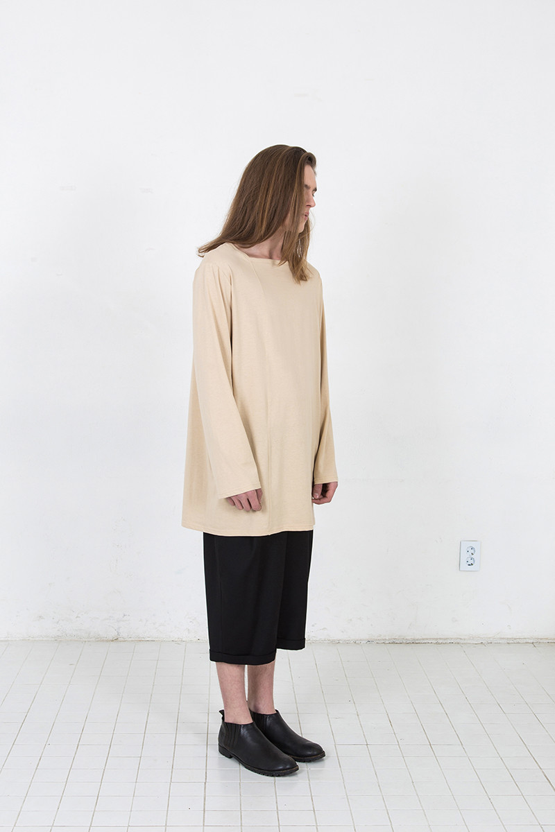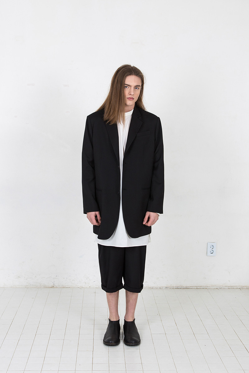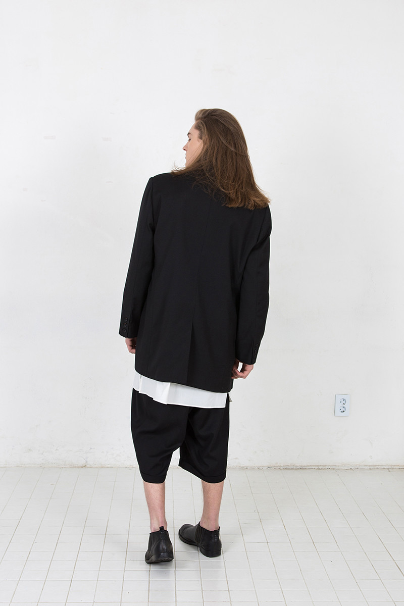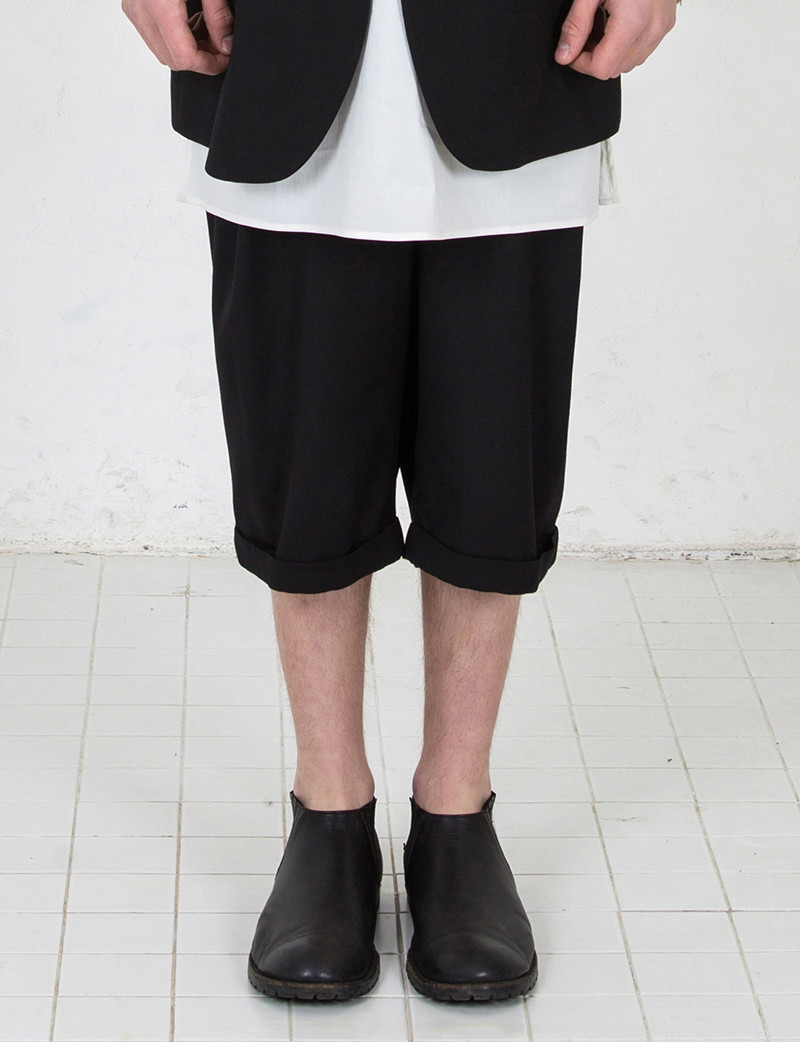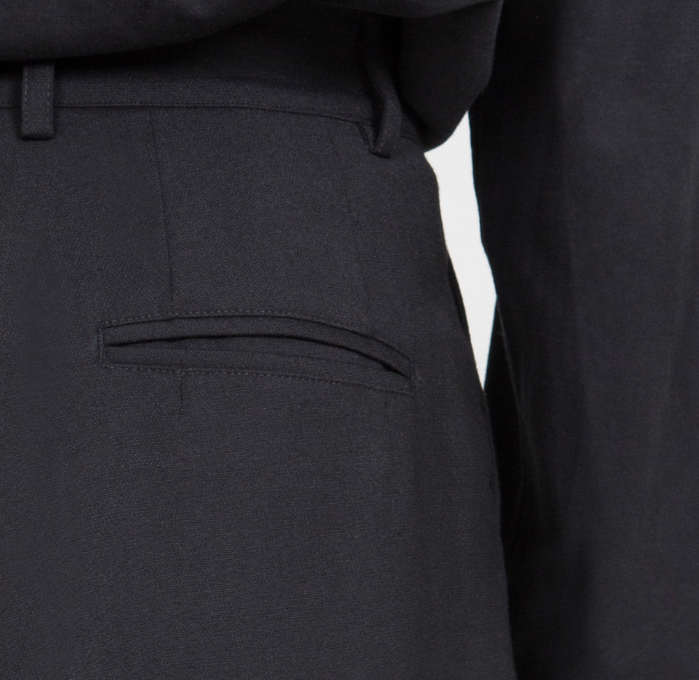 2 Botton Loose Fit Black Jacket과 같이 풀룩으로 스타일링하기 좋은 바지. 7~8부 정도의 기장이고 (정확한 길이는 사이즈 차트 참고) 밑위가 긴 배기 핏의 바지. 2 Botton Loose Fit Black Jacket과 같은 원단을 사용하였으므로 물세탁 절대 금지. 바지 밑단의 더블 턴업 디테일 (카브라).