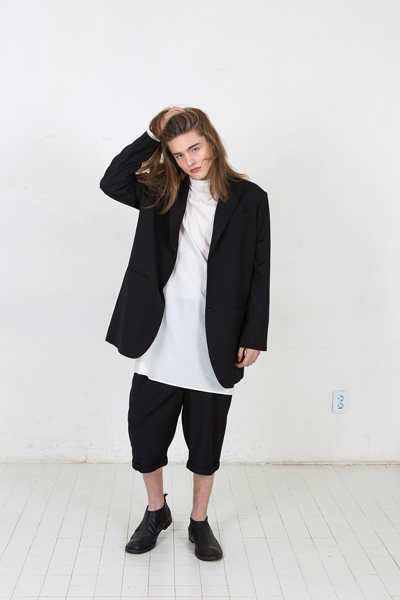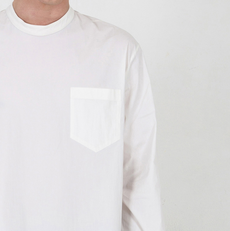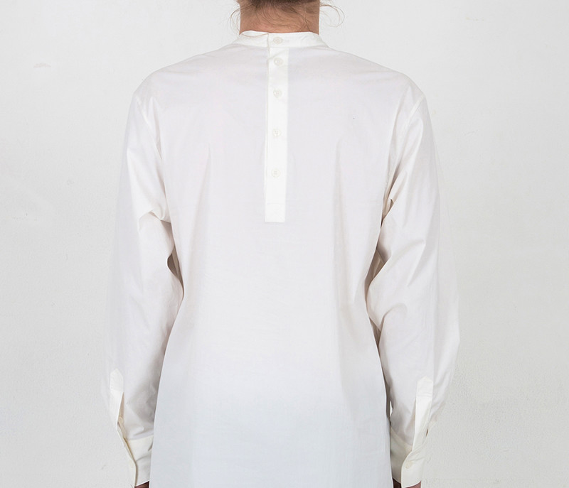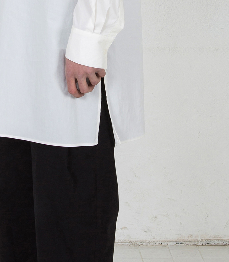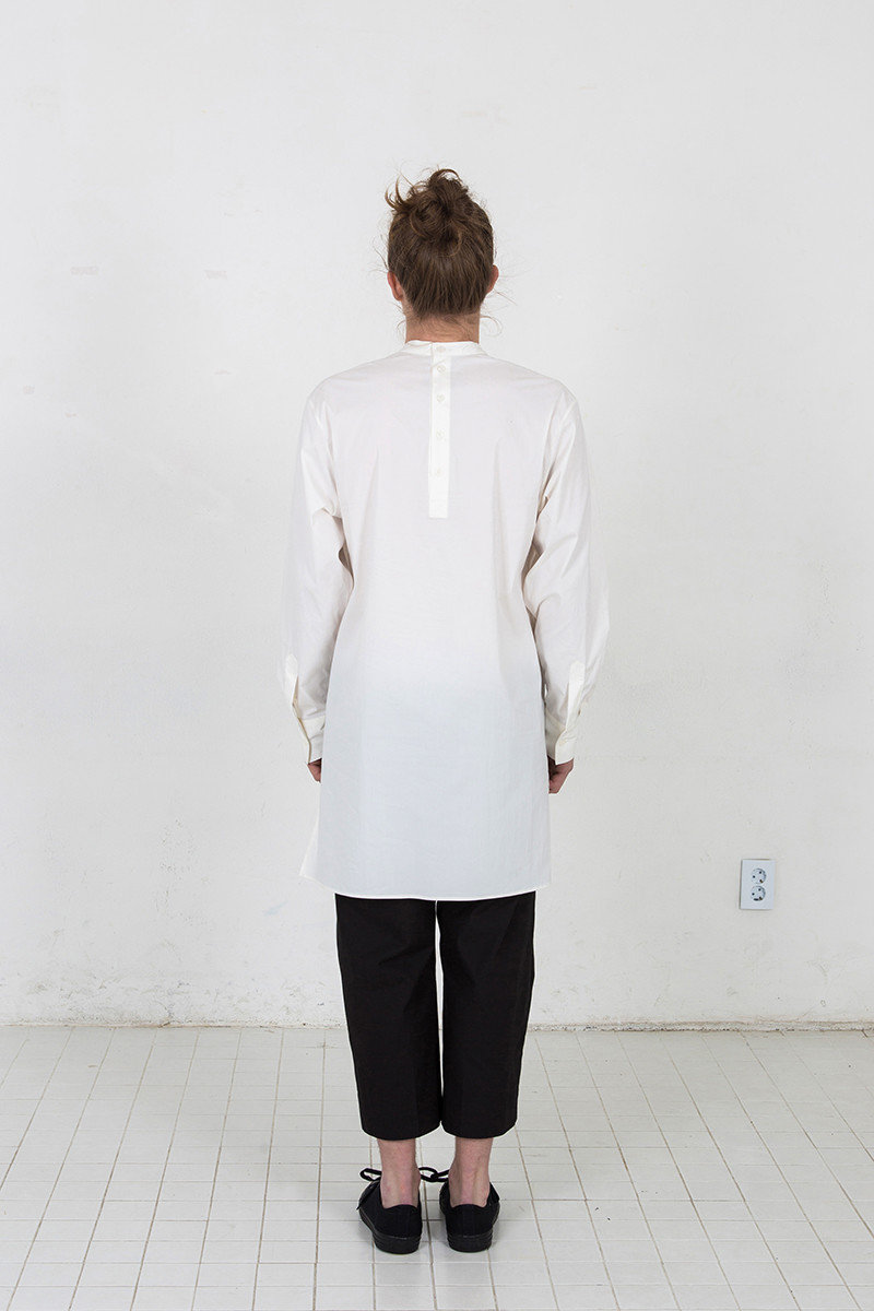 만다린 카라(카라가 없이 카라 스탠드만 있는 것을 mandarin collar합니다. 중국의 전통의상들에서 차용된 용어입니다)의 기장감이 긴 와이트 셔츠. 백 오프닝 방식. 왼쪽 가슴에 패치 포켓 디테일. 디자인적인 이유와 실용적인 이유를 동시에 고려한 옆 트임. 풀오버형식의 셔츠. 약간의 신축성이 있는 원단 사용. 4월에는 이너로, 5월에는 단품으로도 입기 좋은 제품.