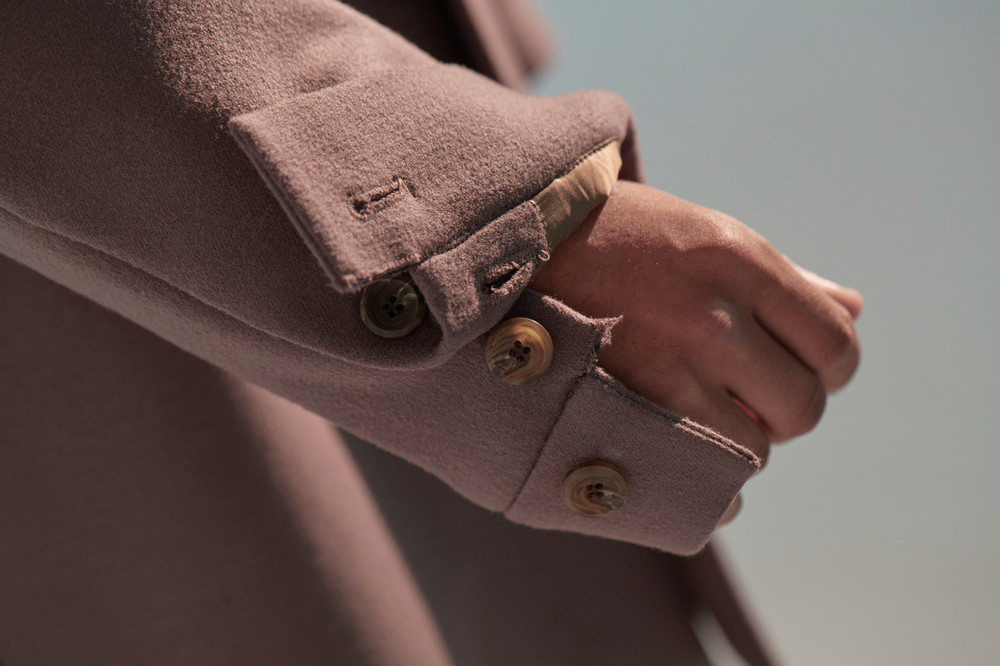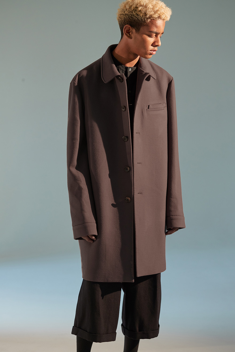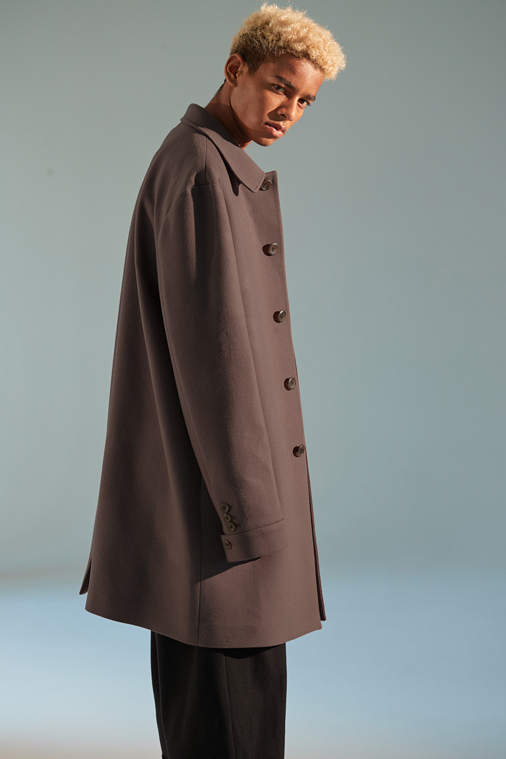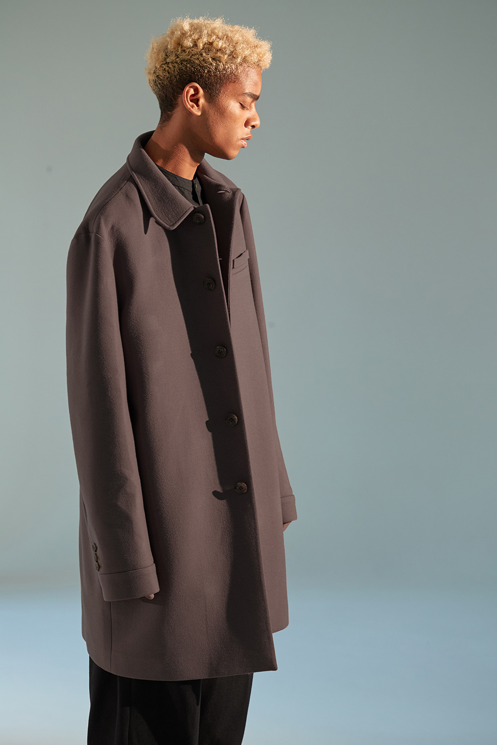 Slided Cuff Detailed Mac Coat 001 의 다른 칼라의 원단 버전. 두께감이 있어서 한겨울에도 따뜻하게 착용가능한 하프기장의 맥코트. 직선인 듯하면서도 커브를 그리는 카라 곡선.  제품 상세 사진 처럼 카라를 세워서 입는 것 역시 좋은 스타일링의 한 방법. H라인 실루엣으로 드롭 숄더 디자인은 아니지만 넉넉해 보이는 핏. aw18 시즌에 많은 상품에 디자인 디테일로 사용된 slided welt pocket이 왼쪽 가슴에 사용. 소매 하단에 절개를 줘서 셔츠의 커프처럼 보이게 한 것 역시 디자인 포인트(이 커프 부분과 웰트포켓에는 raw edge 피니싱이 들어가 있습니다. 따라서 입을수록 올이 풀리는 것은 자연스러운 현상이며 이러한 러프한 느낌을 염두한 디자인임을 미리 고지하여 드립니다. 자세한 사항은 사진을 참고 하시기 바랍니다). 양쪽 모두 안주머니. 고급 너트 단추 사용. In-seam 포켓.