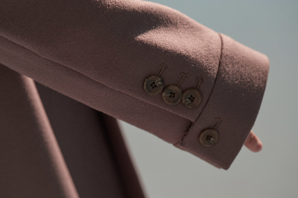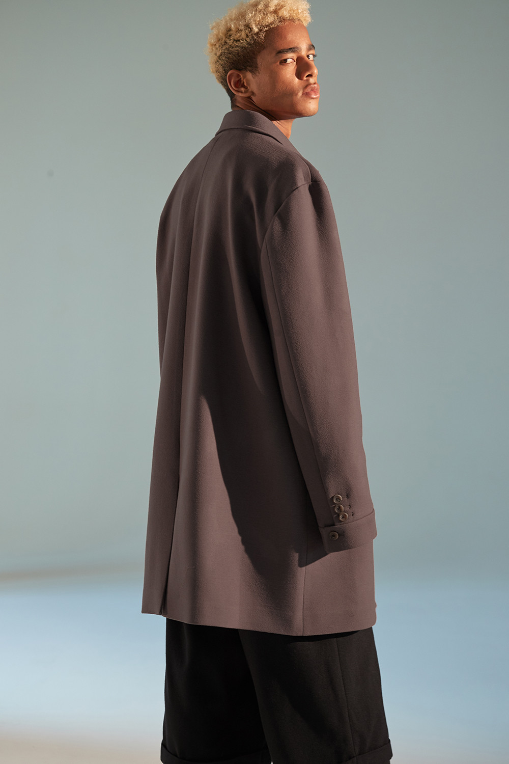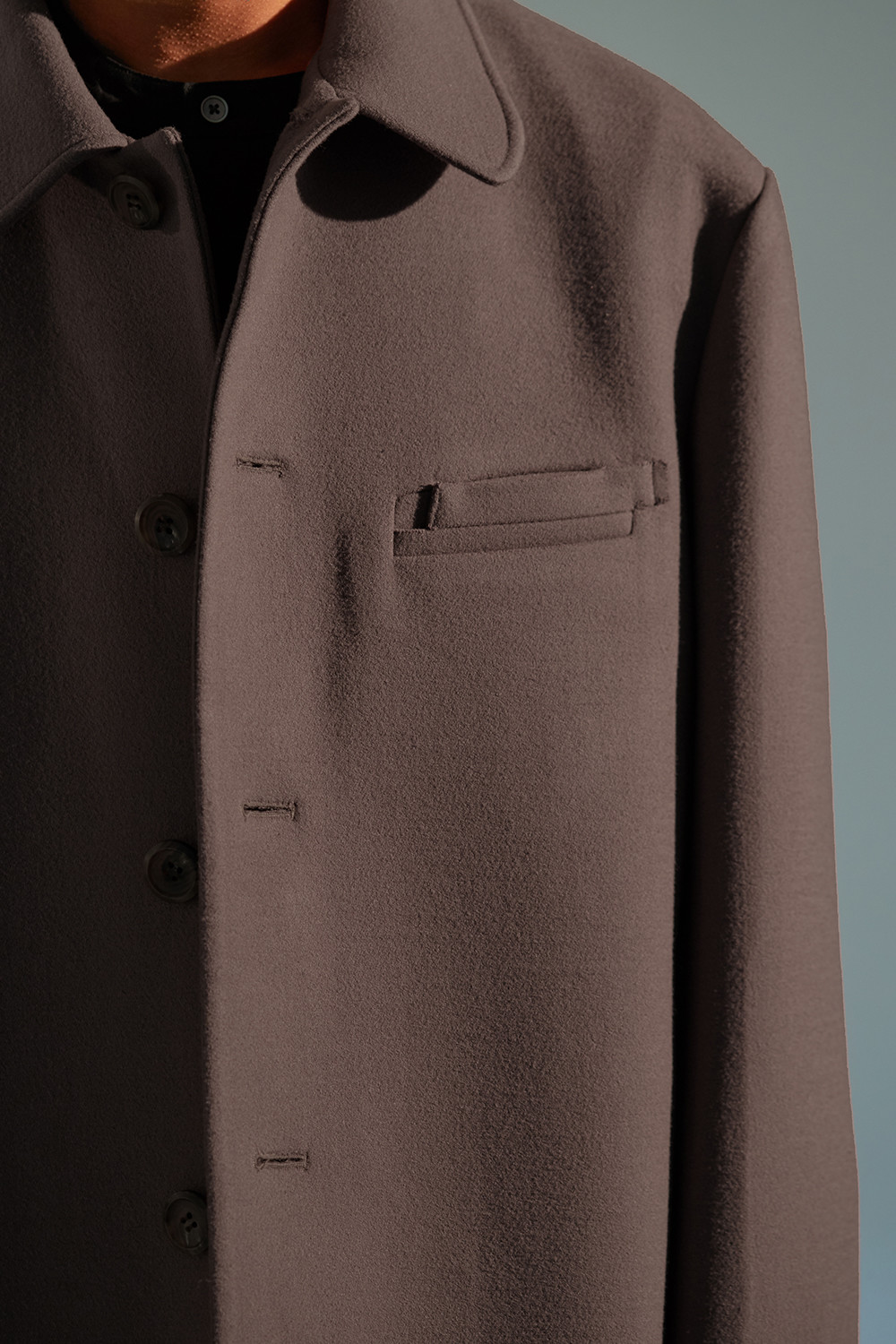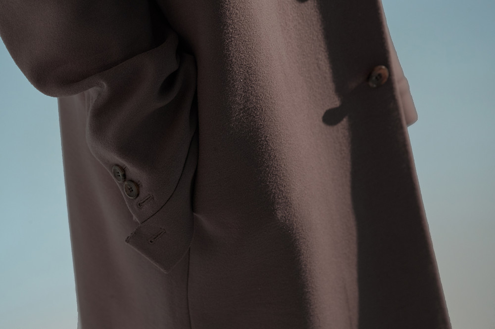 Slided Cuff Detailed Mac Coat 001 의 다른 칼라의 원단 버전. 두께감이 있어서 한겨울에도 따뜻하게 착용가능한 하프기장의 맥코트. 직선인 듯하면서도 커브를 그리는 카라 곡선.  제품 상세 사진 처럼 카라를 세워서 입는 것 역시 좋은 스타일링의 한 방법. H라인 실루엣으로 드롭 숄더 디자인은 아니지만 넉넉해 보이는 핏. aw18 시즌에 많은 상품에 디자인 디테일로 사용된 slided welt pocket이 왼쪽 가슴에 사용. 소매 하단에 절개를 줘서 셔츠의 커프처럼 보이게 한 것 역시 디자인 포인트(이 커프 부분과 웰트포켓에는 raw edge 피니싱이 들어가 있습니다. 따라서 입을수록 올이 풀리는 것은 자연스러운 현상이며 이러한 러프한 느낌을 염두한 디자인임을 미리 고지하여 드립니다. 자세한 사항은 사진을 참고 하시기 바랍니다). 양쪽 모두 안주머니. 고급 너트 단추 사용. In-seam 포켓.