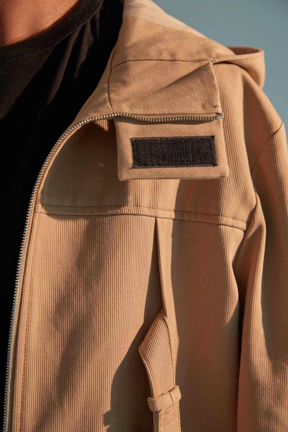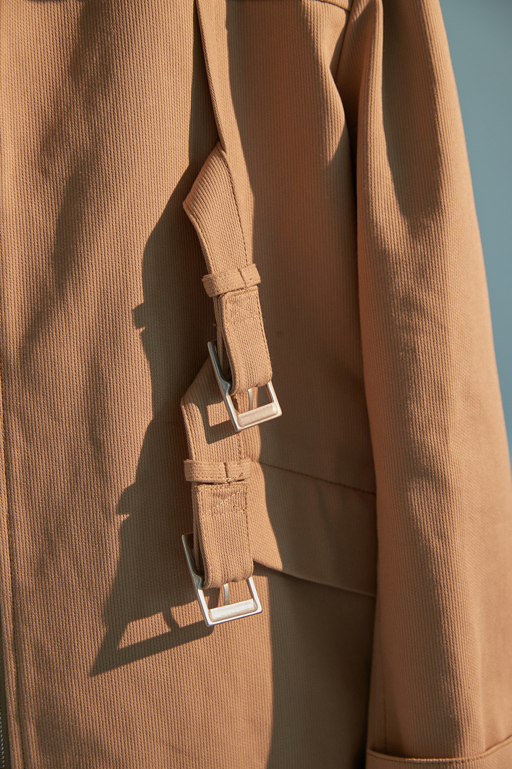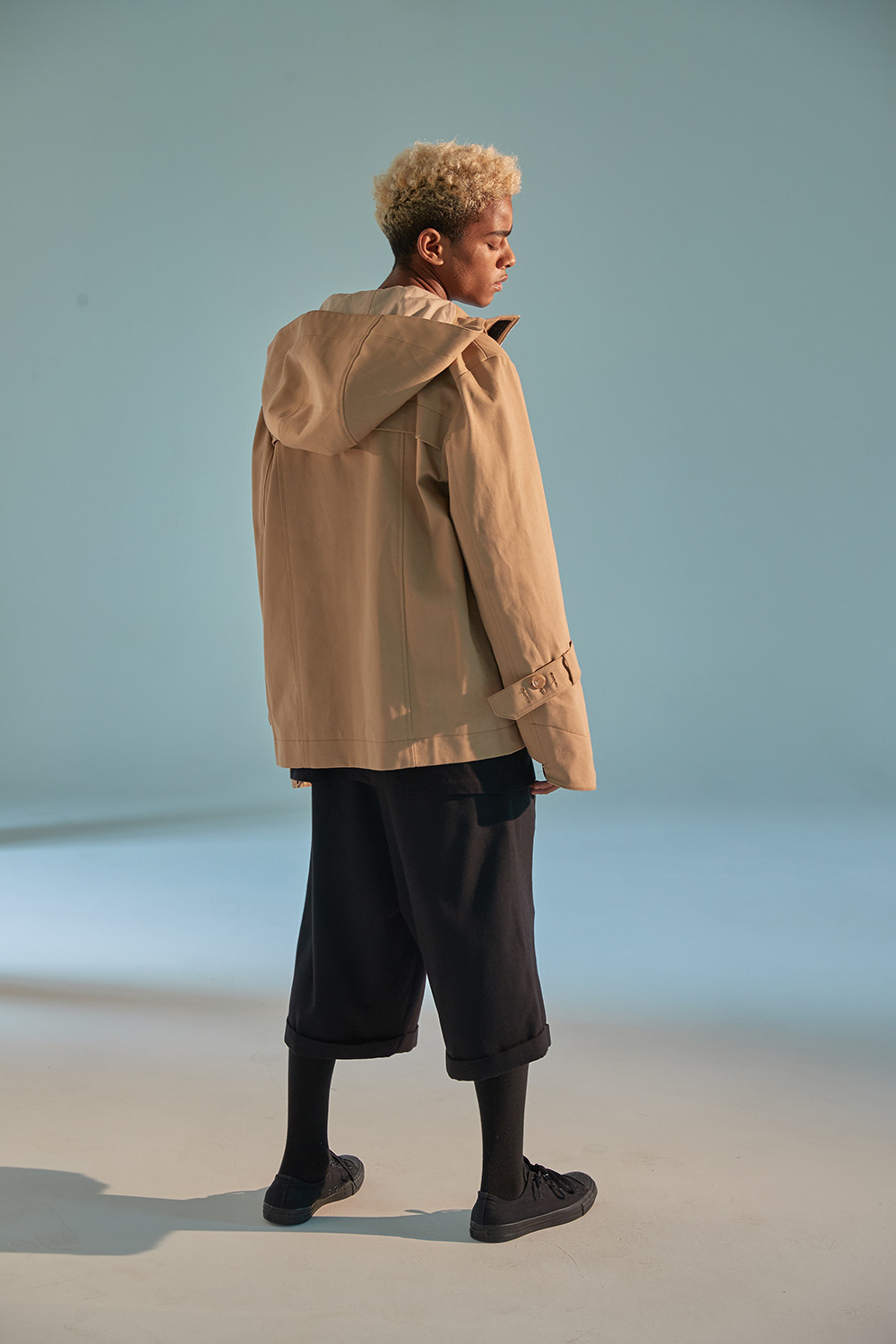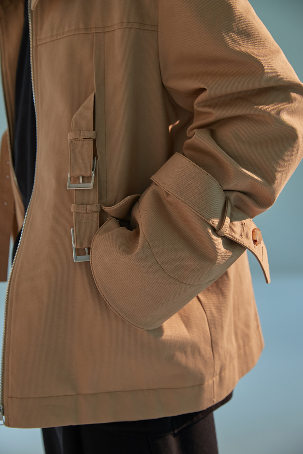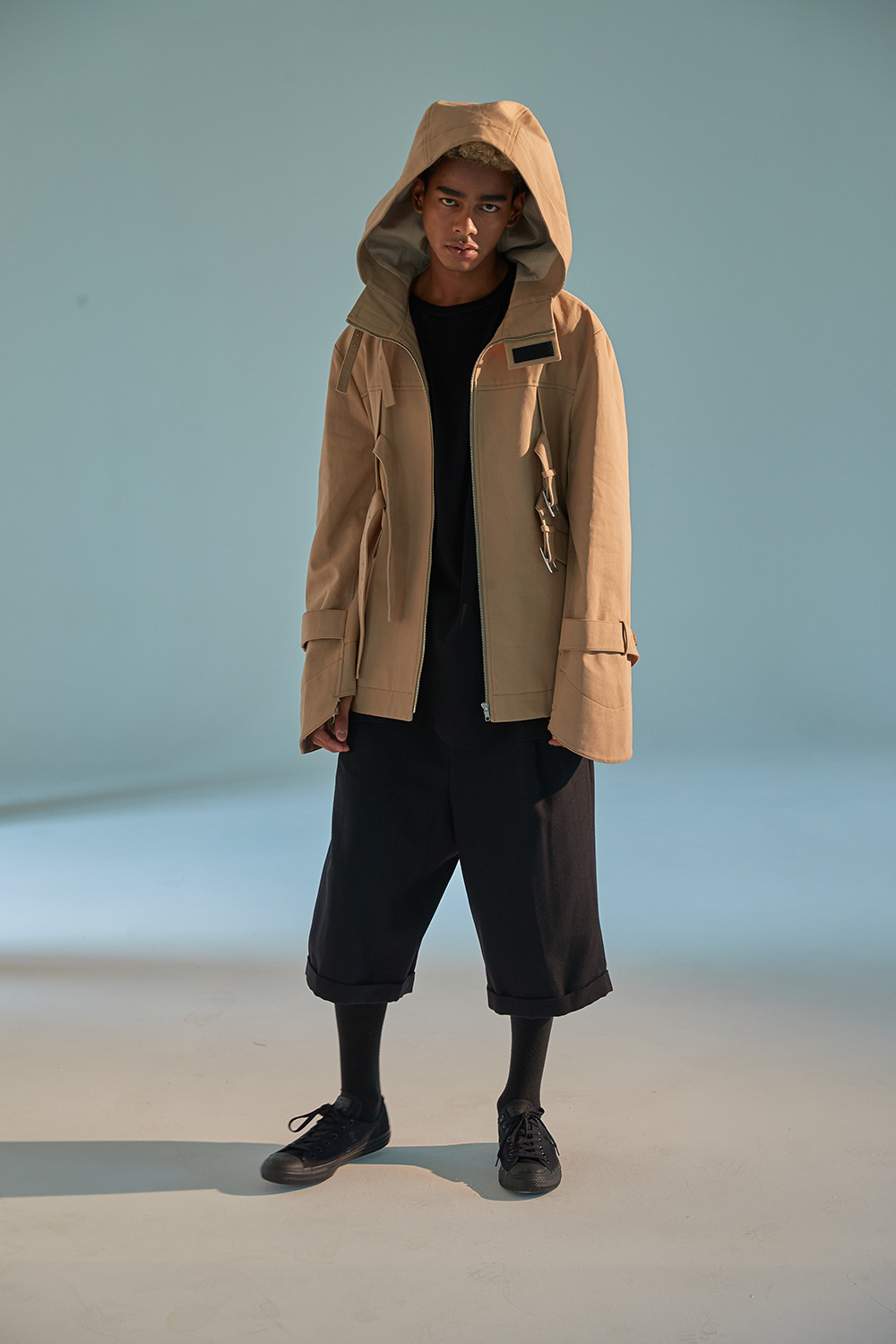 100% cotton 일본 수입 원단 사용. 원단이 뻣뻣하여 옷의 형태를 많이 살려줌. esopie의 시그니쳐 디자인인 소매 curve가 인상적. 소매의 햄라인이 중간에 층이 지도록 끊겨있고 이 층진 단면은 raw edge로 피니싱하였기 때문에 시간이 감에 따라 올이 자연스럽게 풀리는 러프한 매력을 갖게 됨. 후드 잠금 부분과 가슴에는 니켈 도금된 버클과 스트랩이 달려서 다양하게 스타일링이 가능. esopie의 시그니쳐 디테일 디자인인 사다리꼴 모양의 손목 스트랩. 왼쪽 지퍼 안주머니.