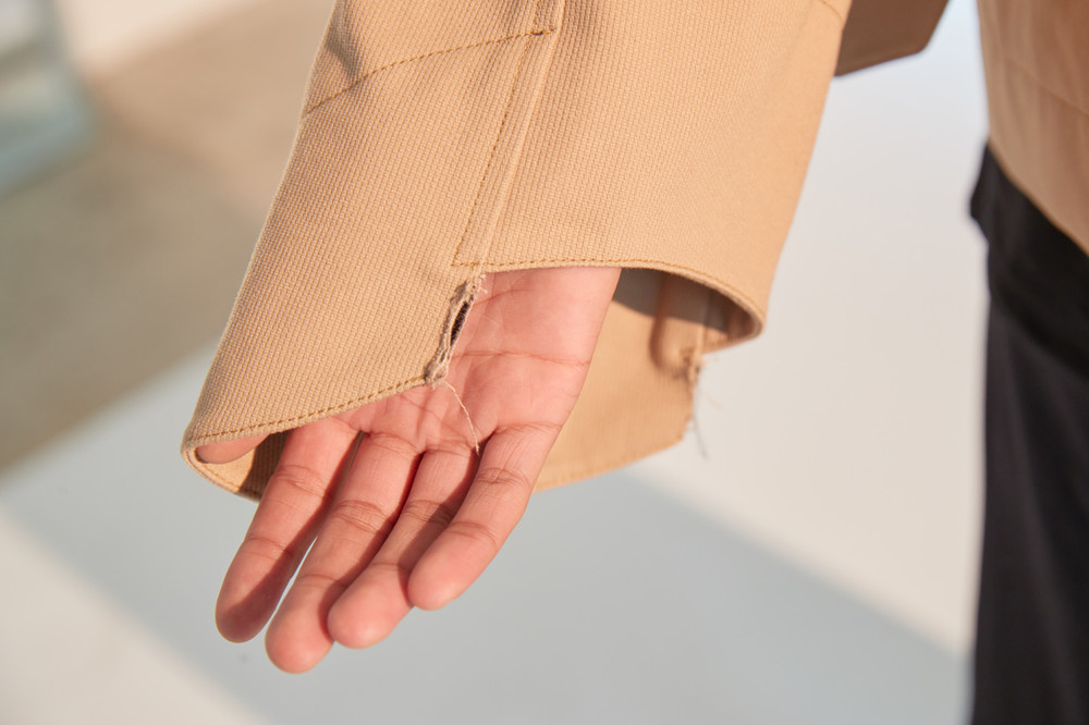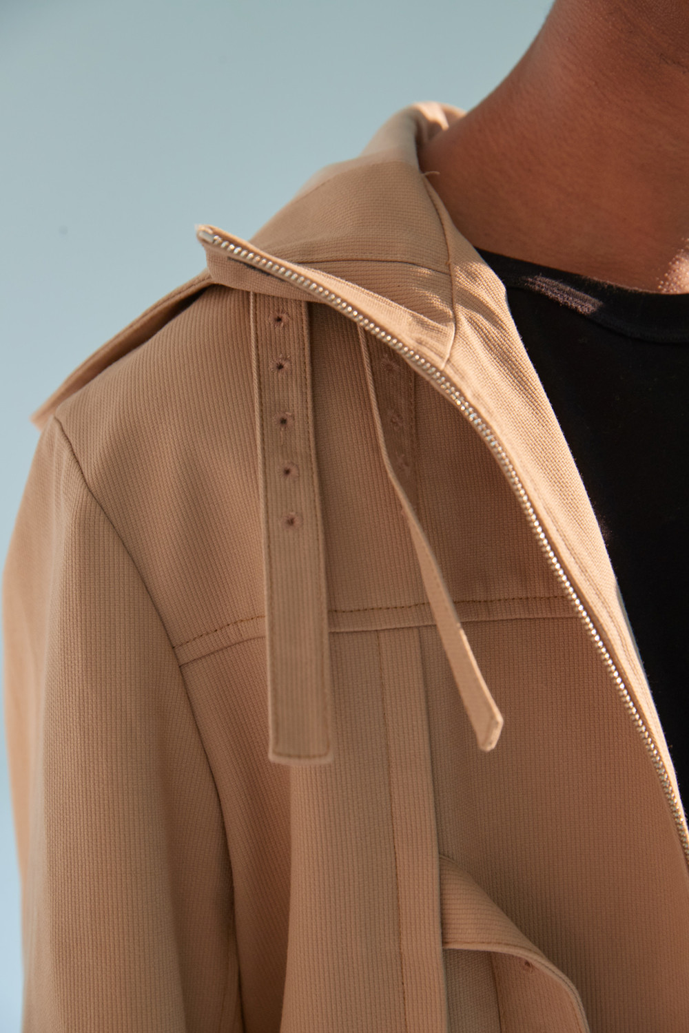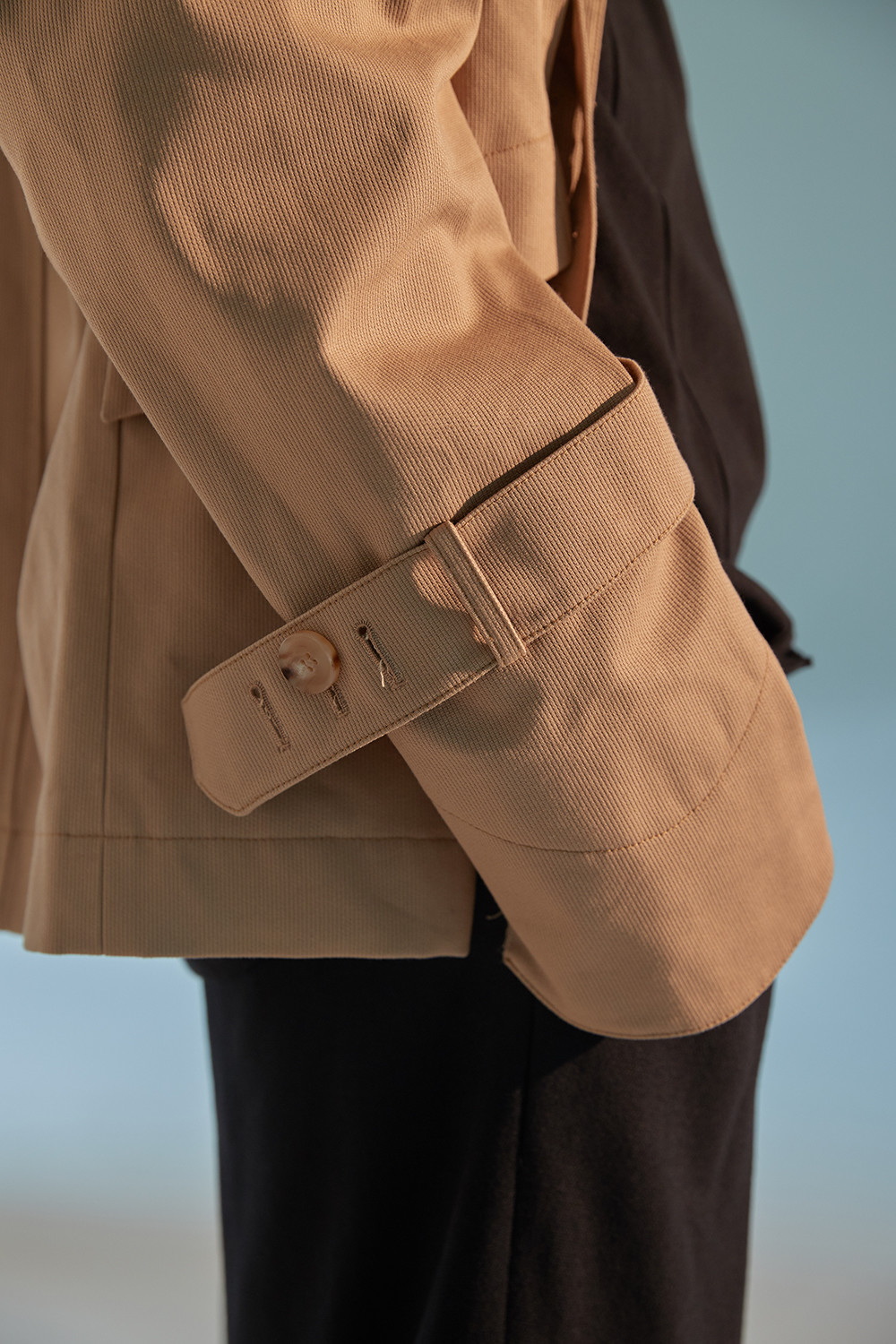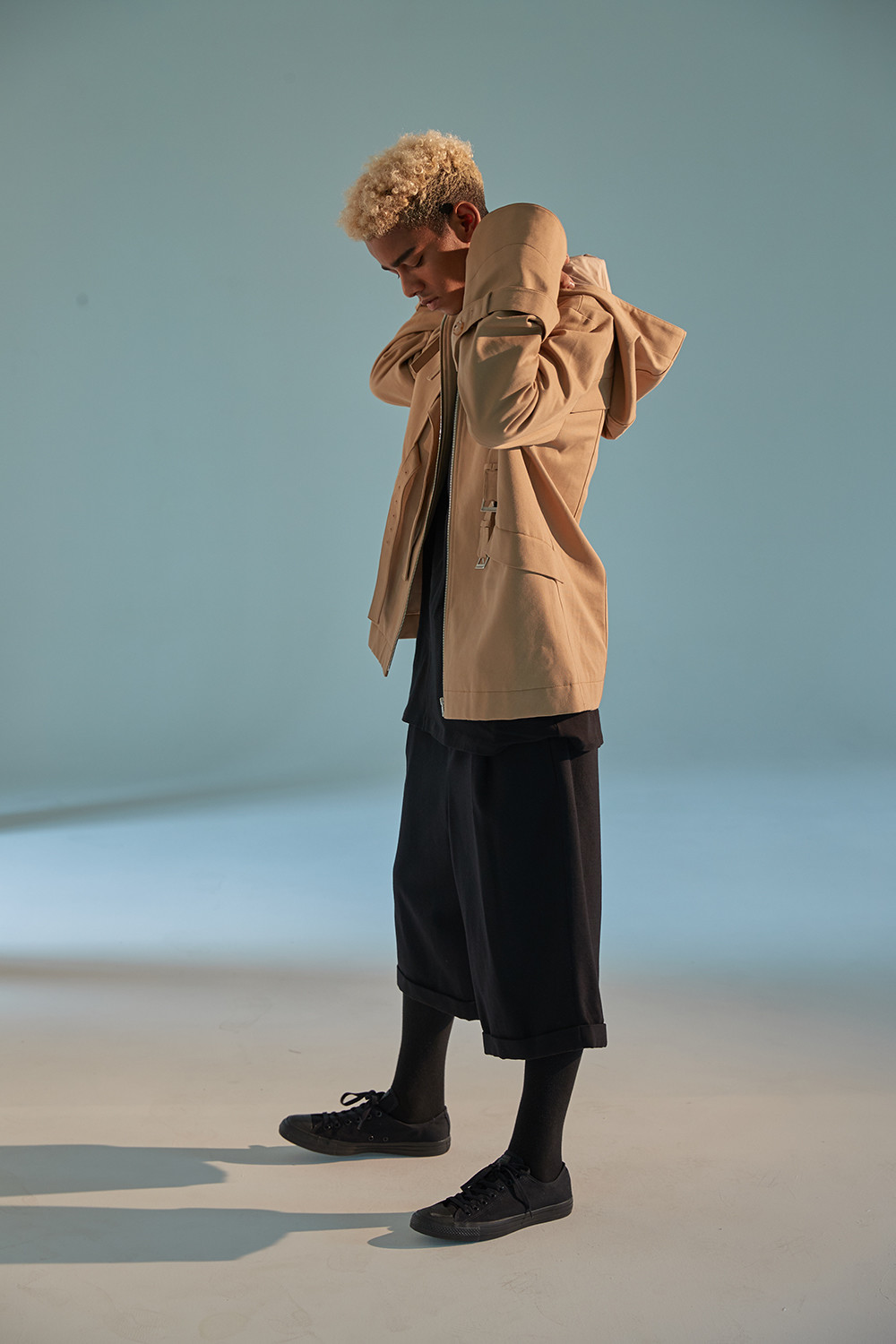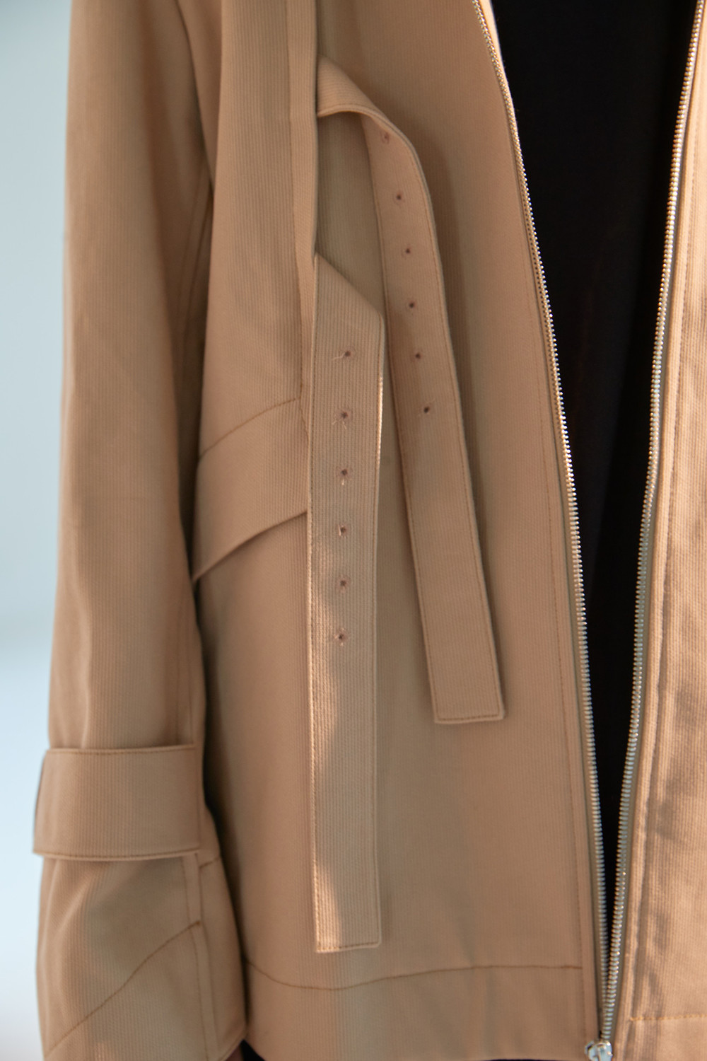 100% cotton 일본 수입 원단 사용. 원단이 뻣뻣하여 옷의 형태를 많이 살려줌. esopie의 시그니쳐 디자인인 소매 curve가 인상적. 소매의 햄라인이 중간에 층이 지도록 끊겨있고 이 층진 단면은 raw edge로 피니싱하였기 때문에 시간이 감에 따라 올이 자연스럽게 풀리는 러프한 매력을 갖게 됨. 후드 잠금 부분과 가슴에는 니켈 도금된 버클과 스트랩이 달려서 다양하게 스타일링이 가능. esopie의 시그니쳐 디테일 디자인인 사다리꼴 모양의 손목 스트랩. 왼쪽 지퍼 안주머니.