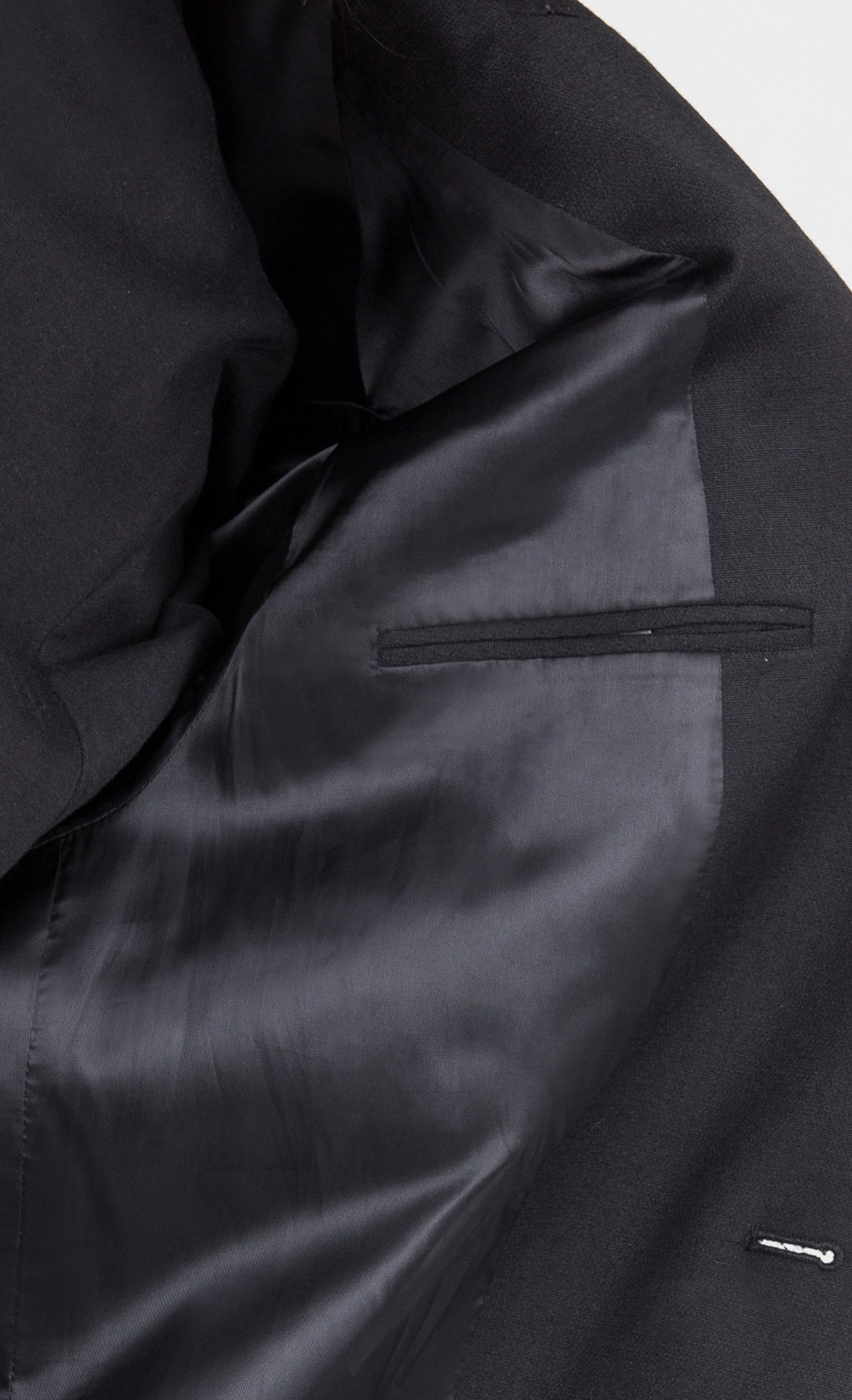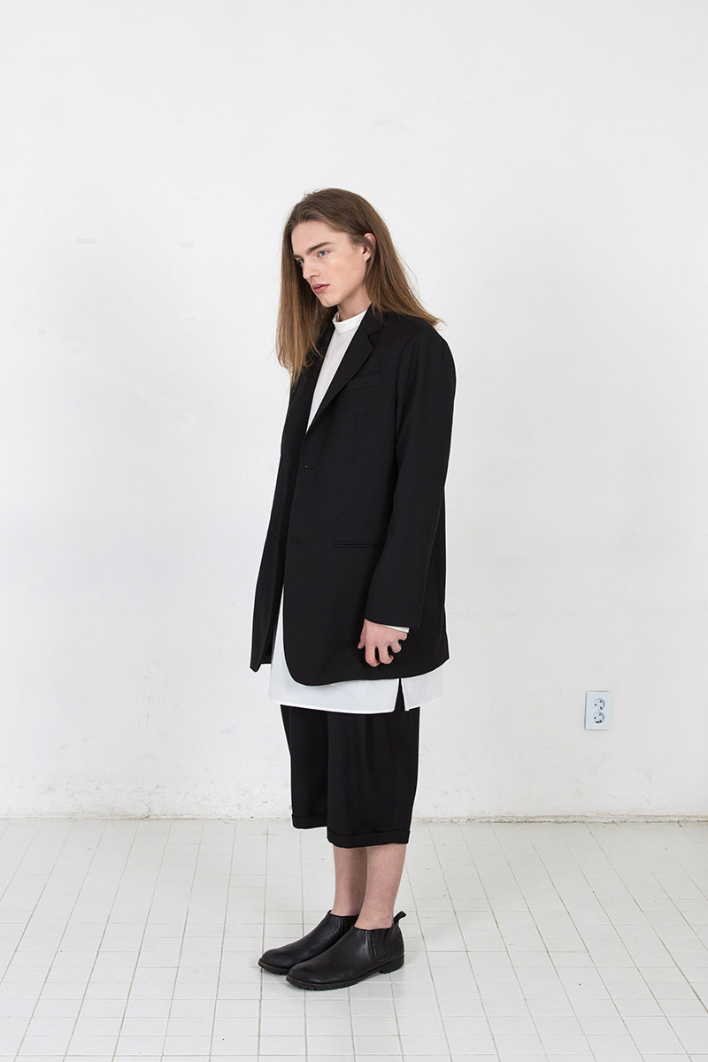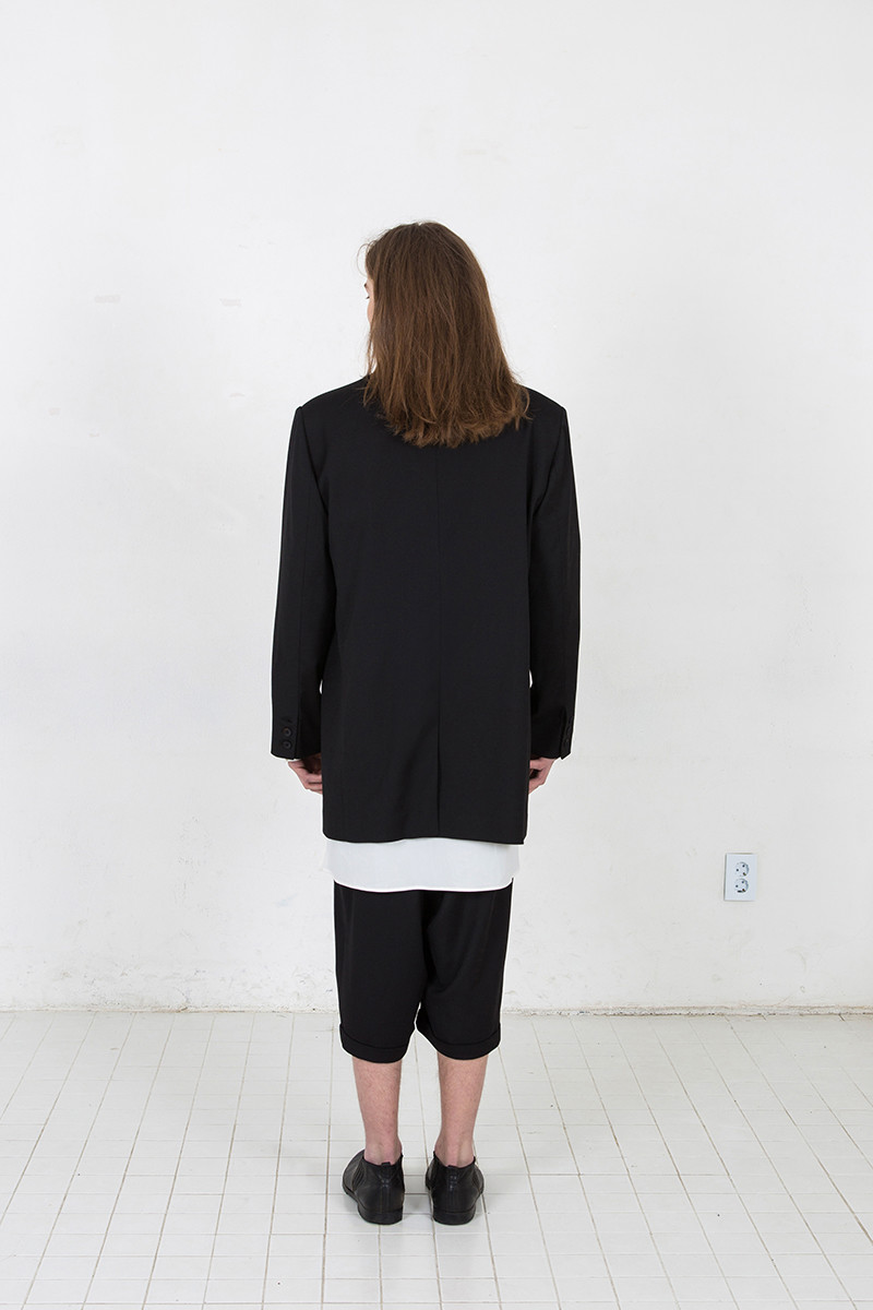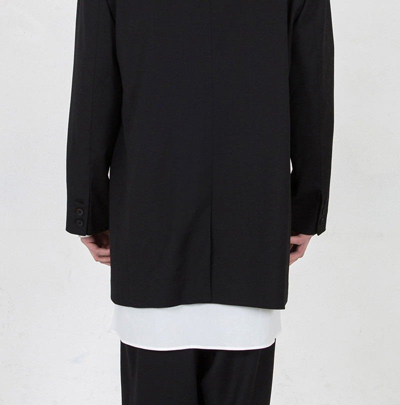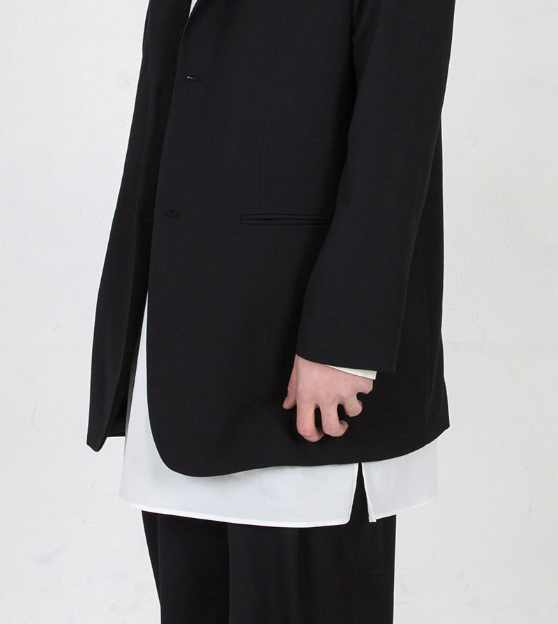 루즈하면서 직선적인 실루엣의 2버튼 자켓. 고급 폴리 원사의 원단과 소뿔단추 사용. 뒷판 가운데 트임. 봄철에 적합한 두께감. 왼쪽 가슴 안주머니. 일반적인 테일러 자켓보다는 기장감이 있음.