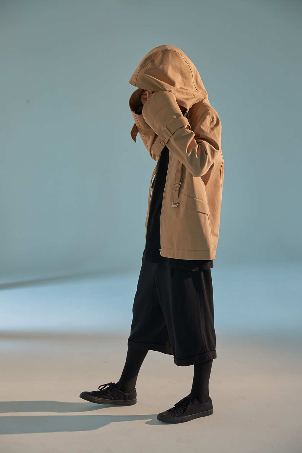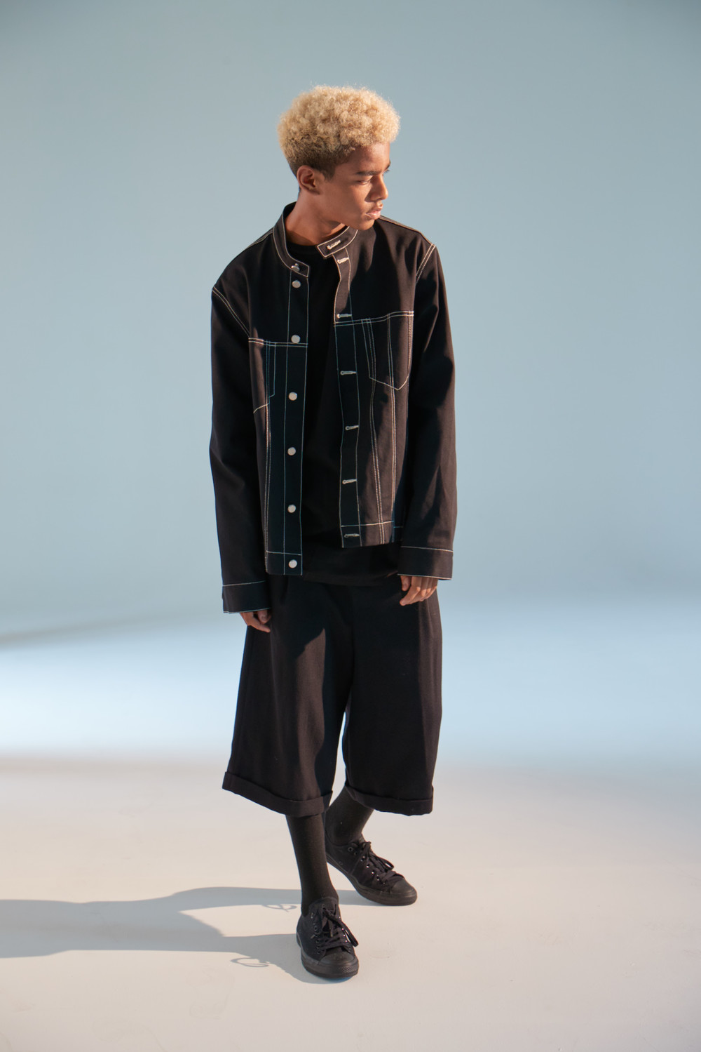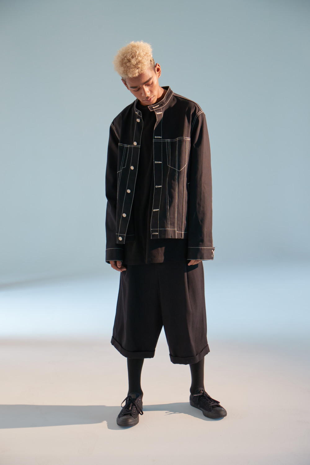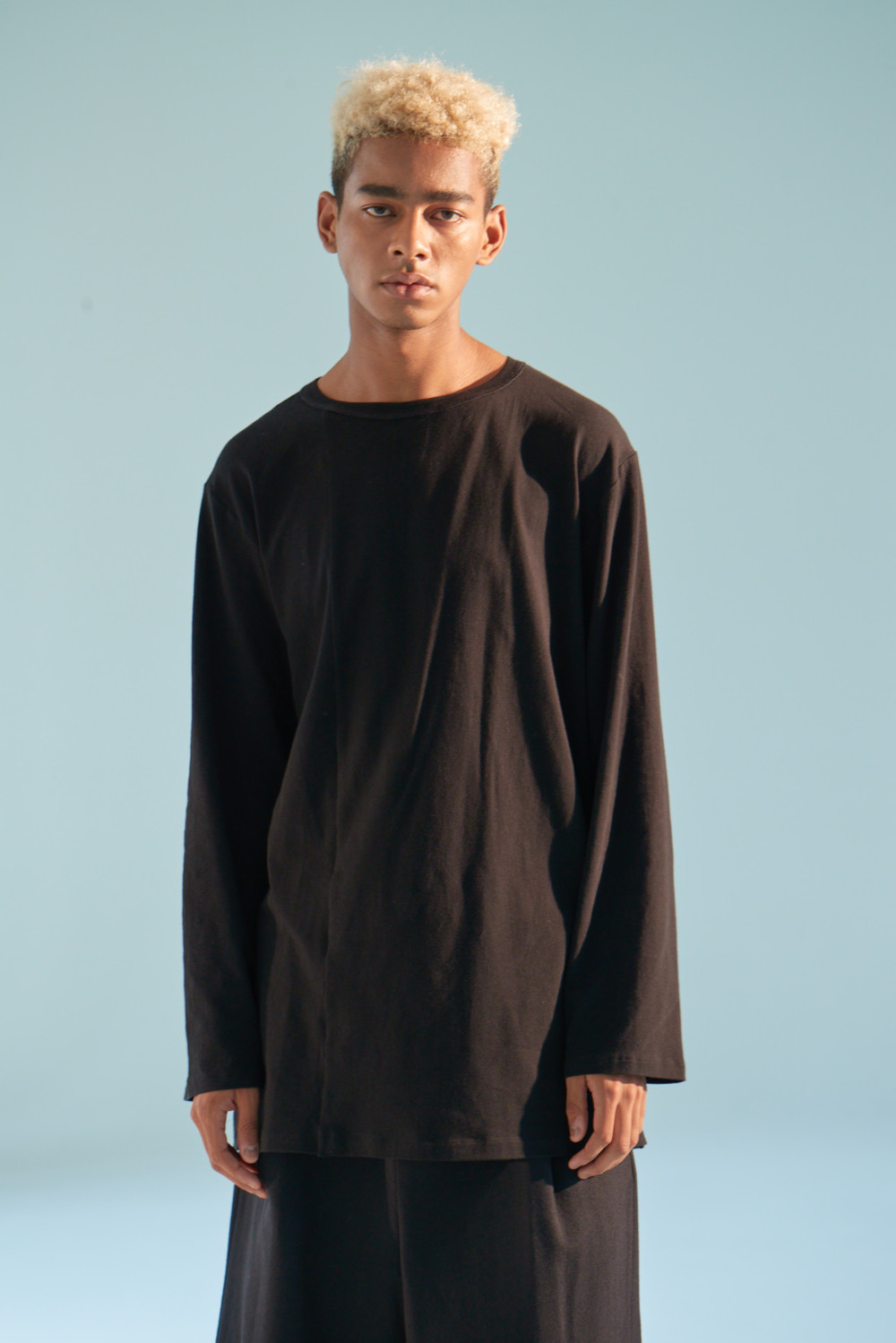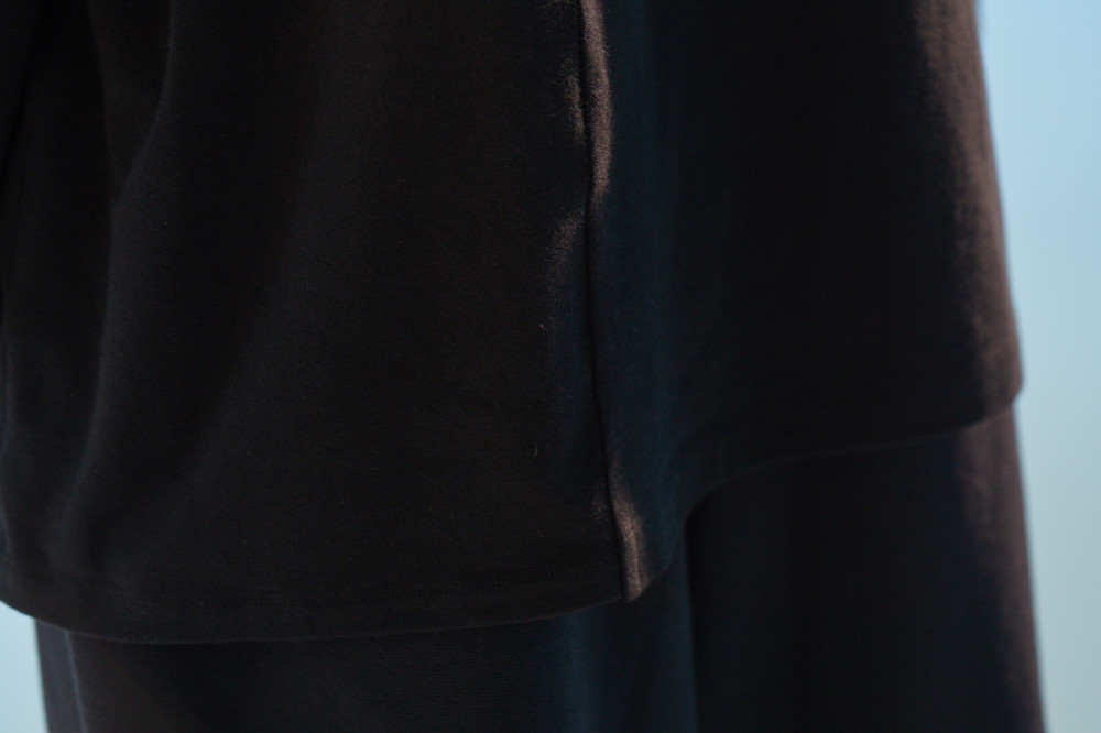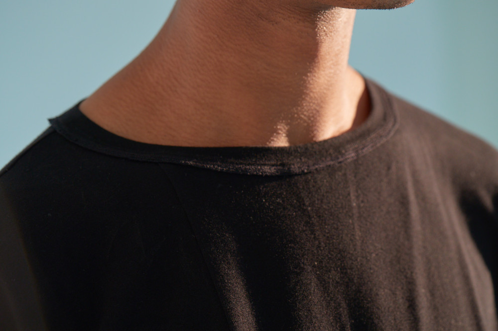 텐션이 많이 들어가 활동성이 좋은 40수 일본 저지 원단 사용. 높낮이가 다른 밑단 cover stitch. 일반적인 봉제방법을 반대로 하여 neck line의 overlock이 바깥으로 노출되도록 함. 앞 뒷판 절개.