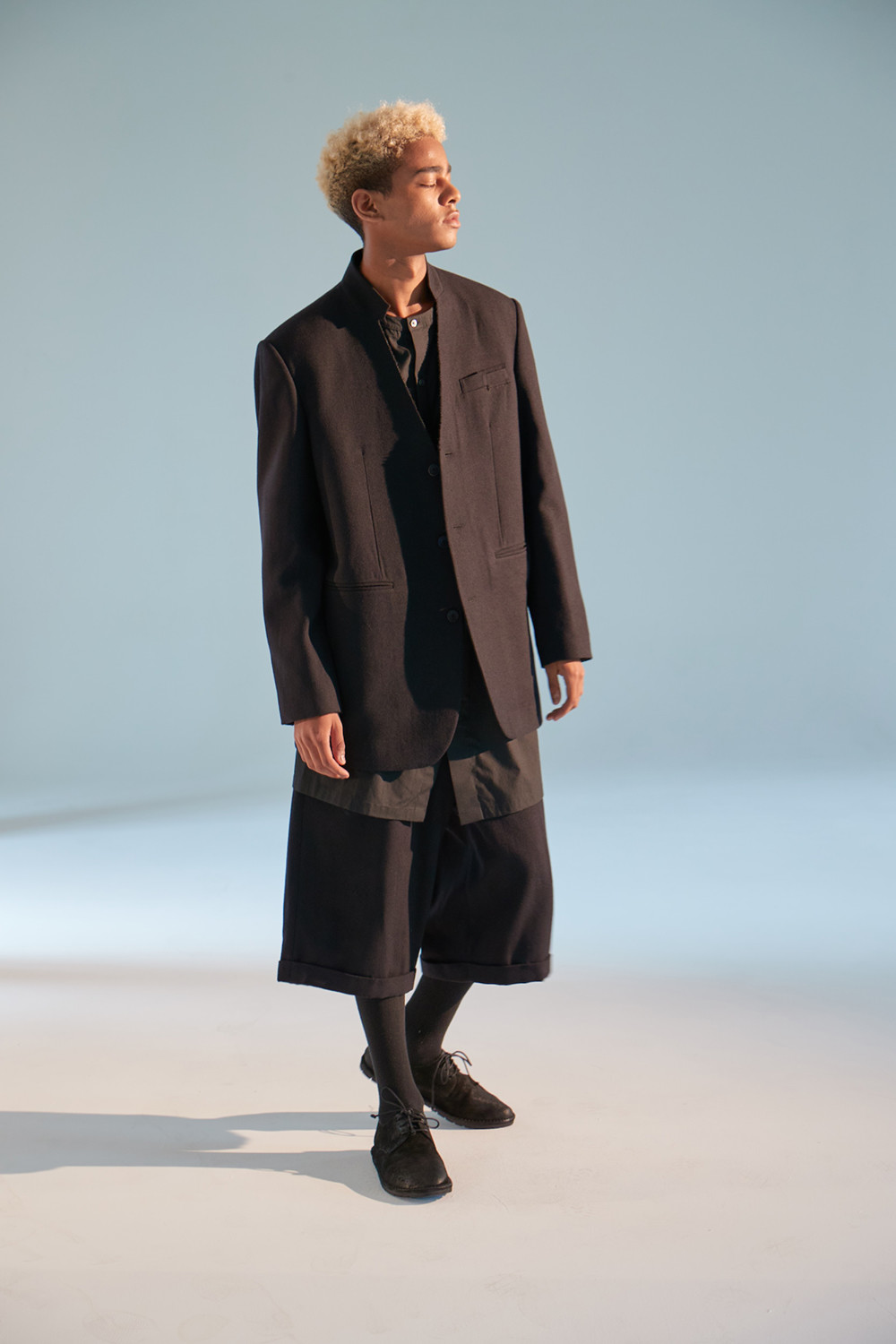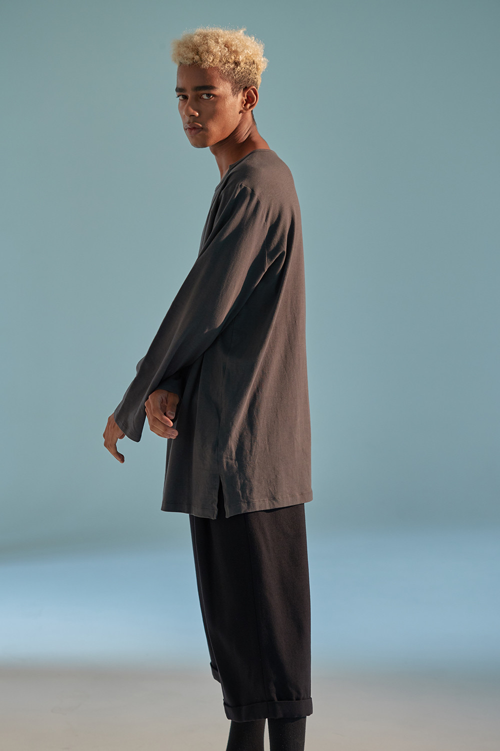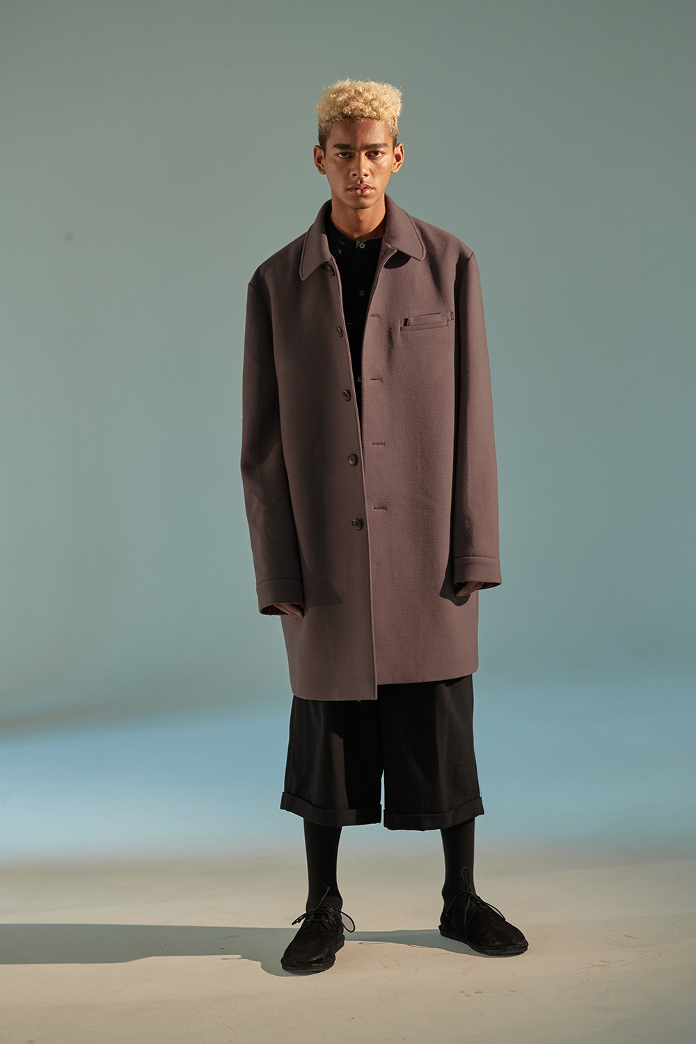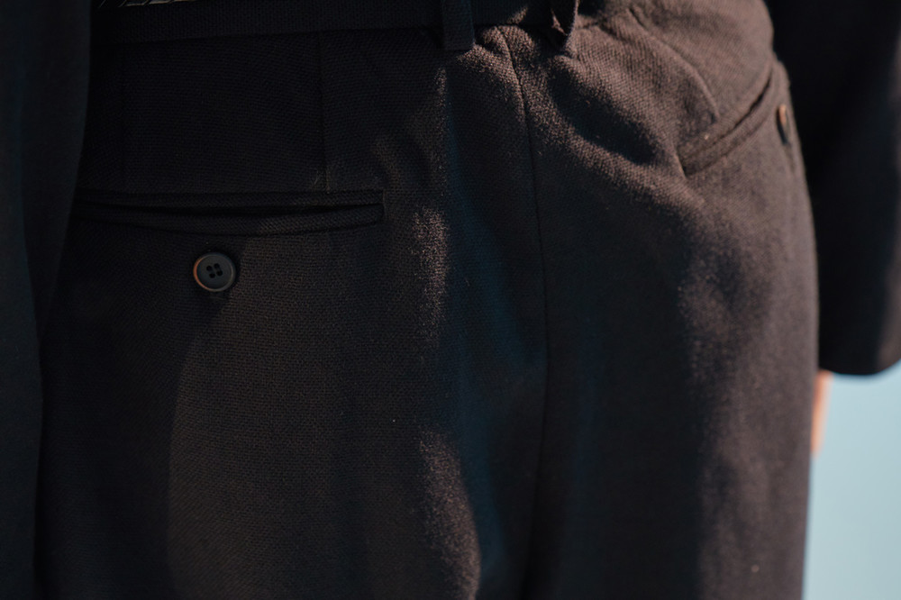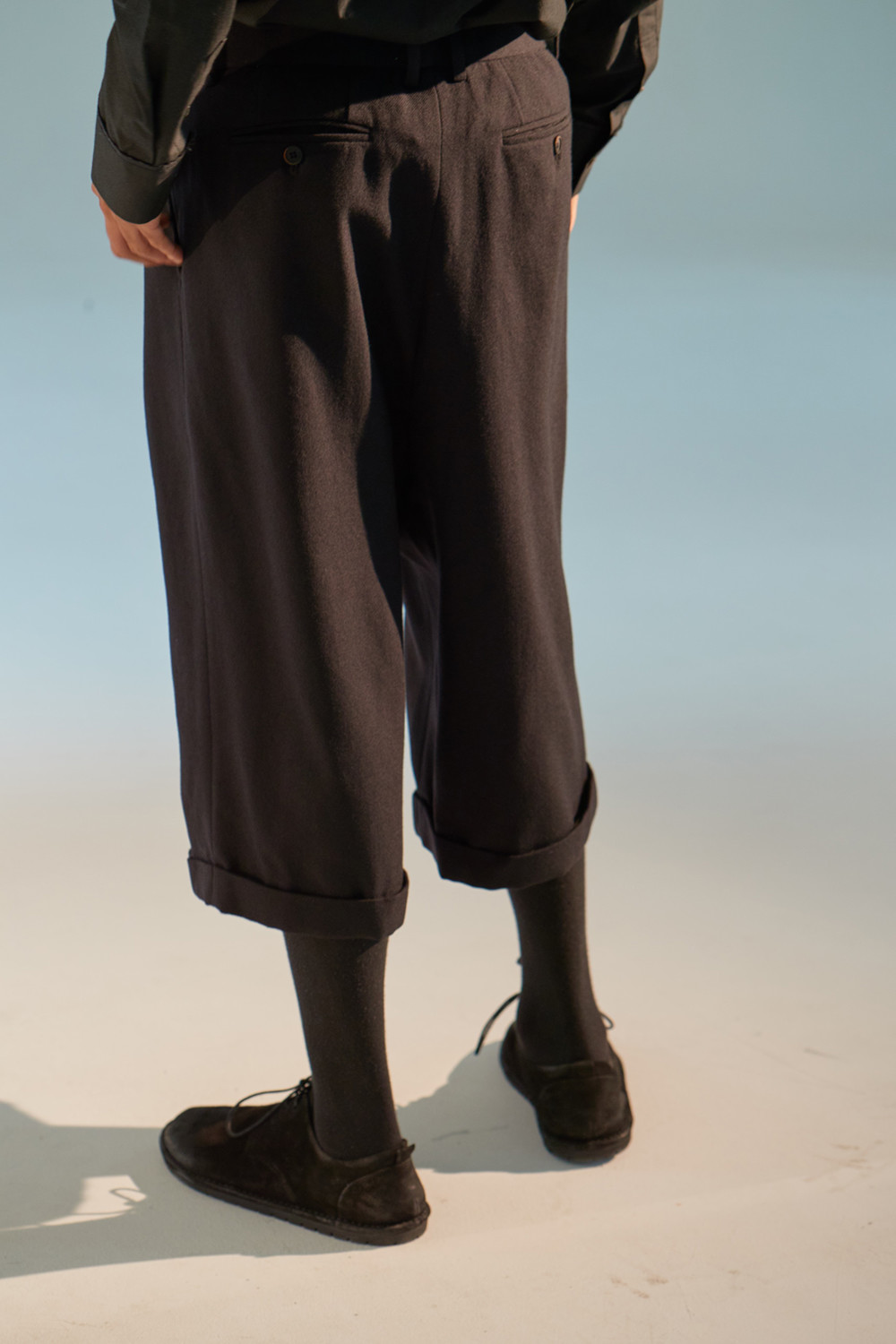 Lapelless Raw Edged 3 Button Jacket 001과 셋업으로 같이 스타일링된 바지. esopie가 첫시즌 때부터 꾸준히 선보이고 있는 와이드 핏의 H라인 바지. 100%울 원단 사용. 약간의 두께감이 있음. 고급 너츠 단추 사용. 고급스러운 더블 턴업 방식으로 밑단을 처리.