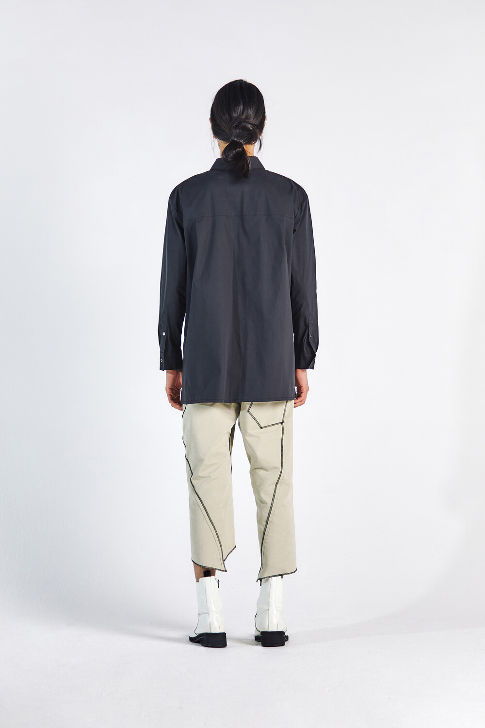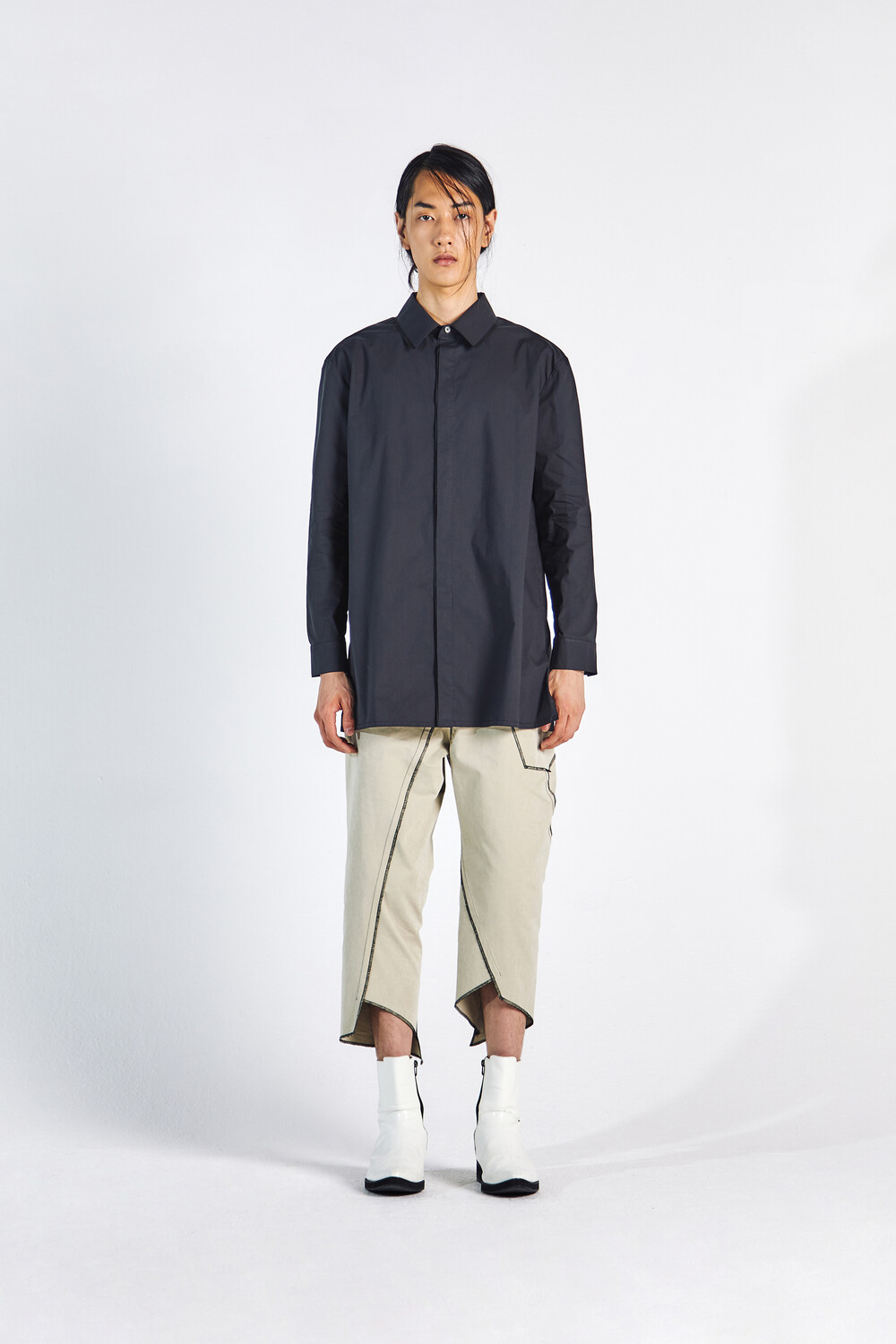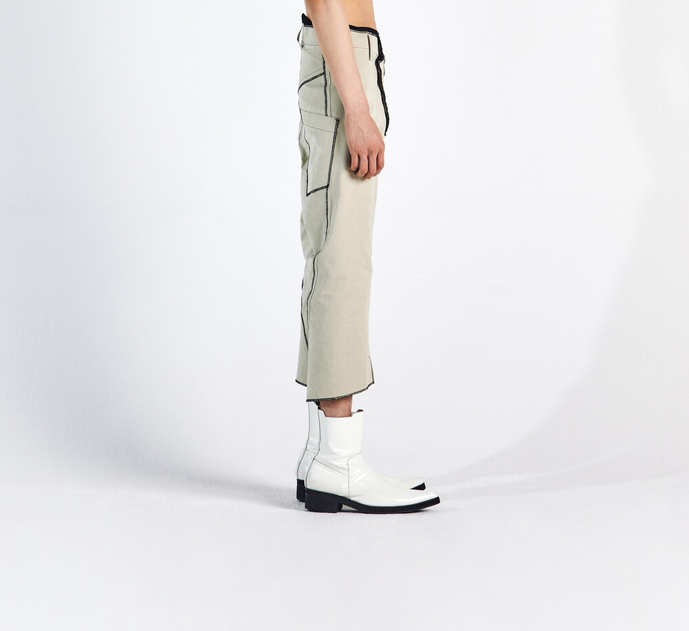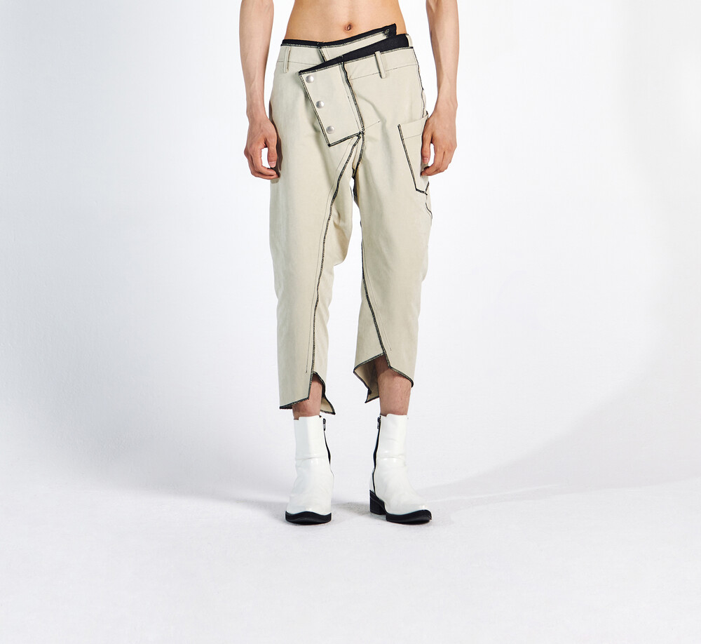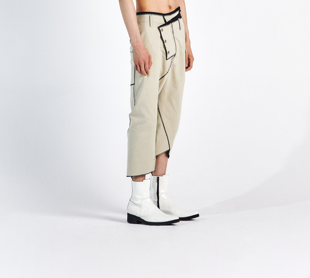 좌우가 완벽하게 비대칭인 디자인. 바지의 허리라인 따라 돌출된 심지 디테일이 있으며 스냅버튼 플라이가 인상적인 바지. 기본적으로 크롭된 기장이며 좌우 다리의 길이가 다름. 또한 오바로크 피니싱 디테일이 겉으로 노출되어 있음.