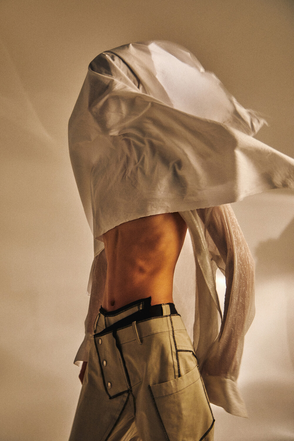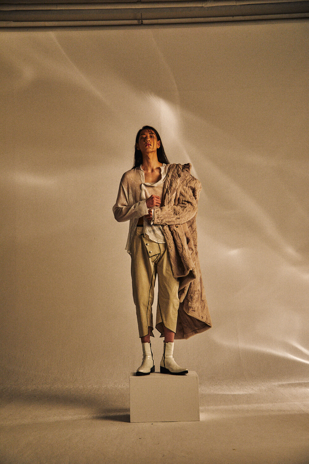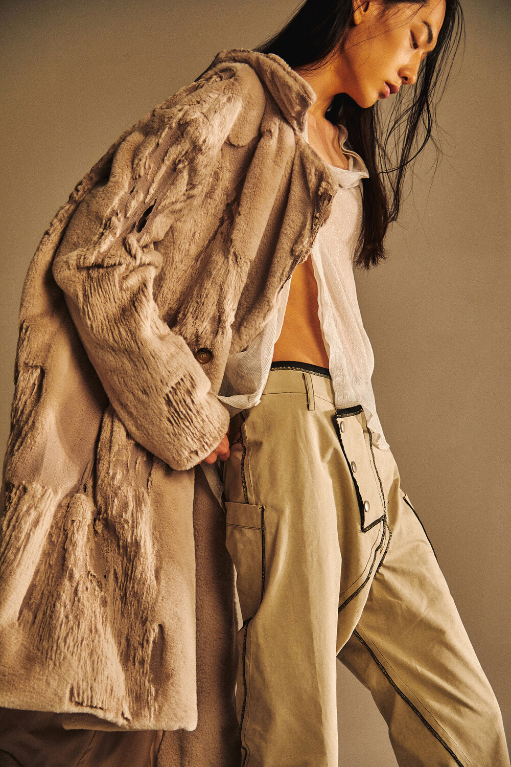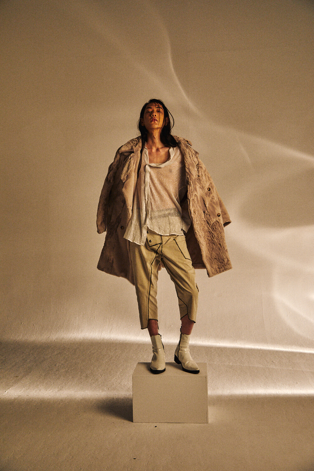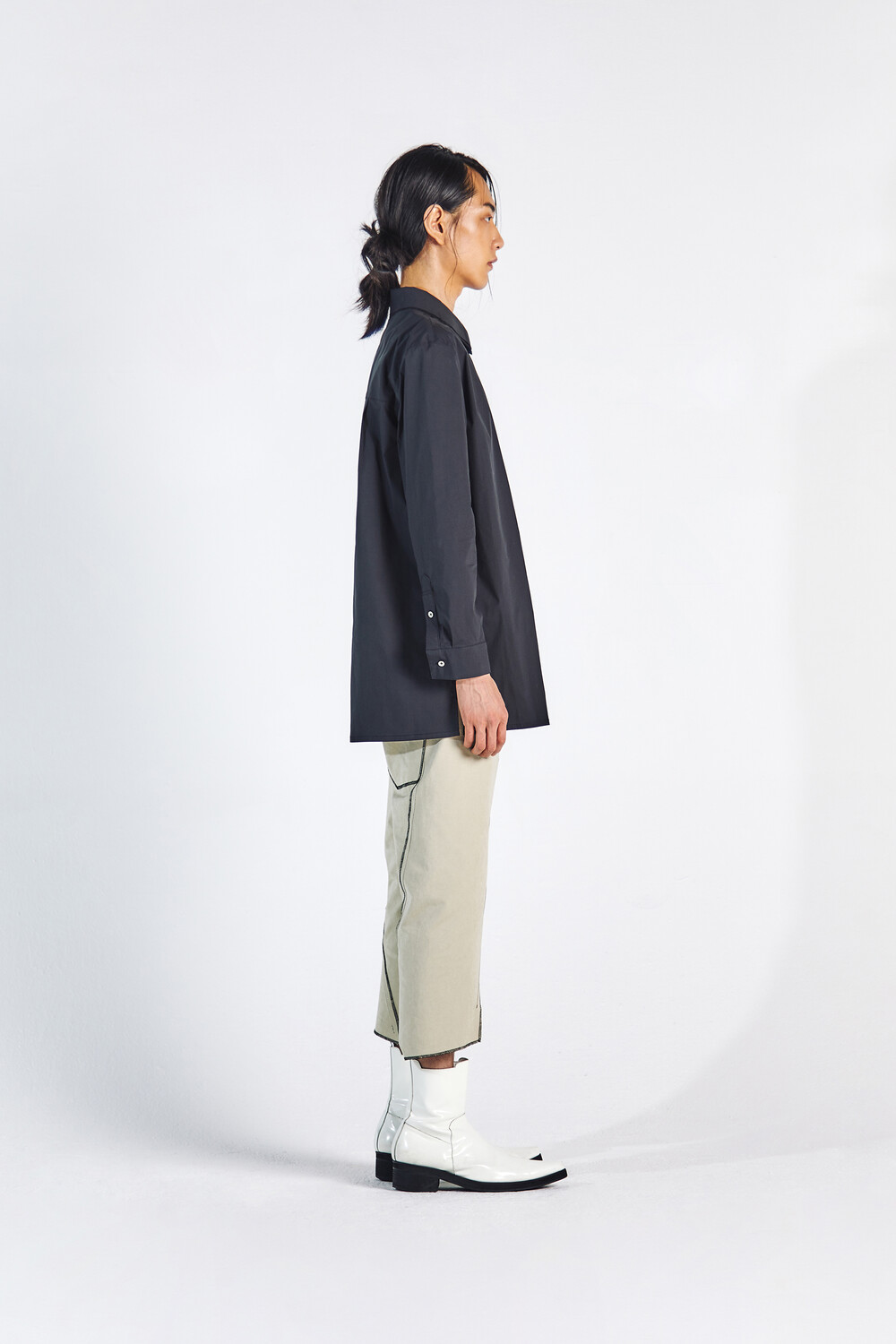 좌우가 완벽하게 비대칭인 디자인. 바지의 허리라인 따라 돌출된 심지 디테일이 있으며 스냅버튼 플라이가 인상적인 바지. 기본적으로 크롭된 기장이며 좌우 다리의 길이가 다름. 또한 오바로크 피니싱 디테일이 겉으로 노출되어 있음.