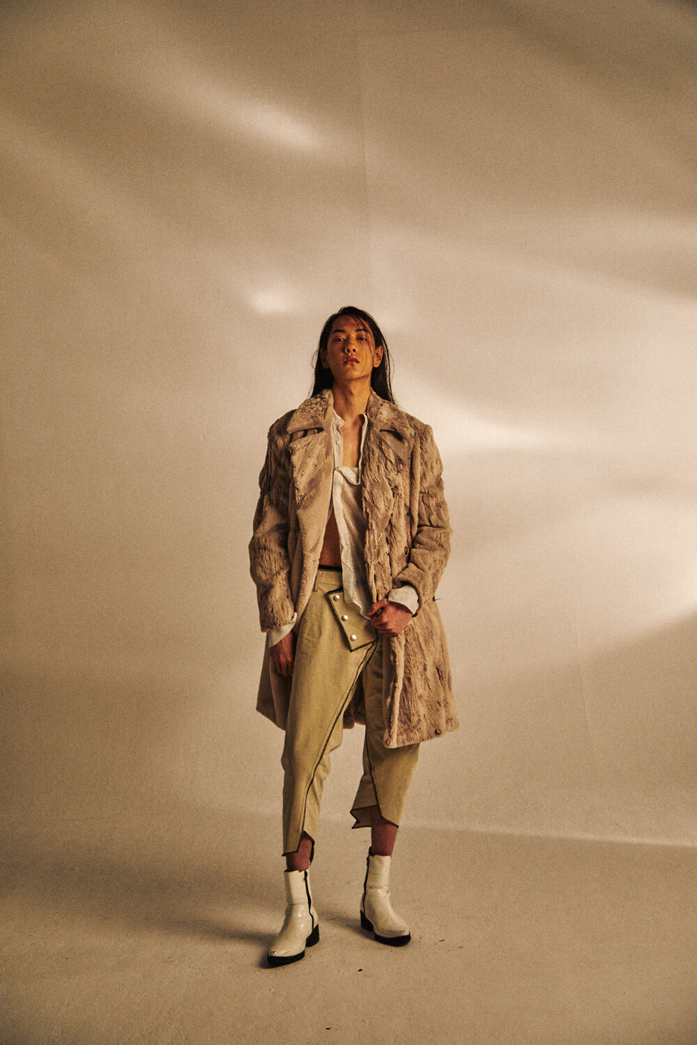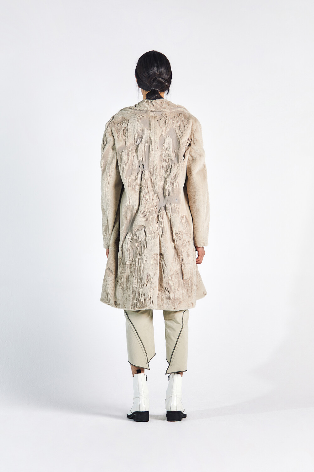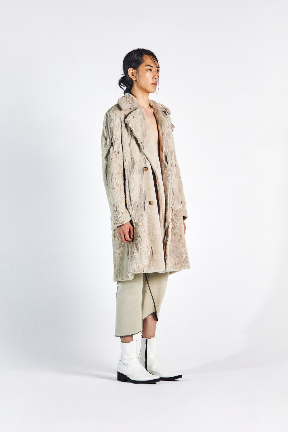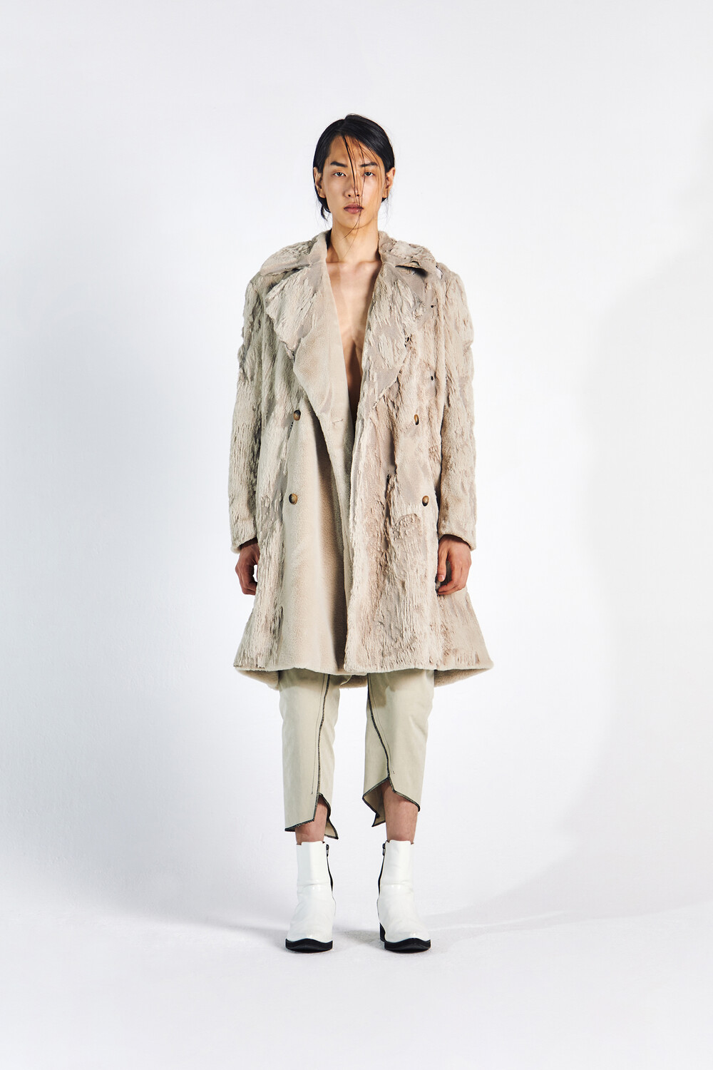 고급 fake fur 원단으로 제작된 제품으로 이번 aw20 시즌 컬렉션을 가장 컨셉츄얼하게 보여주는 아트웍 피스. 완성된 코트 위에 직접 디자이너가 알코올 농축액을 펴 바르는 수작업을 한 다음 화기에 노출시켜서 농축액이 발라진 길 따라 불이 옮겨 붙게 하는 방식으로 제작된 코트. 불에 녹은 부분과 녹지 않은 부분의 스트롱한 대비가 인상적인 제품. 모든 프로세스가 완료된 후 자연상태에서 3일 동안의 건조한 후에야 제품이 최종적으로 완성되는 손이 많이 가는 코트. (본 제품은 제작의도부터가 우연성에 의한 효과가 나타나도록 고안된 제품이기 때문에 모든 피스가 동일한 텍스쳐를 같지 않습니다. 구매 전 이 점을 꼭 유념해 주시기 바랍니다).