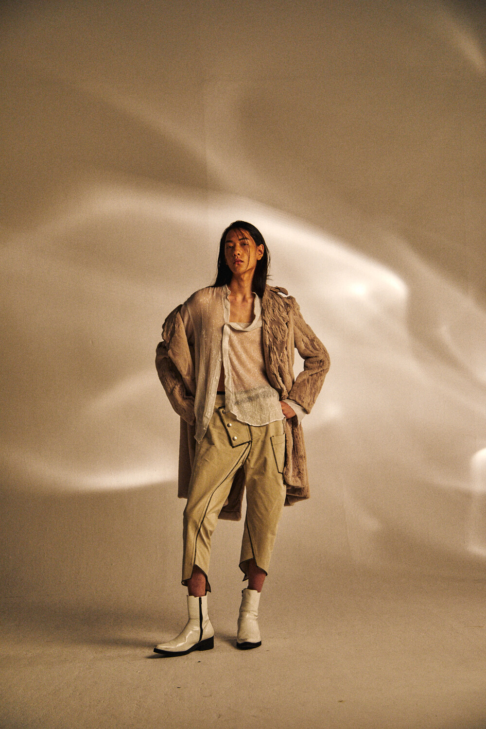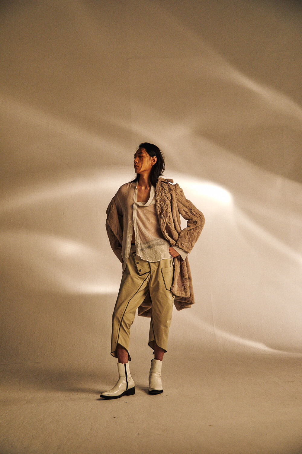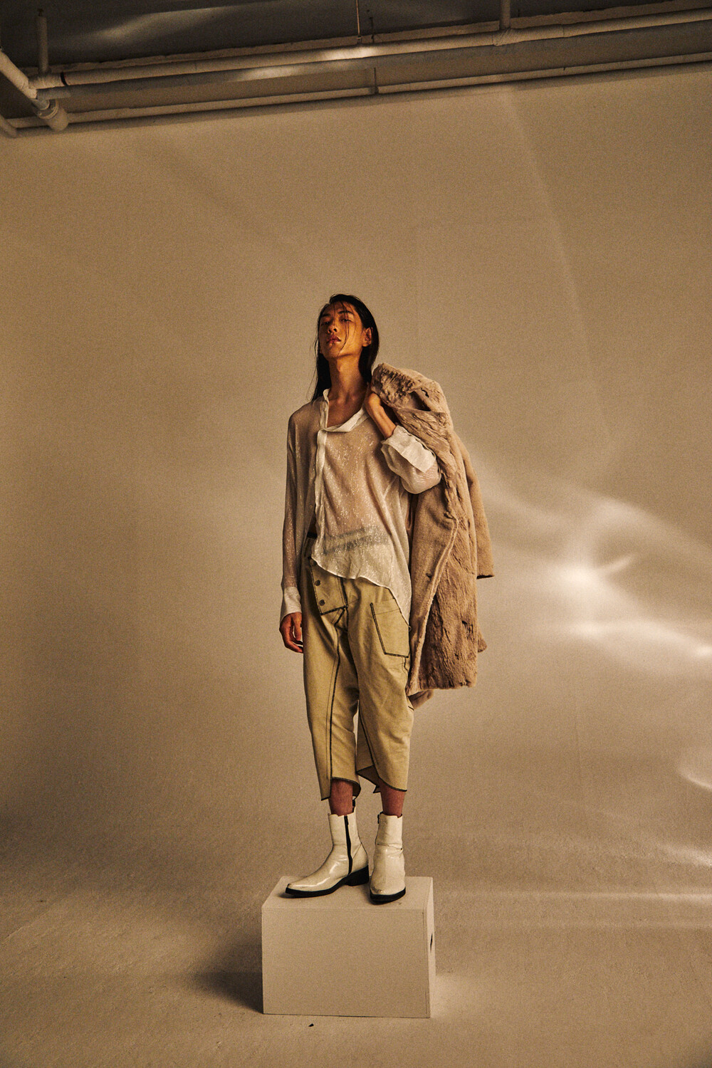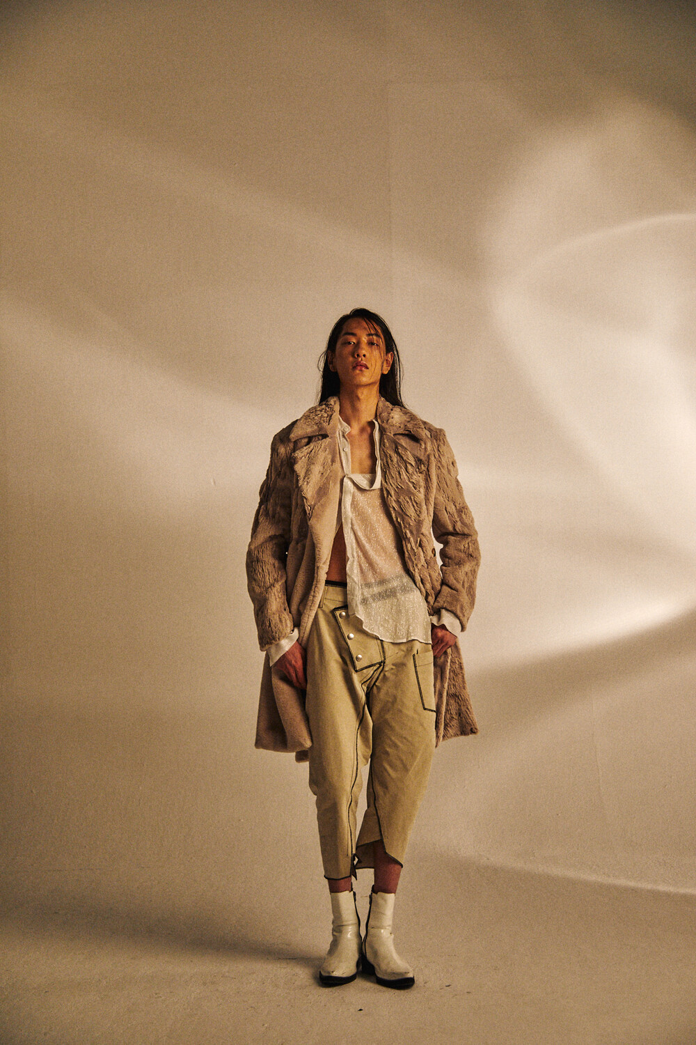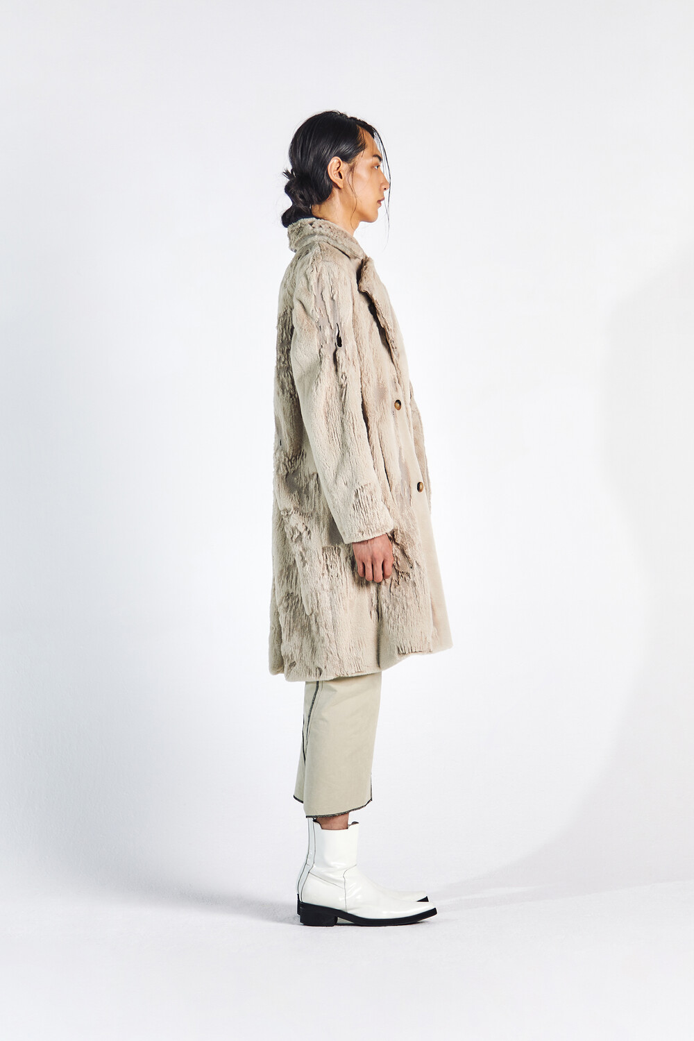 고급 fake fur 원단으로 제작된 제품으로 이번 aw20 시즌 컬렉션을 가장 컨셉츄얼하게 보여주는 아트웍 피스. 완성된 코트 위에 직접 디자이너가 알코올 농축액을 펴 바르는 수작업을 한 다음 화기에 노출시켜서 농축액이 발라진 길 따라 불이 옮겨 붙게 하는 방식으로 제작된 코트. 불에 녹은 부분과 녹지 않은 부분의 스트롱한 대비가 인상적인 제품. 모든 프로세스가 완료된 후 자연상태에서 3일 동안의 건조한 후에야 제품이 최종적으로 완성되는 손이 많이 가는 코트. (본 제품은 제작의도부터가 우연성에 의한 효과가 나타나도록 고안된 제품이기 때문에 모든 피스가 동일한 텍스쳐를 같지 않습니다. 구매 전 이 점을 꼭 유념해 주시기 바랍니다).