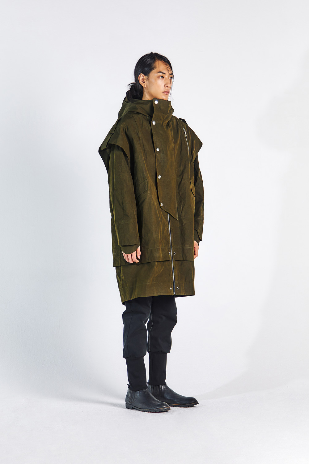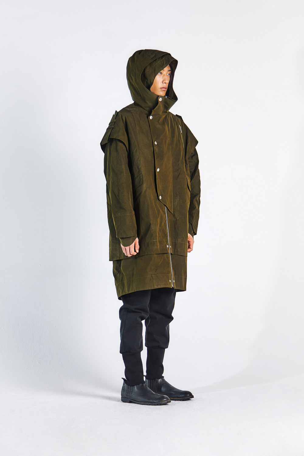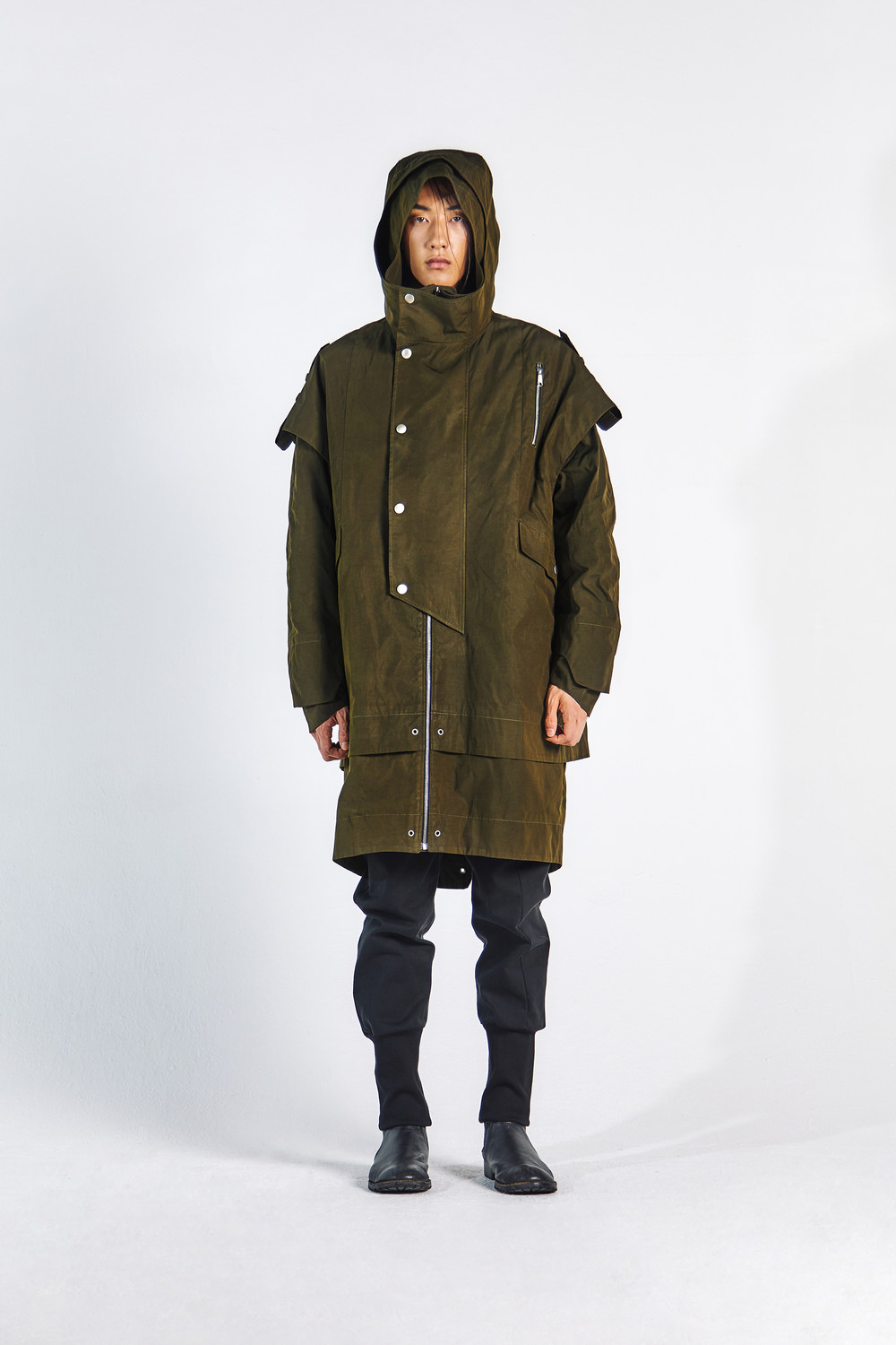 Layered Panels Double Hooded Long Parka 001-in house- 제품의 다른 컬러 아이템. 이번 aw20 컬렉션 중에 첫번째 인하우스 라인 제품. (사이즈는 L 이지만, 고객님의 취향에 맞게 기장이나 핏 등이 완벽하게 bespoke방식으로 제작이 가능하니 사이즈 변형을 원하시는 고객께서는 반드시 저희 스튜디오로 방문하셔서 꼭 시착을 하시기를 적극 권해드립니다). 두장의 옷이 합쳐진 같은 느낌의 롱 파카. 제품의 원단과 여러 특성들 때문에 굉장히 스트롱한 분위기를 연출하는 파카임. 레이어링 특징과 긴 기장감 때문에 원단 소요량이 엄청남. 뿐만 아니라 안감도 패딩에 사용하는 고급 겉감을 사용하여 원단에 들어가는 비용이 굉장히 높음. 전면과 후면의 아일렛 디테일과 두장의 후드, 소매 디테일 등 디자이너 브랜드의 감성을 느낄 수 있는 아이템. 좌우에 안주머니가 있고, 사용된 지퍼는 모두 YKK.