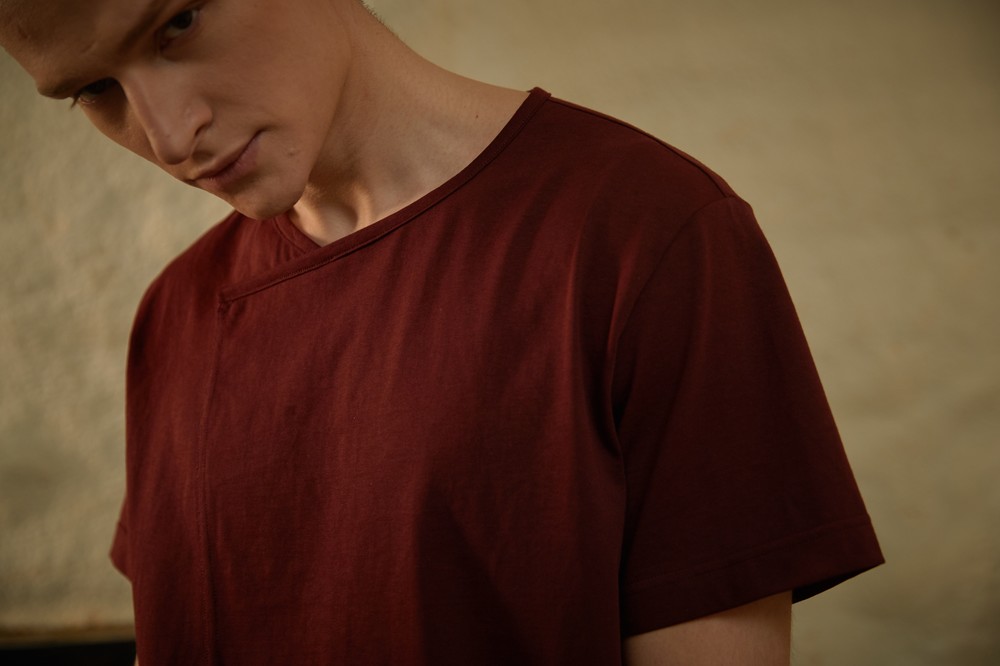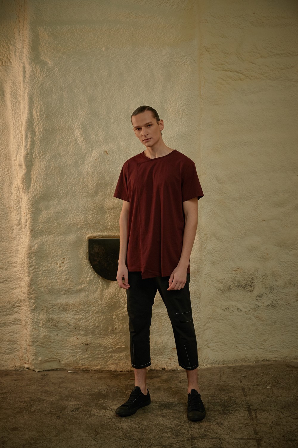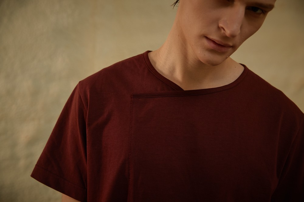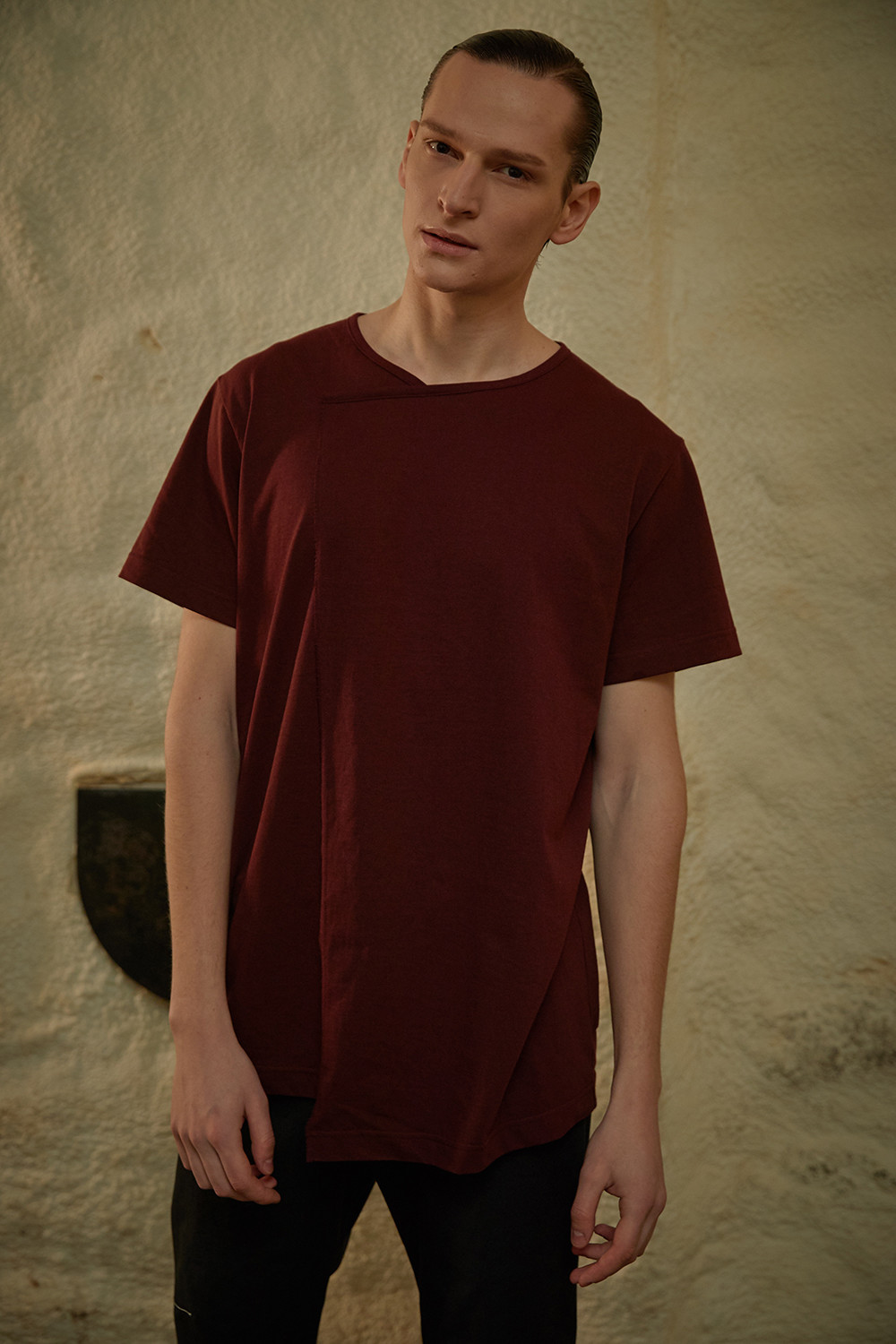 티셔츠의 앞판이 마치 라이더 자켓의 사선 지퍼처럼 기울어져 있습니다. 기울어진 단면은 오버로크 마감처리가 그대로 바깥으로 노출되어 러프한 매력을 줍니다.