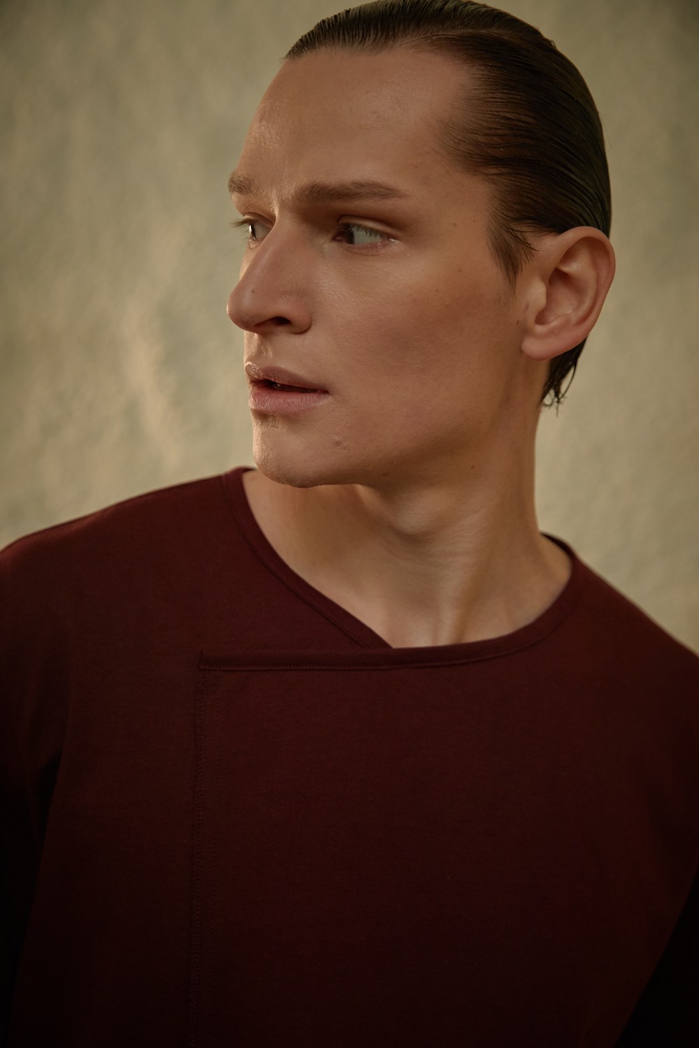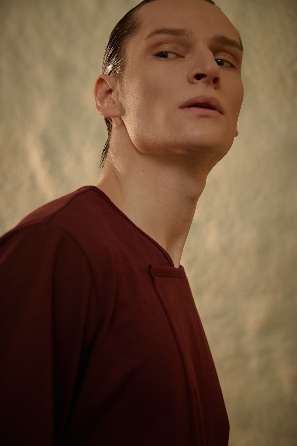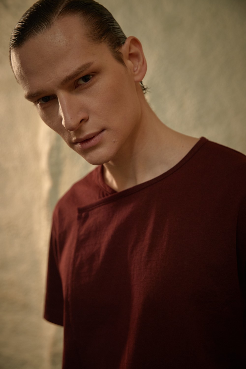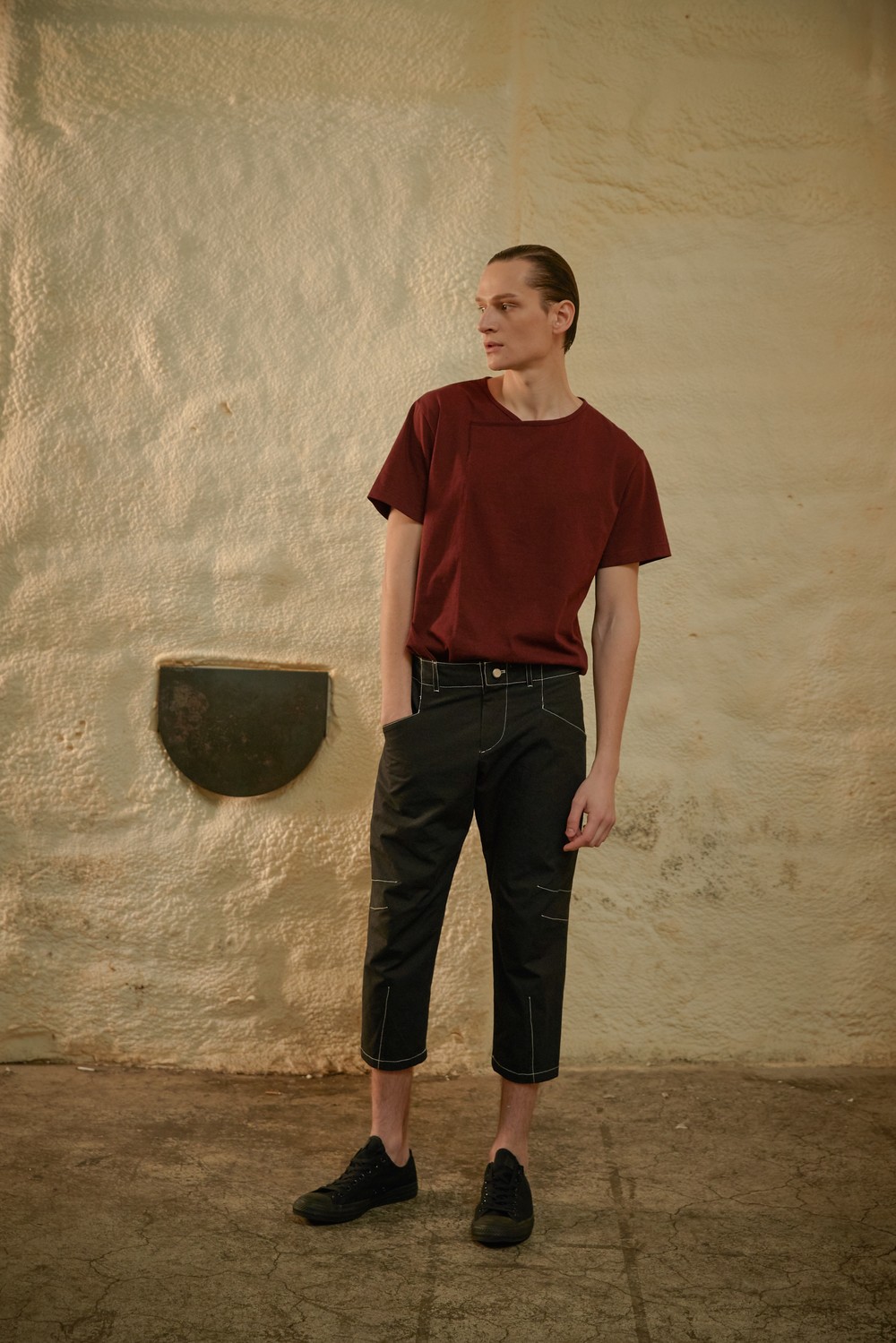 티셔츠의 앞판이 마치 라이더 자켓의 사선 지퍼처럼 기울어져 있습니다. 기울어진 단면은 오버로크 마감처리가 그대로 바깥으로 노출되어 러프한 매력을 줍니다.