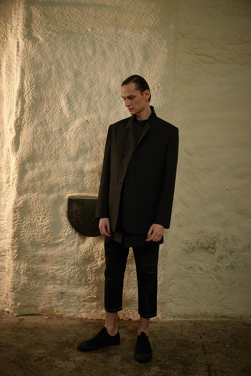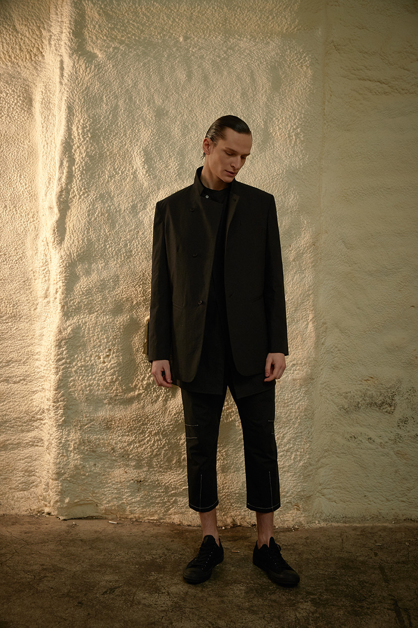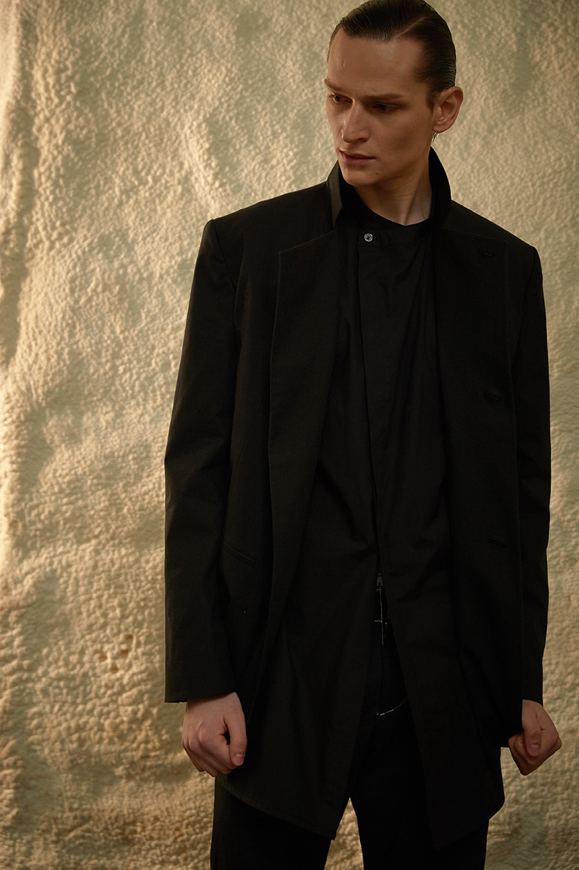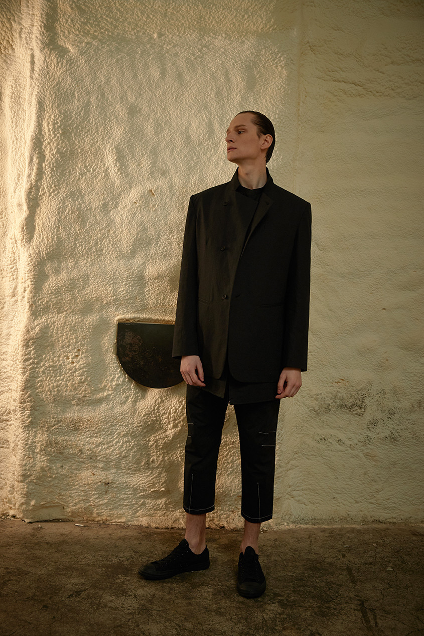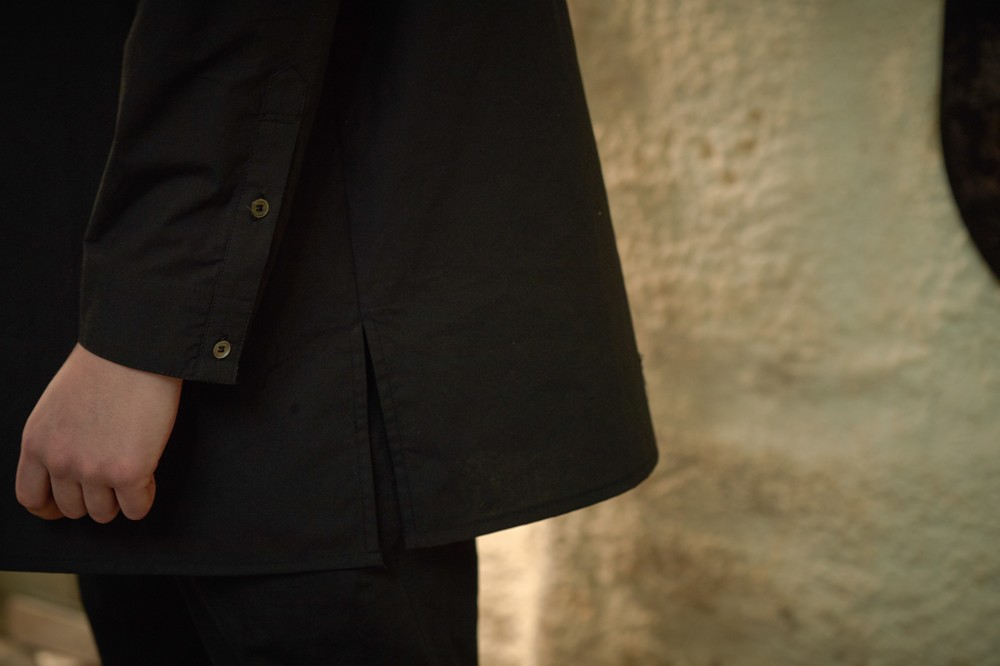 이번 ss19 컬렉션의 키 디테일 중 하나인 다트를 소매에 사용하여 미니멀하지만 유니크한 감성을 살렸습니다. 일반적인 커프 양식처럼 소매 끝에 커프를 다는 것이 아니라 안으로 접어넣어서 마무리 했기 때문에 소매 밑단에 탑스티치가 올라가게 되고 플라켓(소매의 단추가 달리는 부분)역시 보다 많이 노출됩니다. 양 사이드에는 트임을 주어서 움직이는 데에 불편함을 없게 디자인 하였습니다.