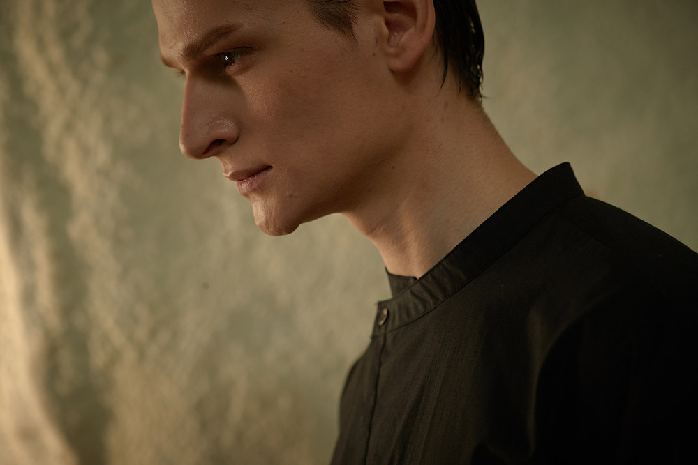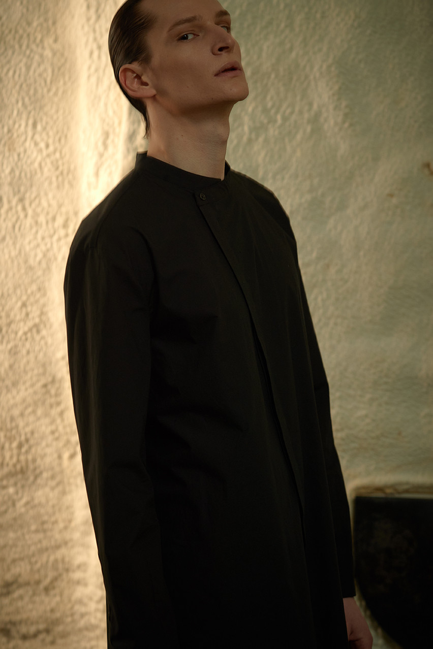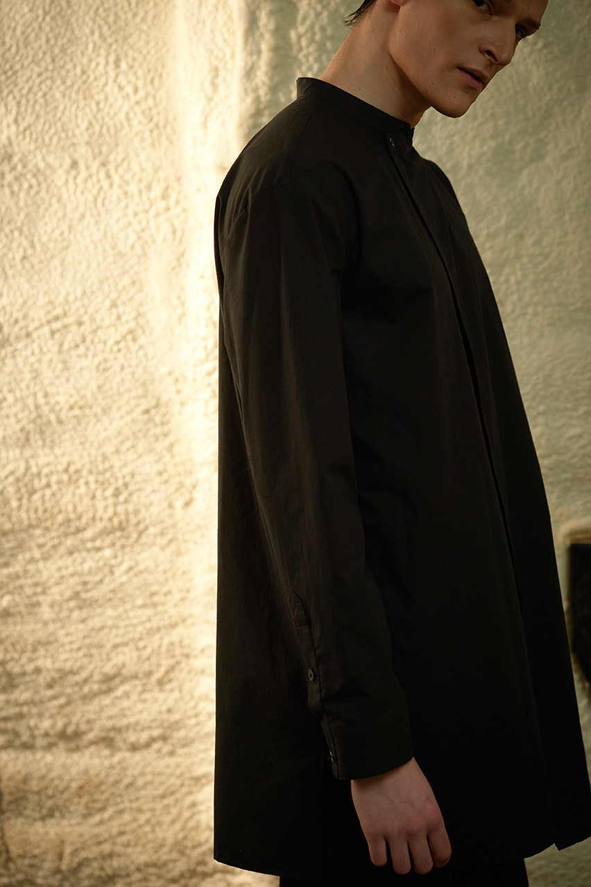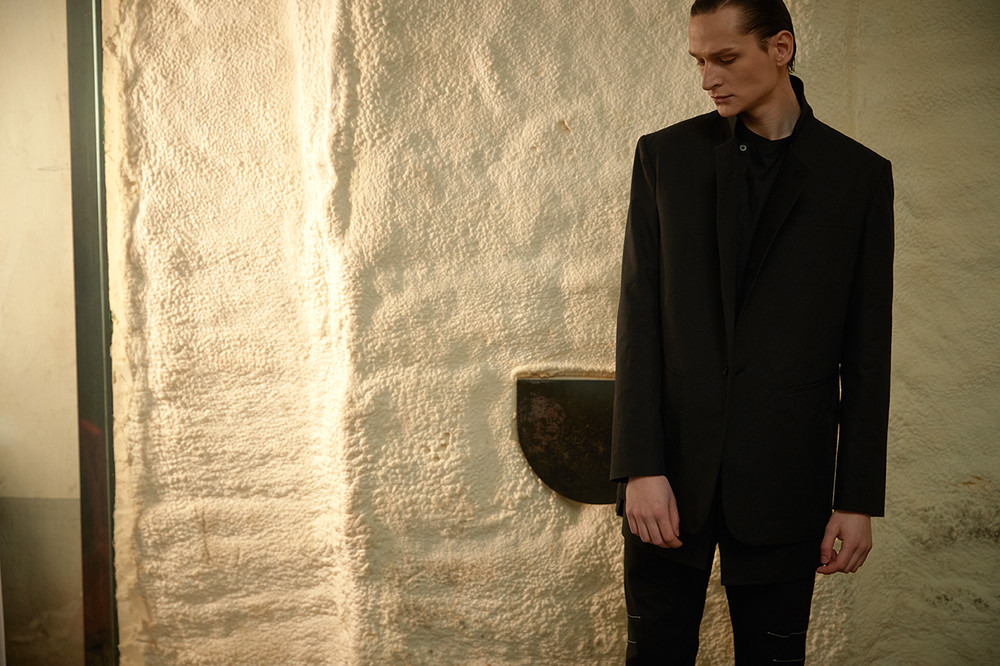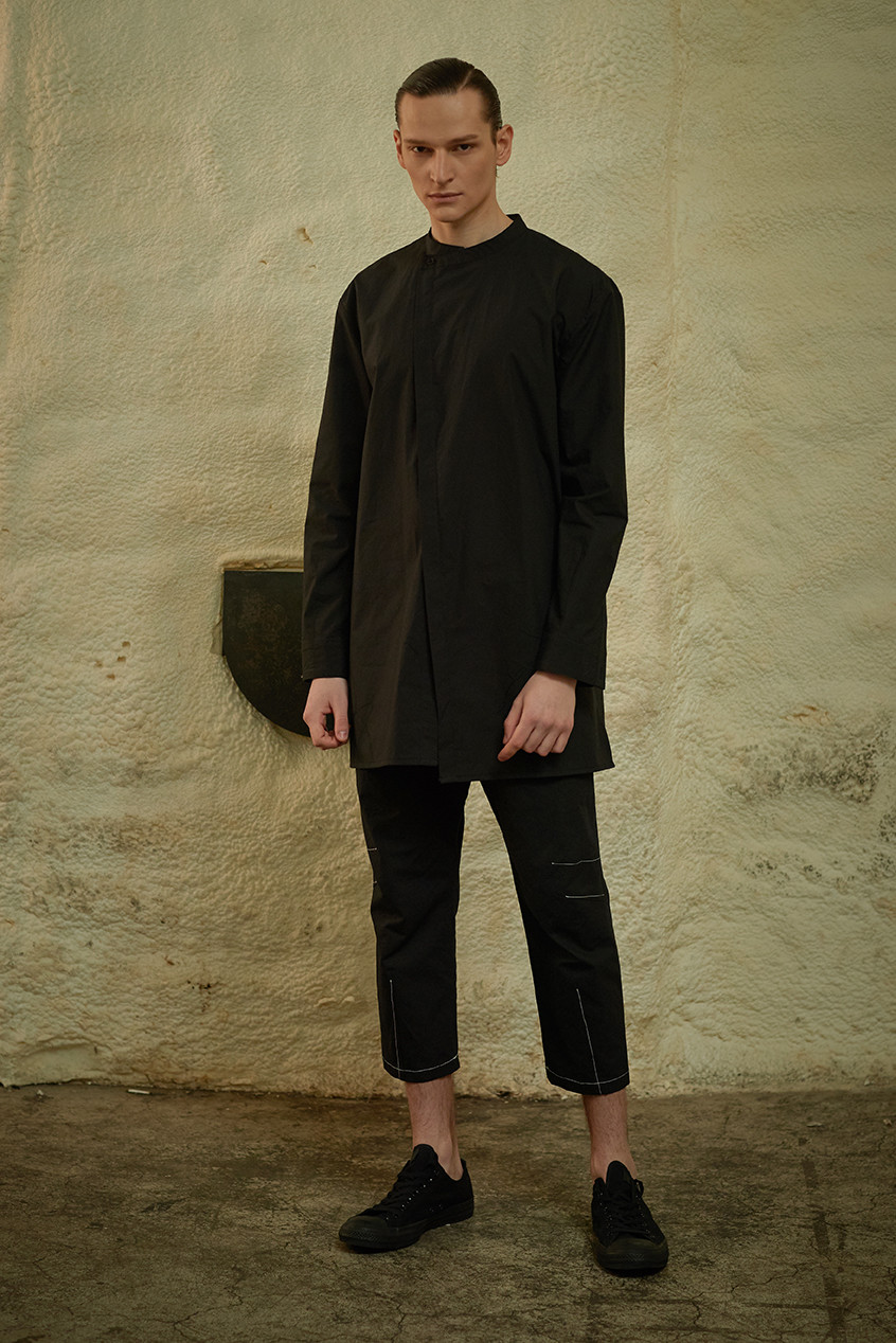 이번 ss19 컬렉션의 키 디테일 중 하나인 다트를 소매에 사용하여 미니멀하지만 유니크한 감성을 살렸습니다. 일반적인 커프 양식처럼 소매 끝에 커프를 다는 것이 아니라 안으로 접어넣어서 마무리 했기 때문에 소매 밑단에 탑스티치가 올라가게 되고 플라켓(소매의 단추가 달리는 부분)역시 보다 많이 노출됩니다. 양 사이드에는 트임을 주어서 움직이는 데에 불편함을 없게 디자인 하였습니다.