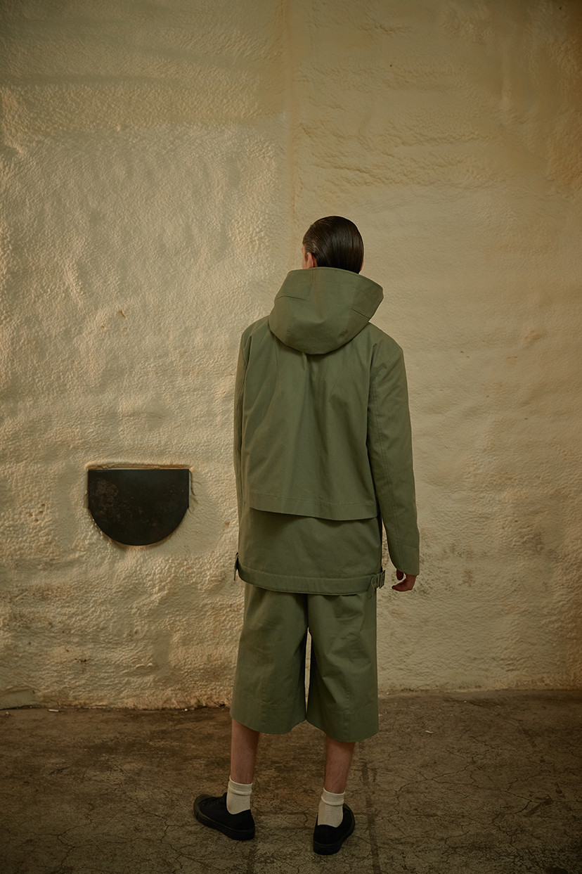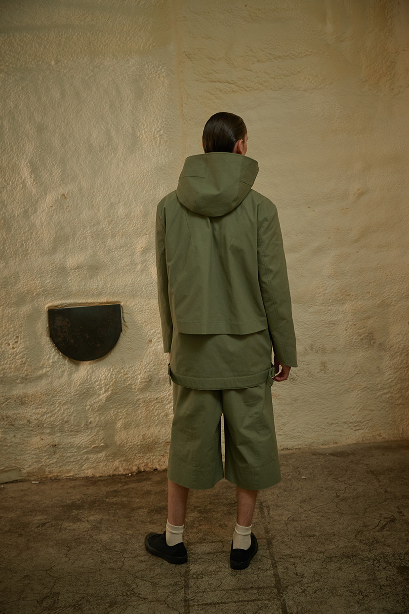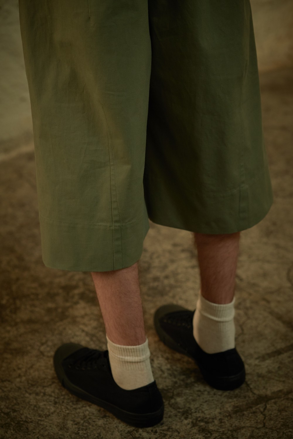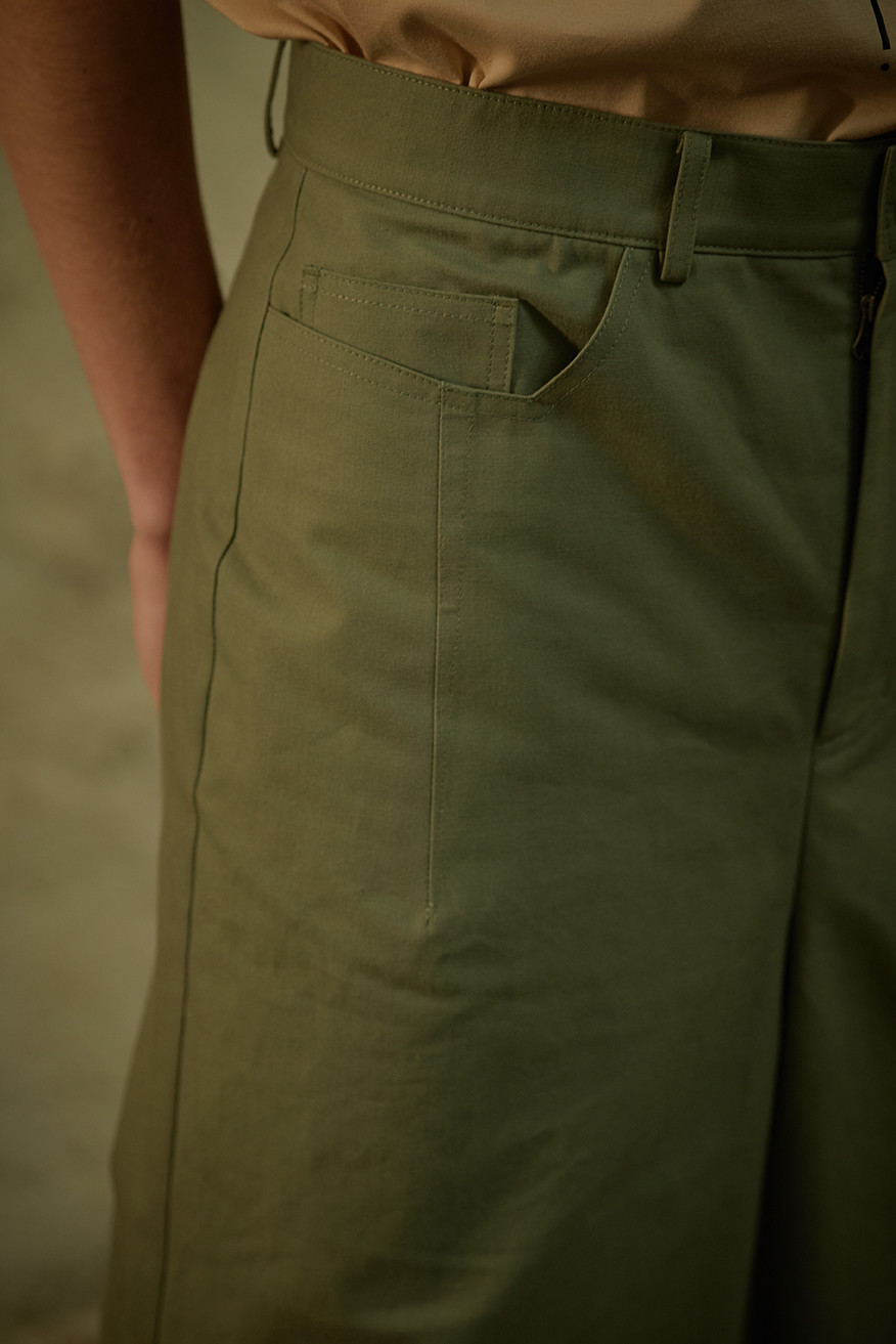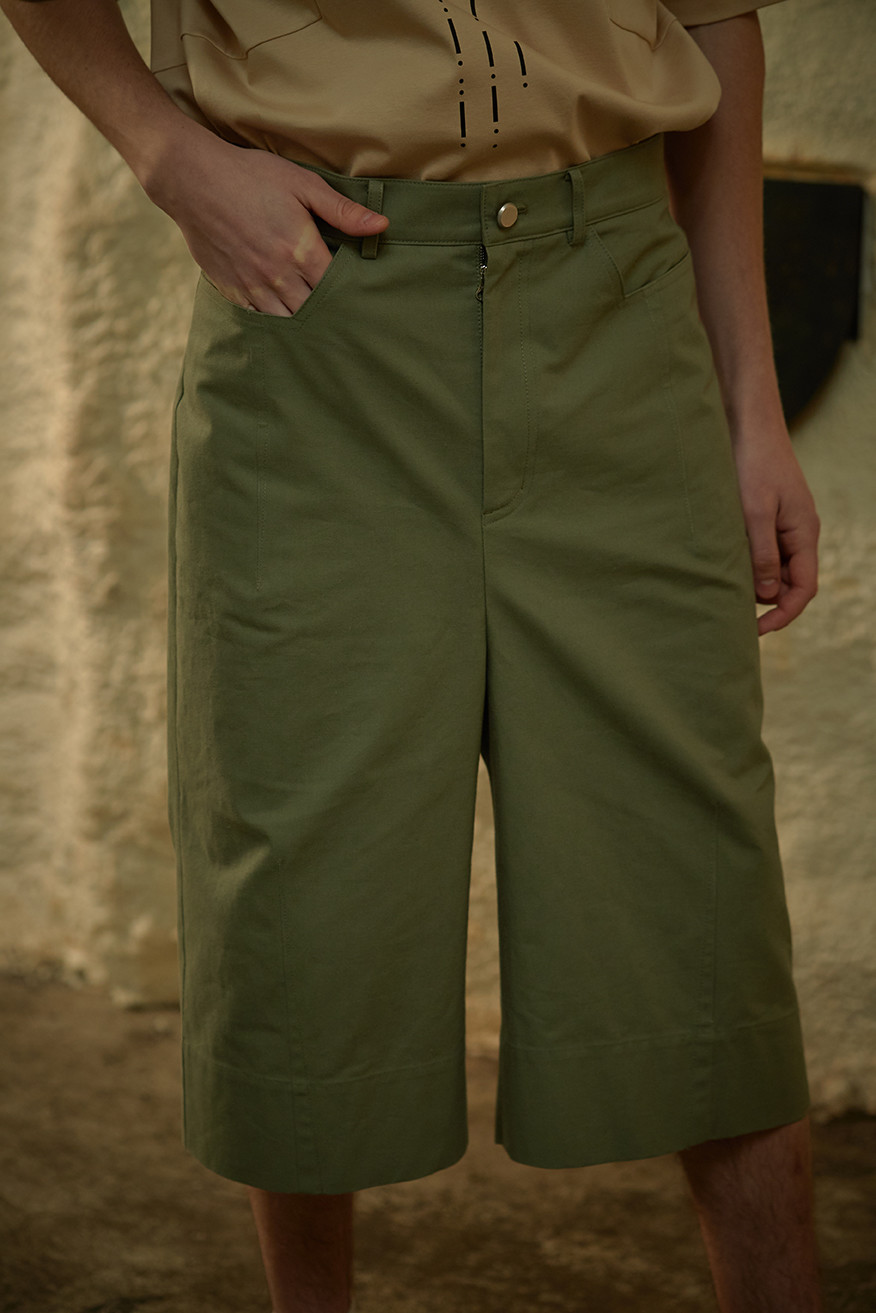 Wide Fit Dart Detailed Cropped Trousers 005의 다른 컬러, 다른 원단 버전. esopie의 시그니쳐 핏인 H라인 바지로 직선적인 실루엣이 매력적인 아이템. 100% cotton의 일본 수입원단 사용. 핏이 와이드하기 때문에 한여름도 시원하게 입을 수 있음. 연한 카키색 원단에 다트 디테일들이 있고 다트 위에는 부담스럽지 않은 색상의 색상으로 탑스티치가 들어가 있음.