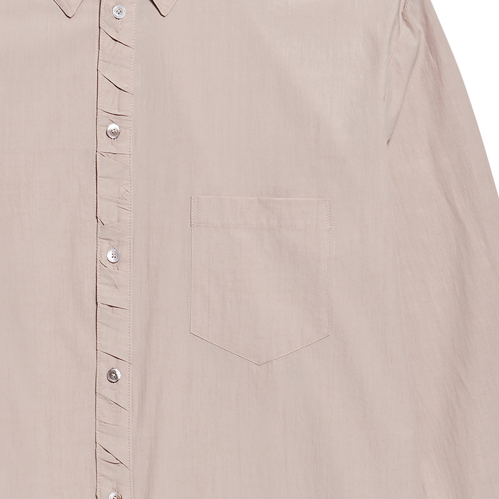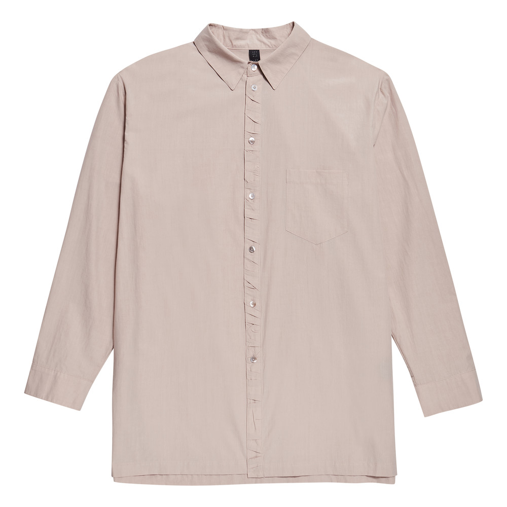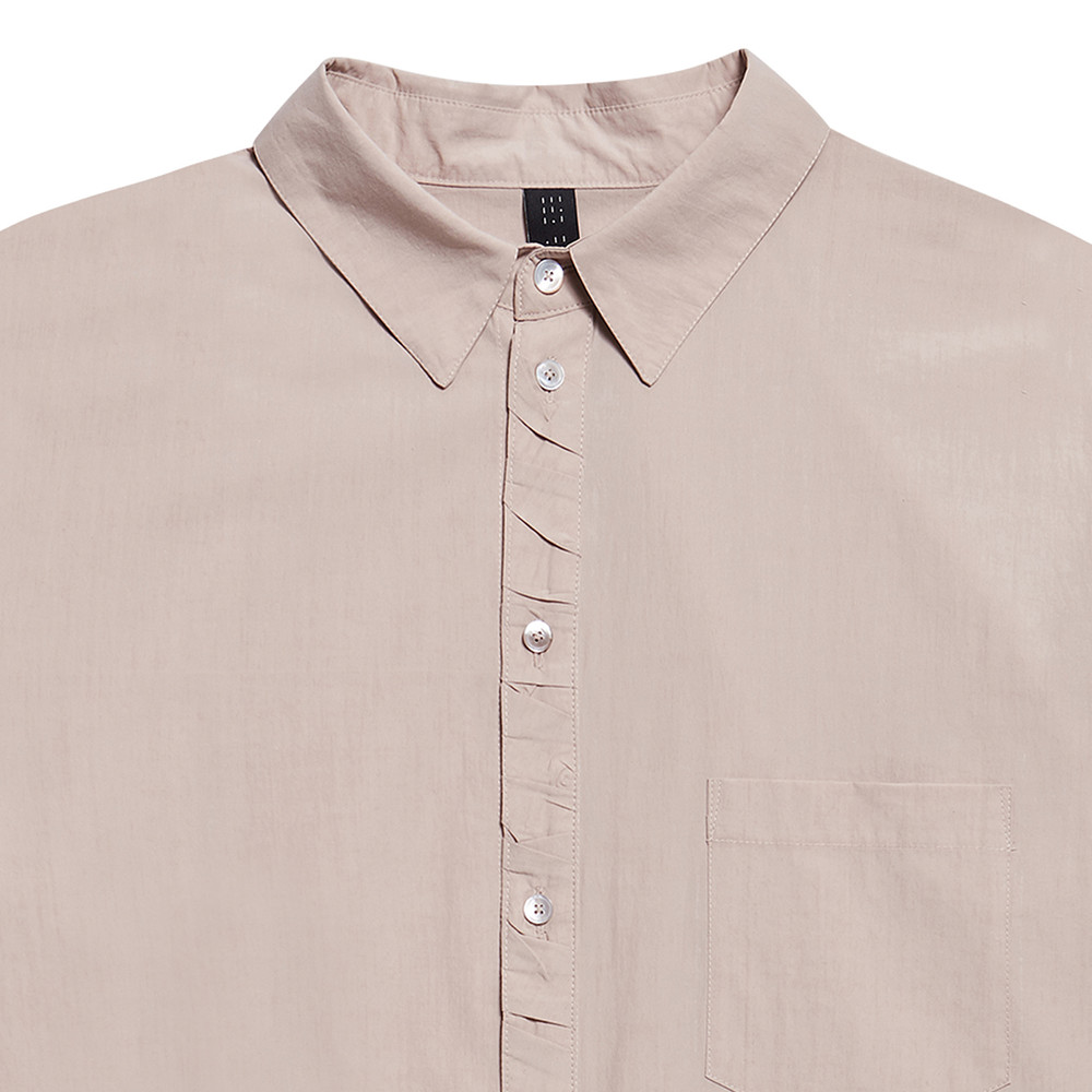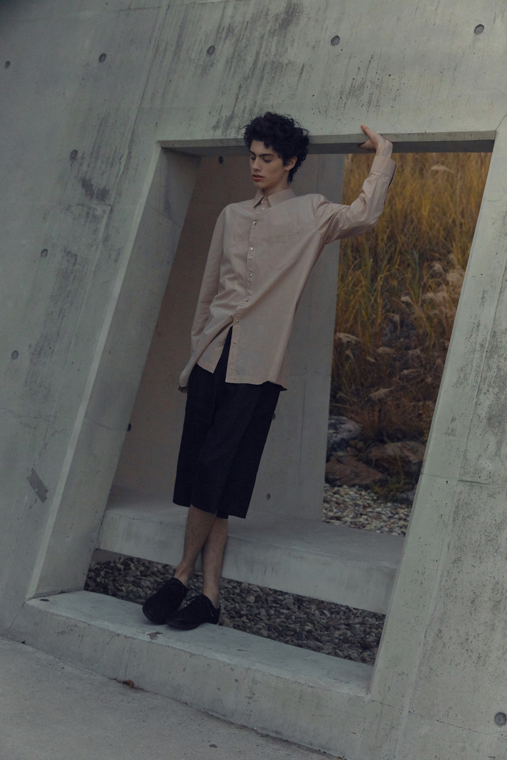SS20 Creased Button Stand Detailed Shirt 001의 버튼 스탠드 디테일은 기계에 의해 일정한 양식으로 구겨지는 것이 아니라 디자이너가 피스마다 직접 구김을 고착시키는 작업을 하기 때문에 모든 피스가 완벽하게 똑같을 수는 없으니 이 점 양해바랍니다.