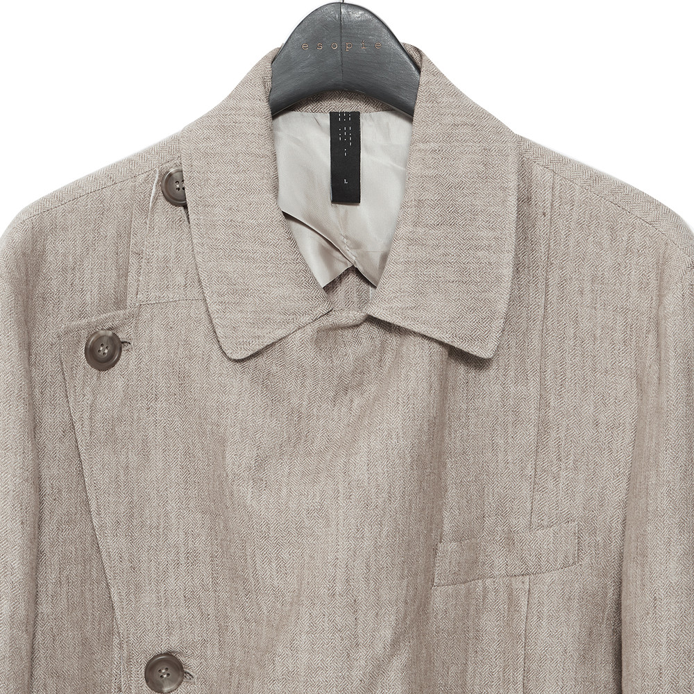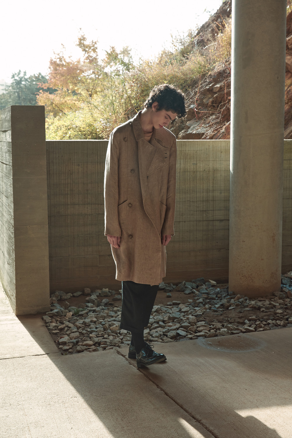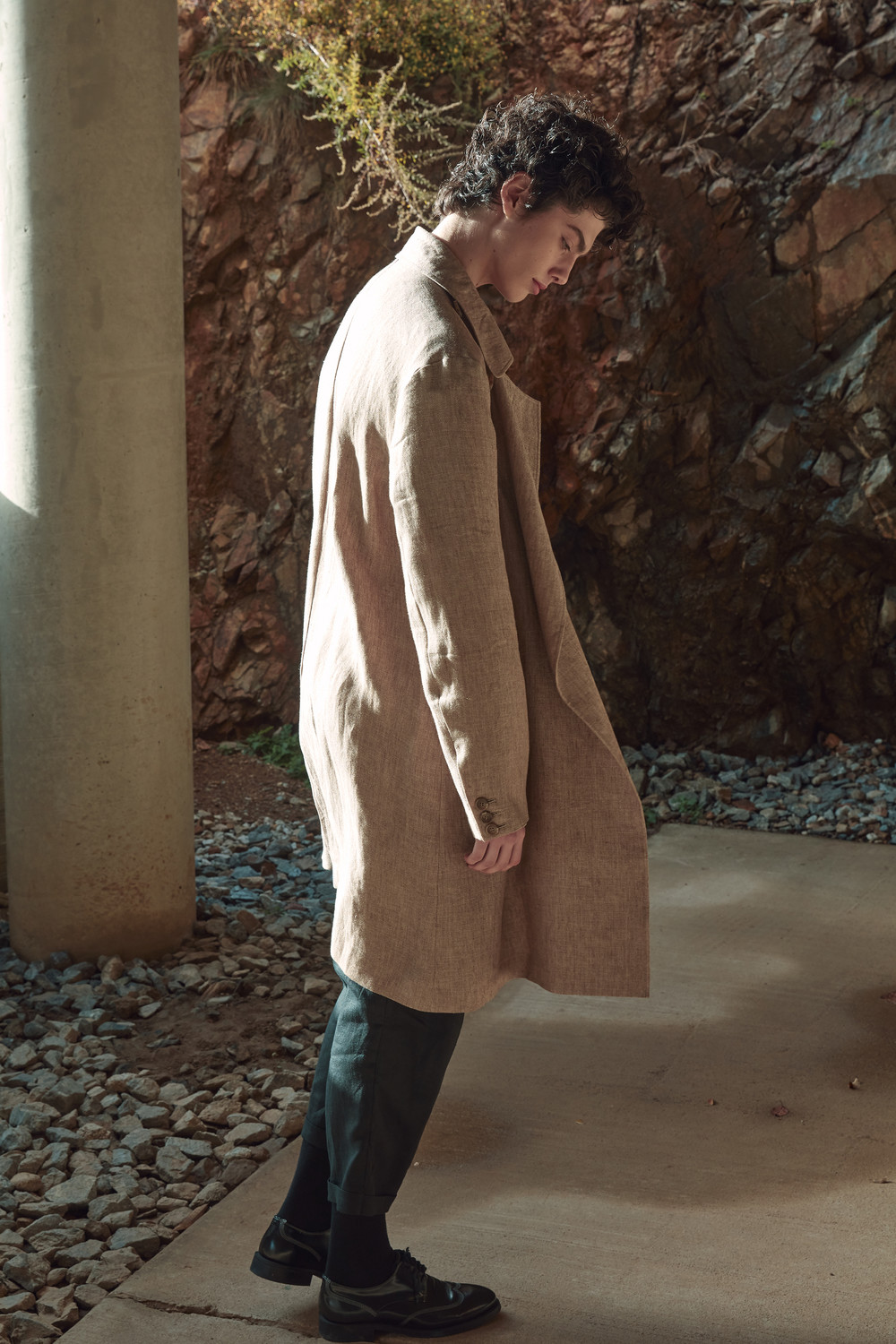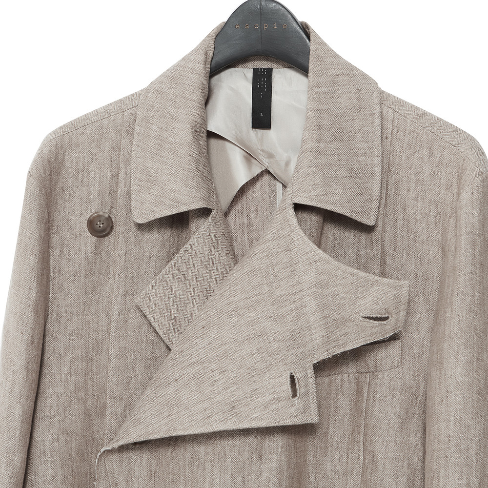 raw edge finishing이 전면 디테일이 특징인 100% linen 코트. 국내산 100% 고급 린넨 소재의 코트로 원단 두께가 얇기 때문에 봄 시즌에 데일리 아이템으로 입기에 전혀 무리가 없음. 변형 헤링본 짜임으로 흔치 조직감을 느낄 수 있는 원단을 사용하였음. 봄용 아우터임을 감안하여 반안감 처리를 하였으며 시접은 고급스럽게 binding tape으로 처리. 라이더 자켓처럼 코트의 양 앞판이 서로 겹쳐지게 디자인 되었기 때문에 잠궈서 입었을 때와 오픈해서 입었을 때 서로 다른 매력을 줄 수 있음. raw edge finishing과 더불어 앞판에 추가적인 패널, 단추 디테일들이 매력적인 코트. 코트의 앞주머니가 절개로부터 이어지기 때문에 미니멀하면서 모던한 느낌을 주며 좌우 모두 안쪽에 안주머니가 있어서 실용적인 면도 배려하였음.
