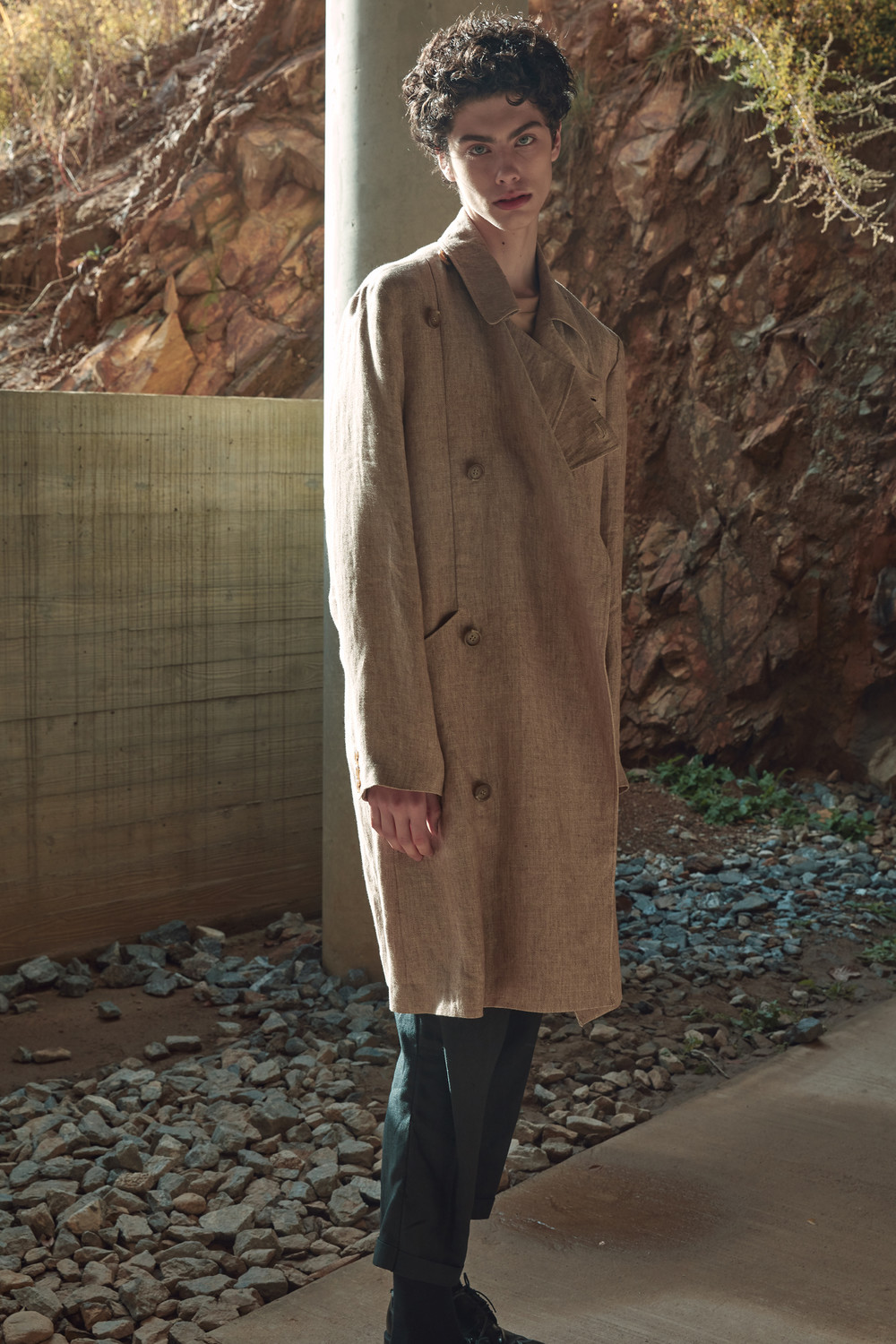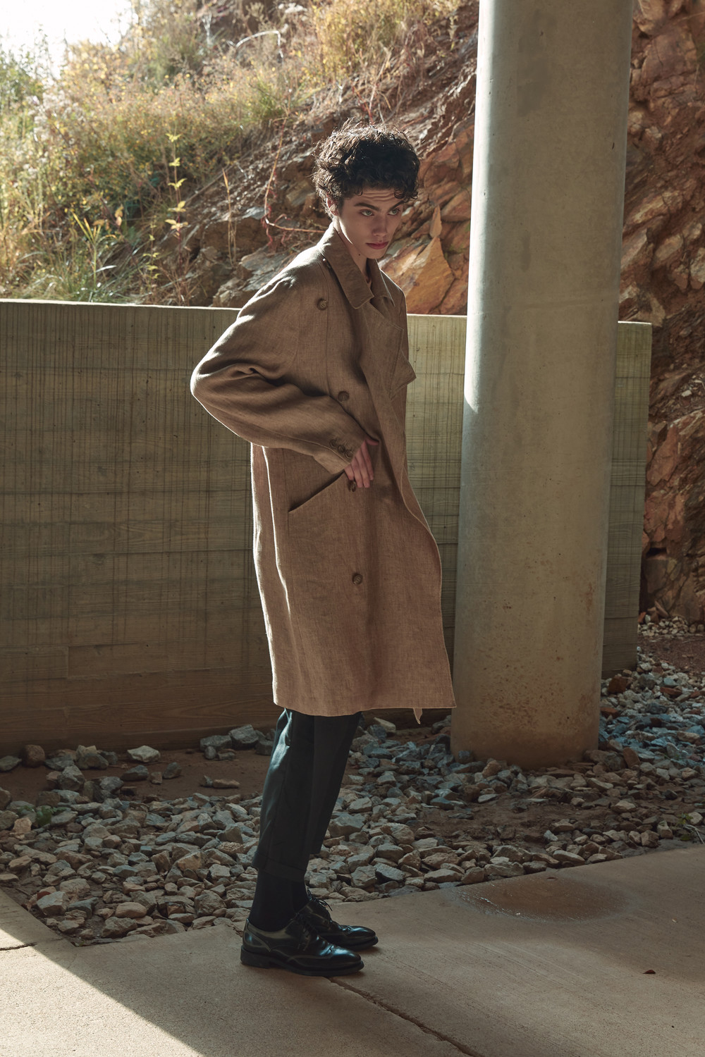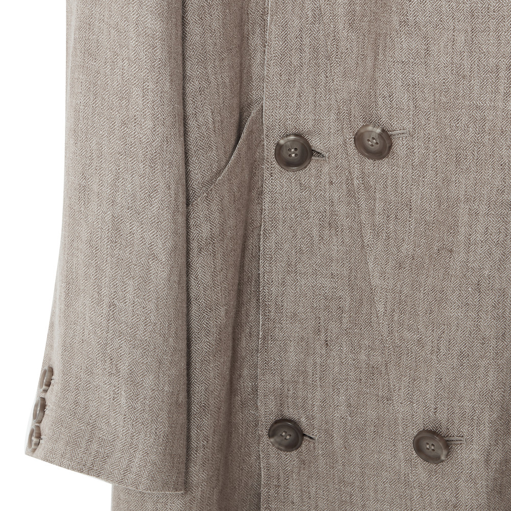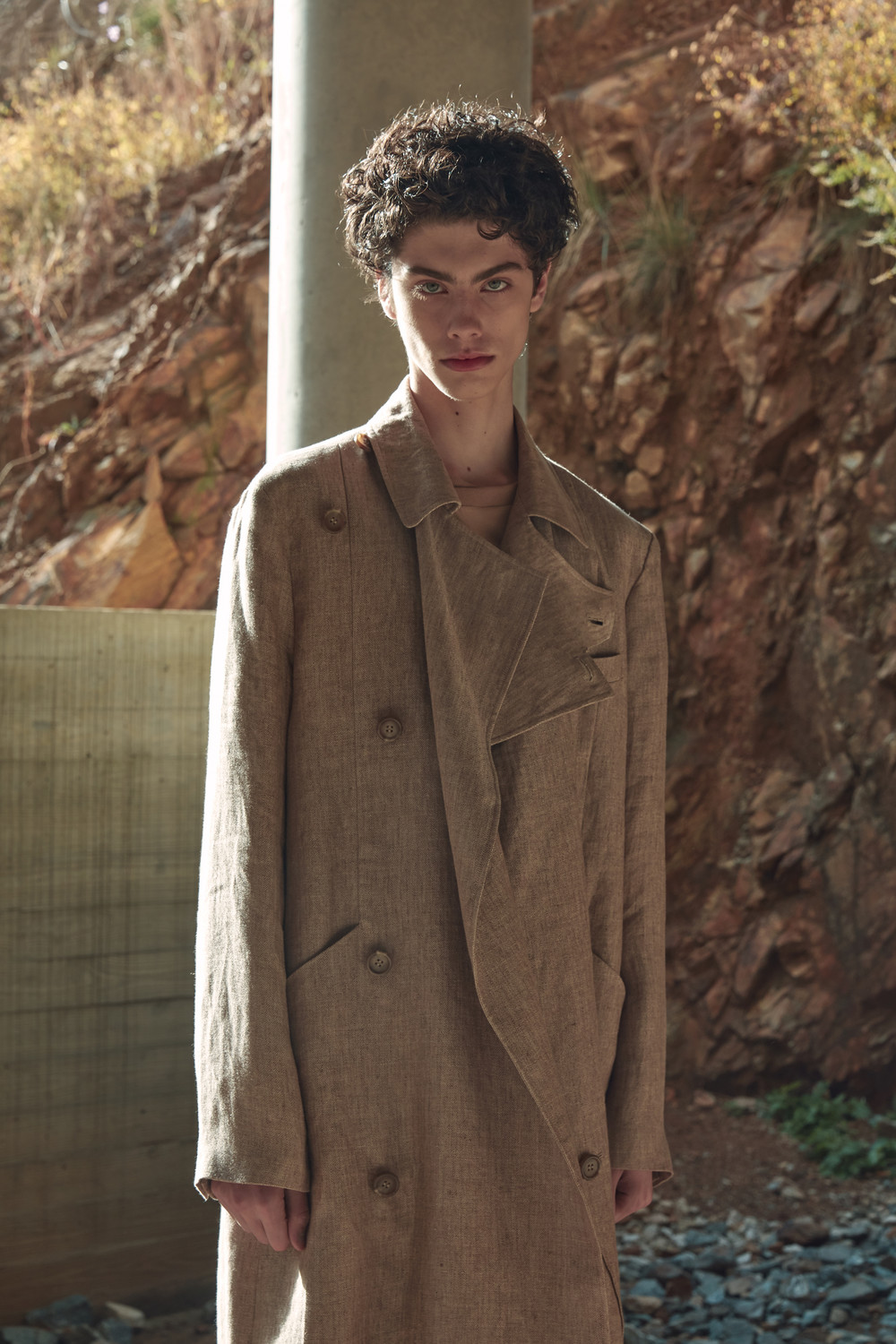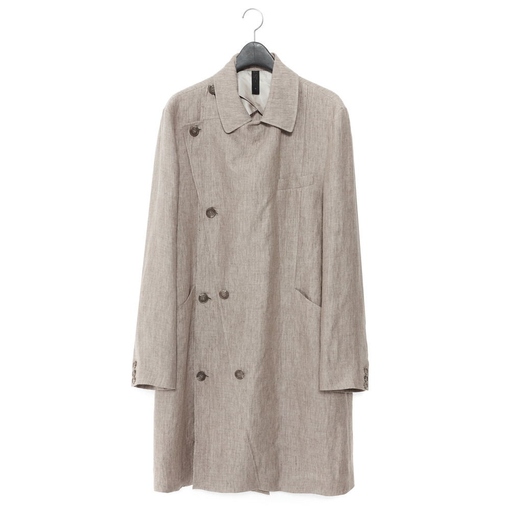 raw edge finishing이 전면 디테일이 특징인 100% linen 코트. 국내산 100% 고급 린넨 소재의 코트로 원단 두께가 얇기 때문에 봄 시즌에 데일리 아이템으로 입기에 전혀 무리가 없음. 변형 헤링본 짜임으로 흔치 조직감을 느낄 수 있는 원단을 사용하였음. 봄용 아우터임을 감안하여 반안감 처리를 하였으며 시접은 고급스럽게 binding tape으로 처리. 라이더 자켓처럼 코트의 양 앞판이 서로 겹쳐지게 디자인 되었기 때문에 잠궈서 입었을 때와 오픈해서 입었을 때 서로 다른 매력을 줄 수 있음. raw edge finishing과 더불어 앞판에 추가적인 패널, 단추 디테일들이 매력적인 코트. 코트의 앞주머니가 절개로부터 이어지기 때문에 미니멀하면서 모던한 느낌을 주며 좌우 모두 안쪽에 안주머니가 있어서 실용적인 면도 배려하였음.