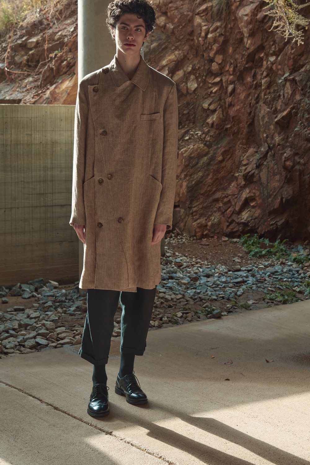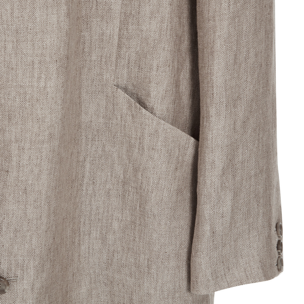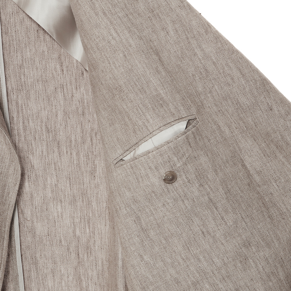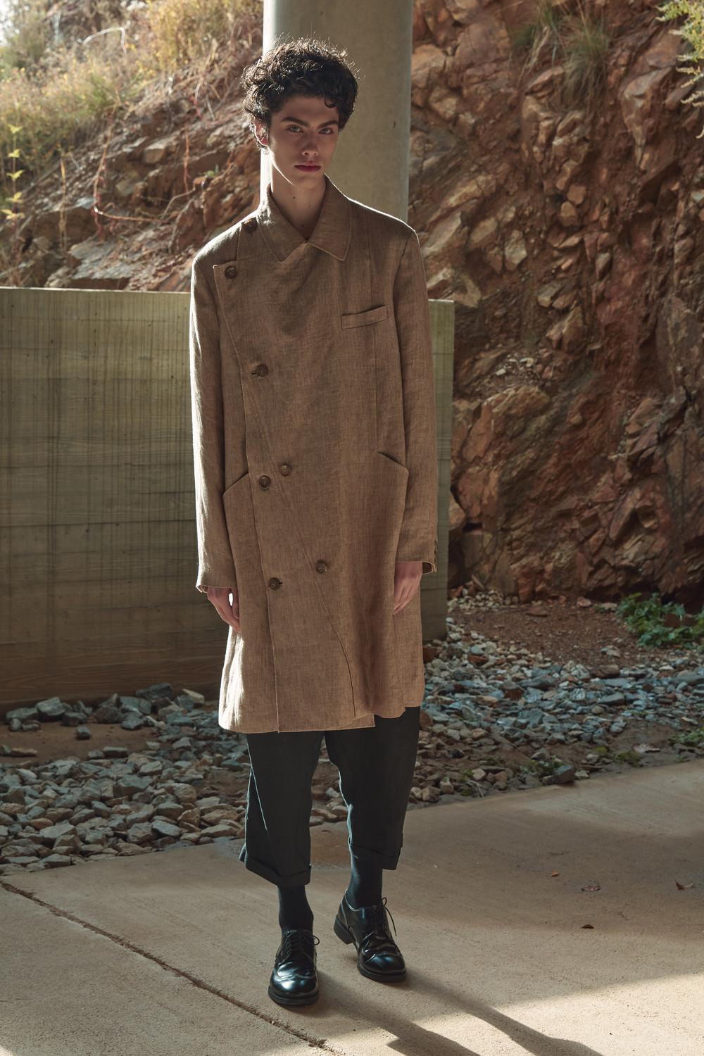 raw edge finishing이 전면 디테일이 특징인 100% linen 코트. 국내산 100% 고급 린넨 소재의 코트로 원단 두께가 얇기 때문에 봄 시즌에 데일리 아이템으로 입기에 전혀 무리가 없음. 변형 헤링본 짜임으로 흔치 조직감을 느낄 수 있는 원단을 사용하였음. 봄용 아우터임을 감안하여 반안감 처리를 하였으며 시접은 고급스럽게 binding tape으로 처리. 라이더 자켓처럼 코트의 양 앞판이 서로 겹쳐지게 디자인 되었기 때문에 잠궈서 입었을 때와 오픈해서 입었을 때 서로 다른 매력을 줄 수 있음. raw edge finishing과 더불어 앞판에 추가적인 패널, 단추 디테일들이 매력적인 코트. 코트의 앞주머니가 절개로부터 이어지기 때문에 미니멀하면서 모던한 느낌을 주며 좌우 모두 안쪽에 안주머니가 있어서 실용적인 면도 배려하였음.