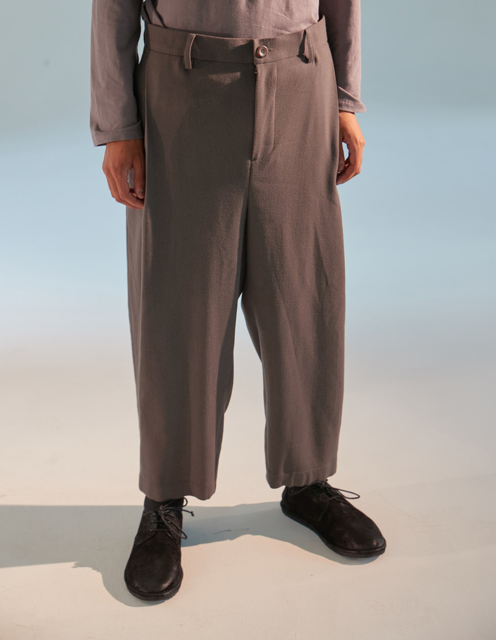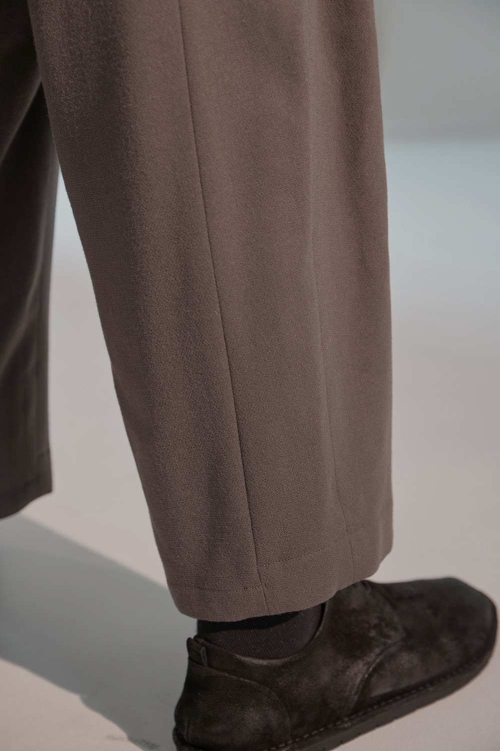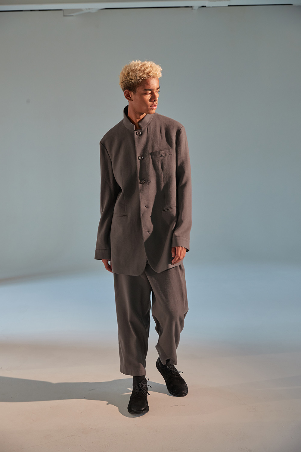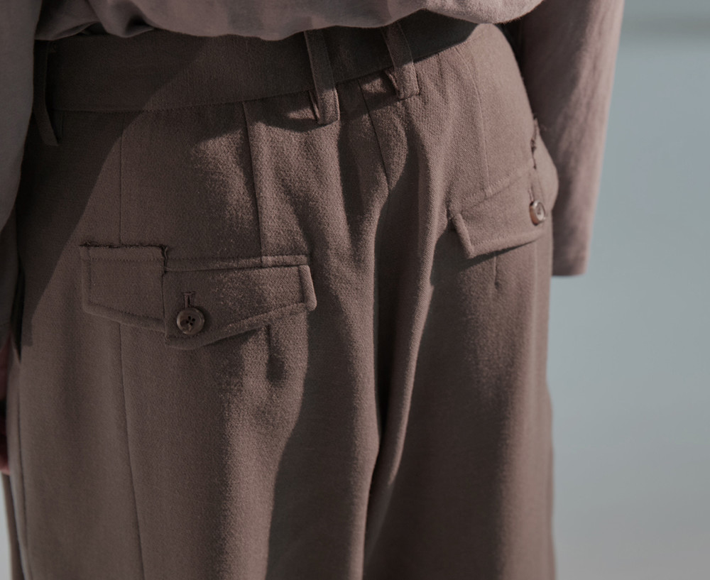 Slided Welt Detailed Mandarin Collar Jacket 005과 풀세트로 스타일링된 바지. Back Middle Seam Trousers 004의 faded mustard 색상버전.기본적으로 tapered 형태의 바지로 Double Middle Seam Trousers 와 비슷한 형태의 바지. Double Middle Seam Trousers와 달리 뒤에만 seam(절개)이 있고 이 절개를 기점으로 밑단에서 hem 스티치 높이가 다름. 소모 이중지 원단 사용. 뒷주머니 flap이 반으로 잘리면서 슬라이드된 듯한 느낌의 디테일. 고급 너트단추 사용.
