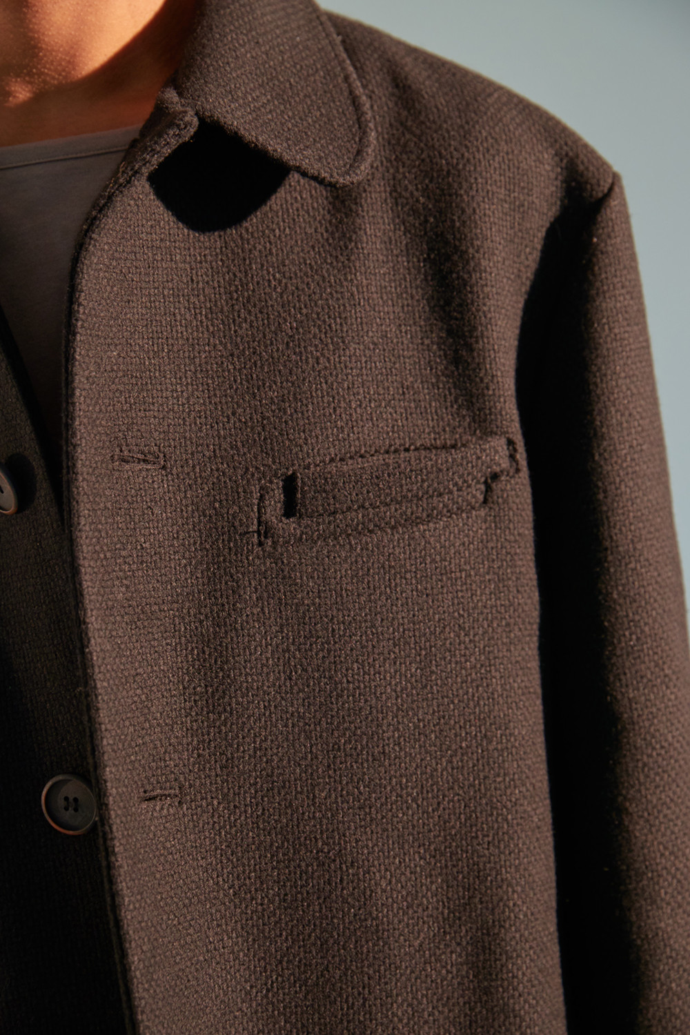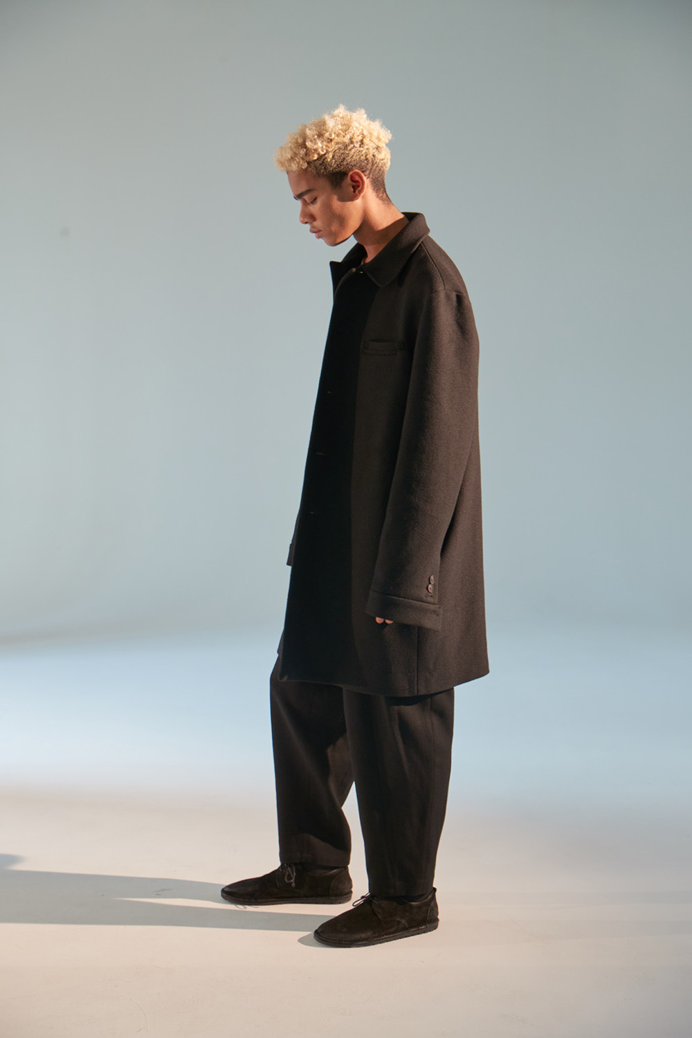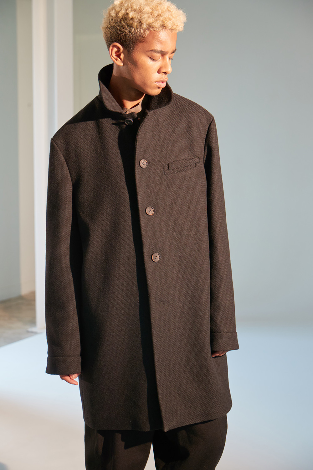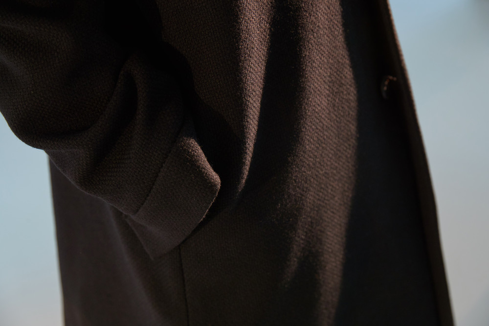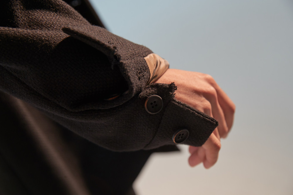 상당한 두께감이 있는 코트로 한겨울에도 따뜻하게 착용가능한 하프기장 코트. 직선적인 듯하면서도 커브를 그리는 카라 곡선. 제품 상세 사진 처럼 카라를 세워서 입는 것 역시 좋은 스타일링의 한 방법. H라인 실루엣으로 드롭 숄더 디자인은 아니지만 넉넉해 보이는 핏. aw18 시즌에 많은 상품에 디자인 디테일로 사용된 slided welt pocket이 왼쪽 가슴에 사용. 소매 하단에 절개를 줘서 셔츠의 커프처럼 보이게 한 것 역시 디자인 포인트(이 커프 부분과 웰트포켓에는 raw edge 피니싱이 들어가 있습니다. 따라서 입을수록 올이 풀리는 것은 자연스러운 현상이며 이러한 러프한 느낌을 염두한 디자인임을 미리 고지하여 드립니다. 자세한 사항은 사진을 참고 하시기 바랍니다). 양쪽 모두 안주머니. 고급 너트 단추 사용. In-seam 포켓.