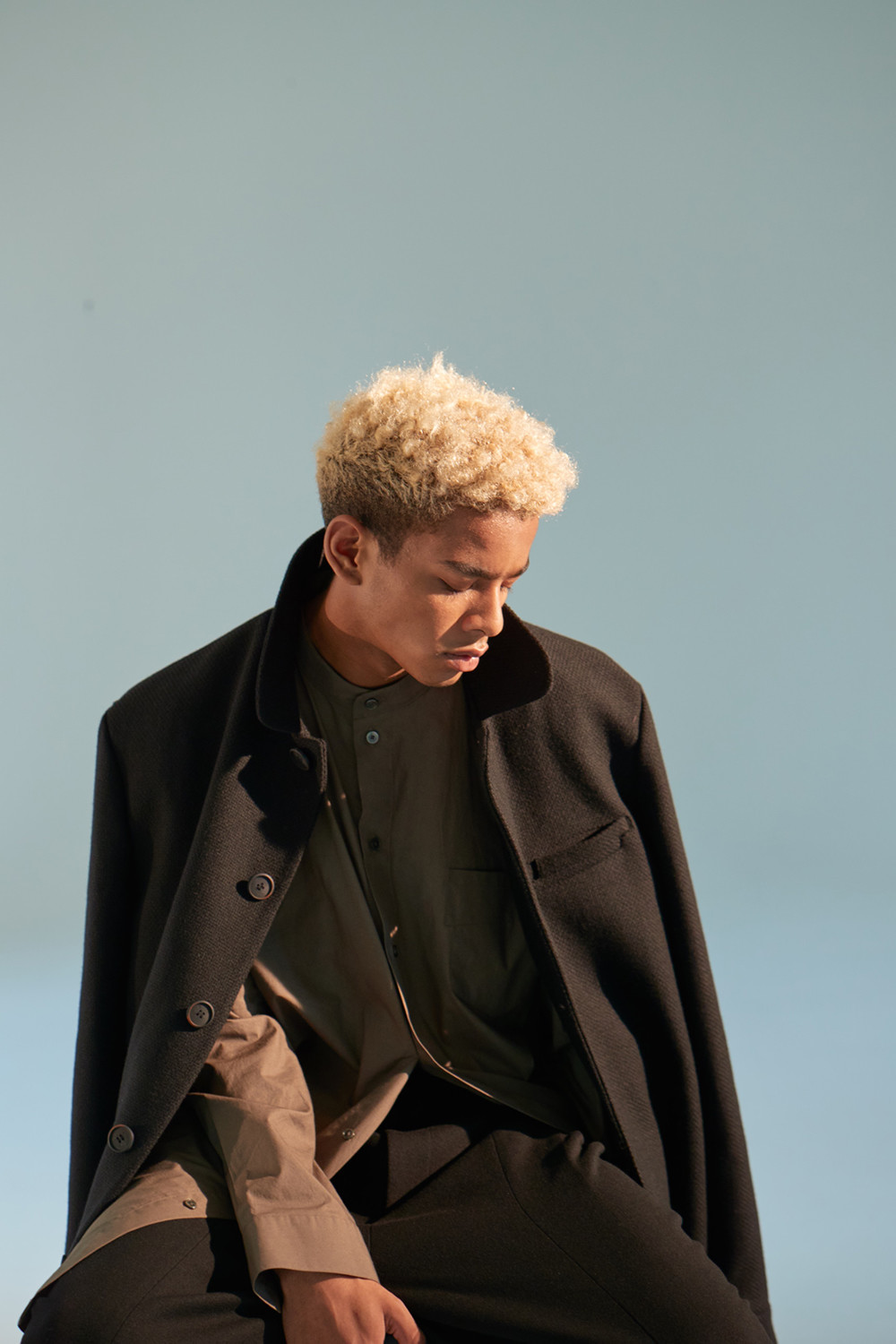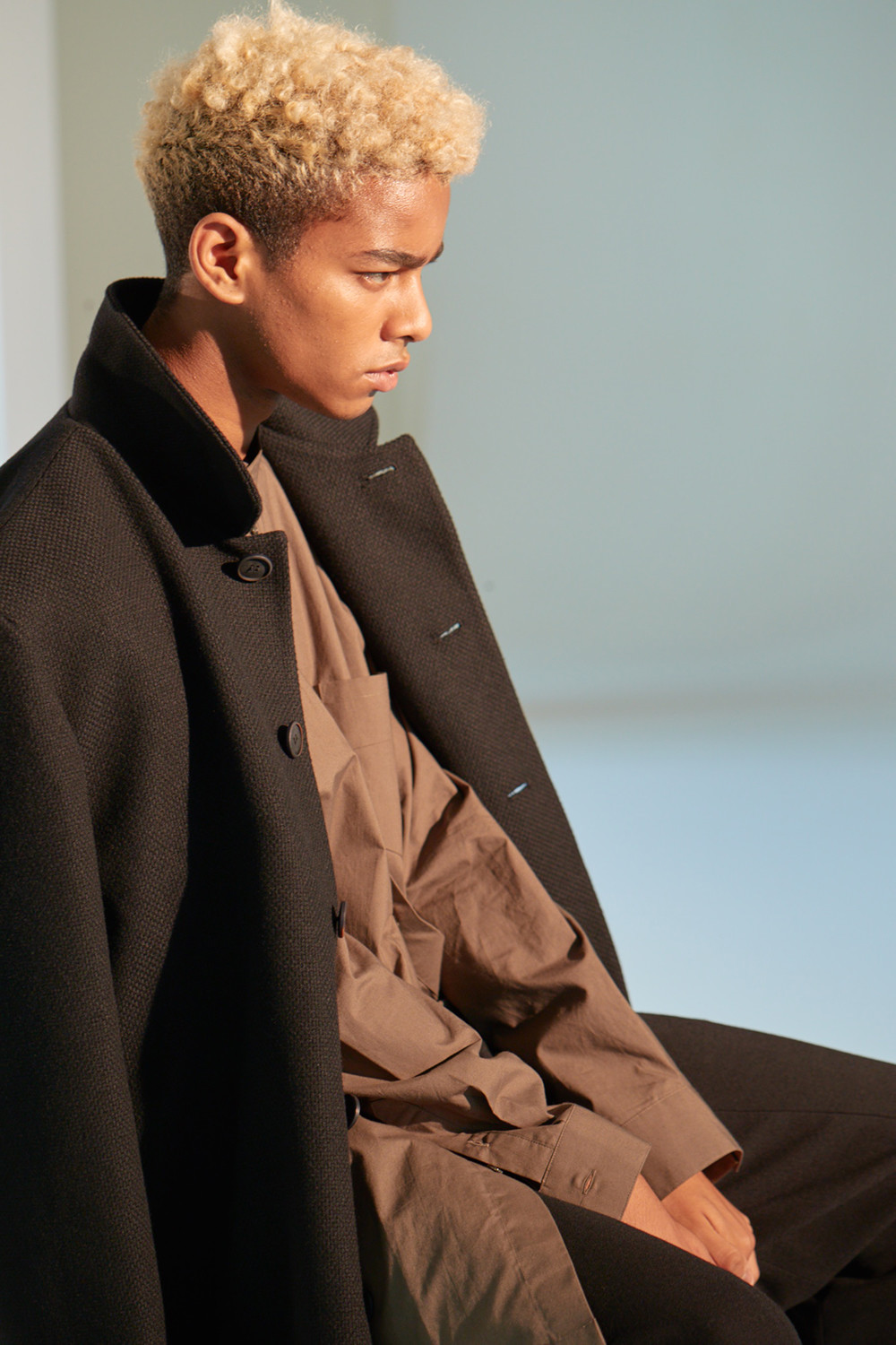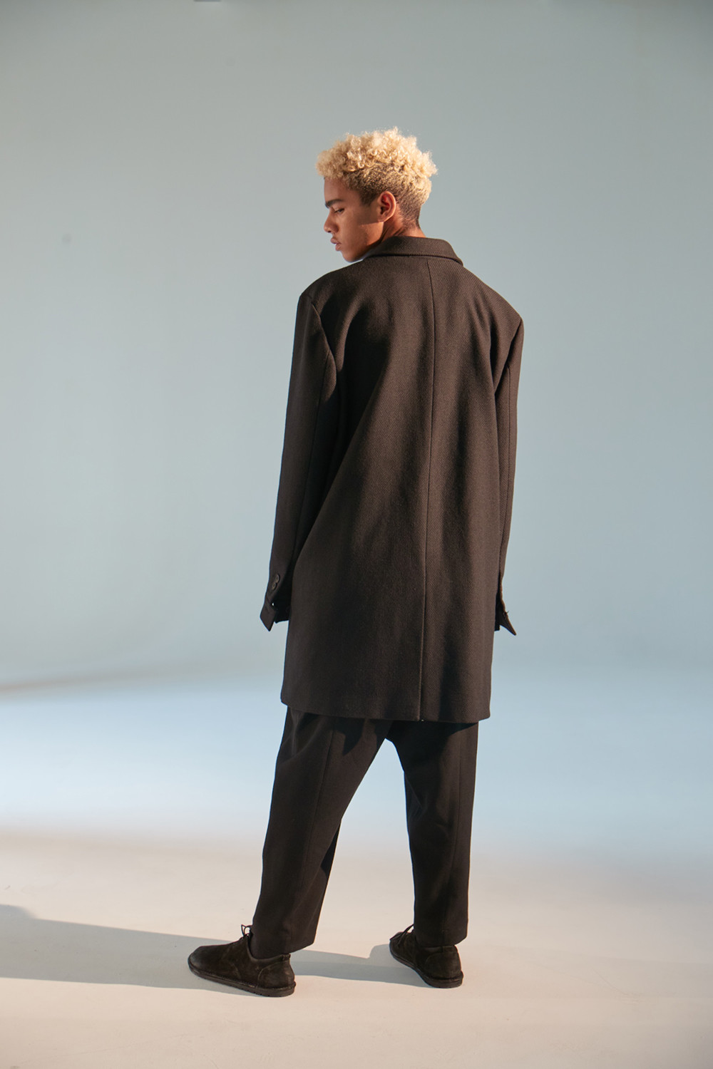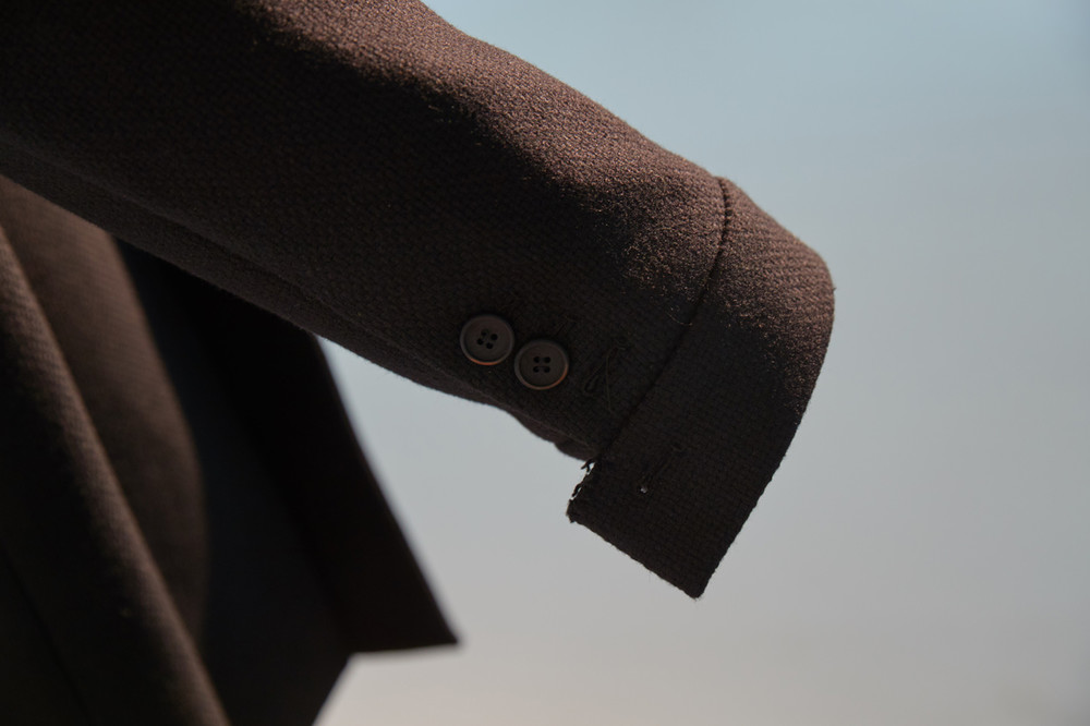 상당한 두께감이 있는 코트로 한겨울에도 따뜻하게 착용가능한 하프기장 코트. 직선적인 듯하면서도 커브를 그리는 카라 곡선. 제품 상세 사진 처럼 카라를 세워서 입는 것 역시 좋은 스타일링의 한 방법. H라인 실루엣으로 드롭 숄더 디자인은 아니지만 넉넉해 보이는 핏. aw18 시즌에 많은 상품에 디자인 디테일로 사용된 slided welt pocket이 왼쪽 가슴에 사용. 소매 하단에 절개를 줘서 셔츠의 커프처럼 보이게 한 것 역시 디자인 포인트(이 커프 부분과 웰트포켓에는 raw edge 피니싱이 들어가 있습니다. 따라서 입을수록 올이 풀리는 것은 자연스러운 현상이며 이러한 러프한 느낌을 염두한 디자인임을 미리 고지하여 드립니다. 자세한 사항은 사진을 참고 하시기 바랍니다). 양쪽 모두 안주머니. 고급 너트 단추 사용. In-seam 포켓.