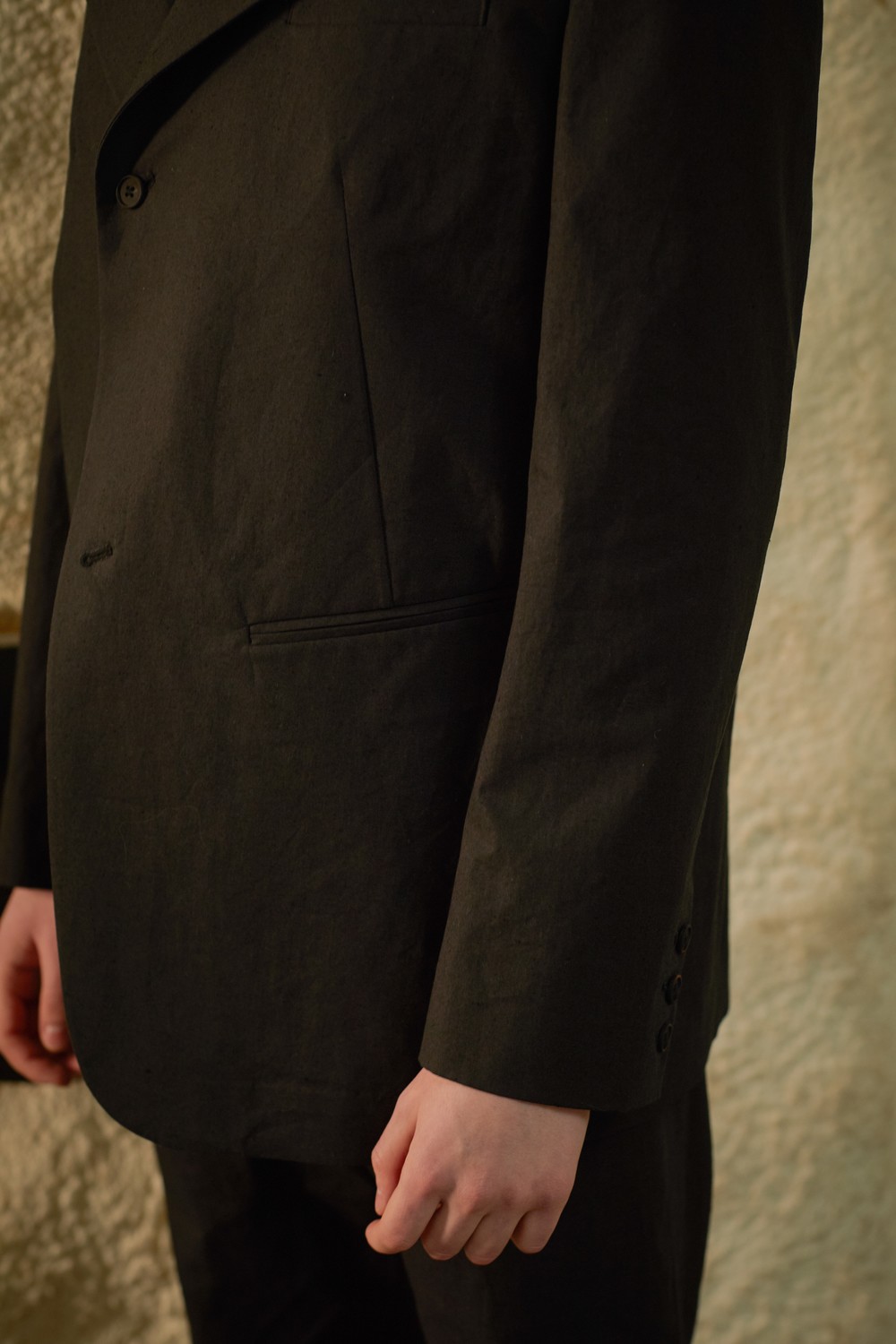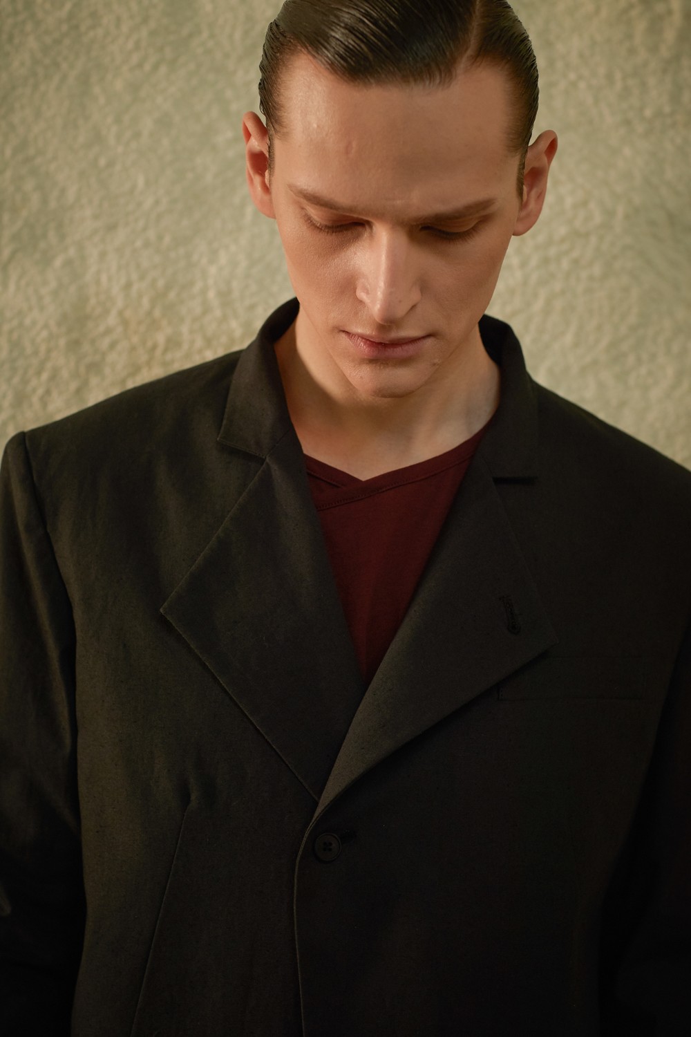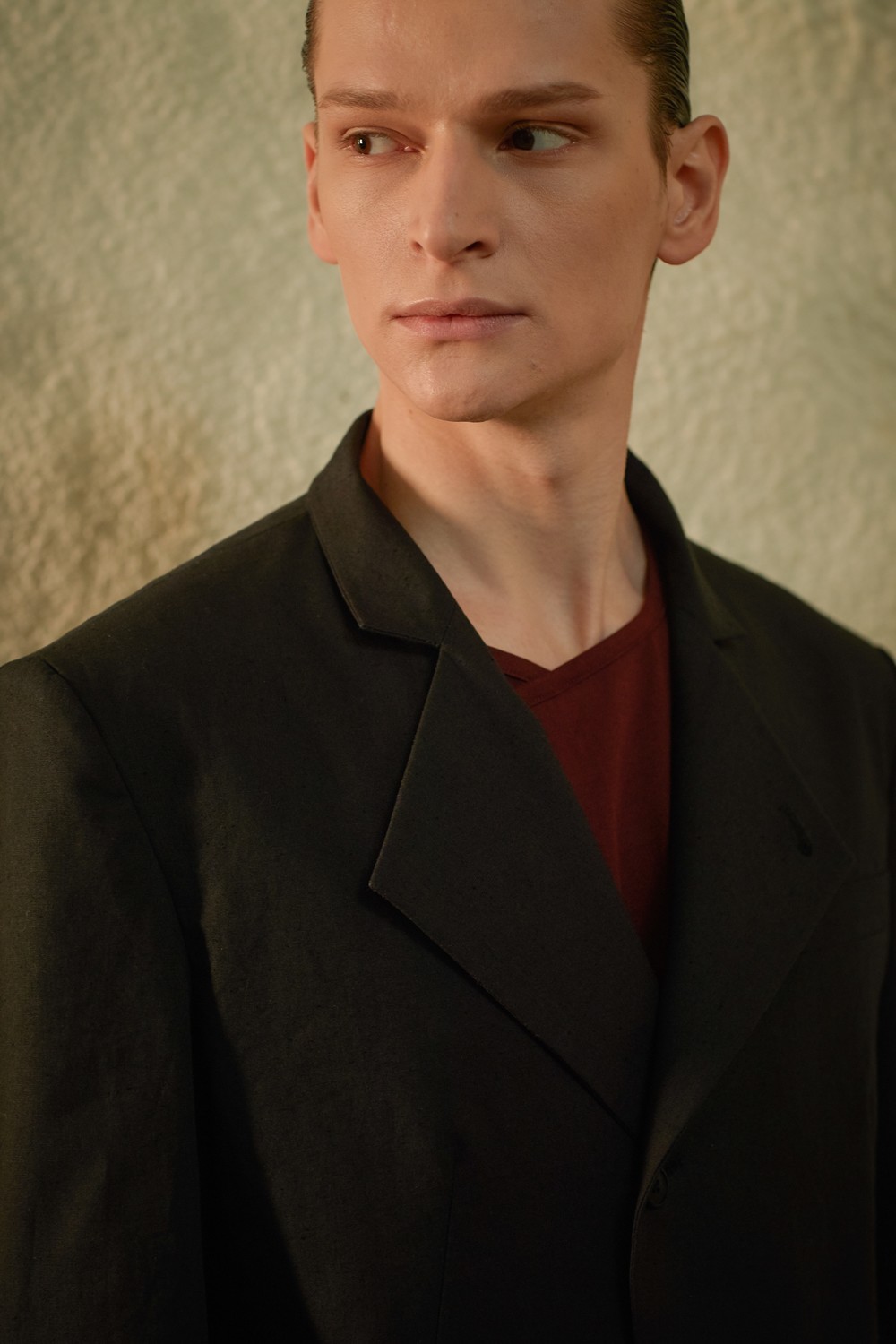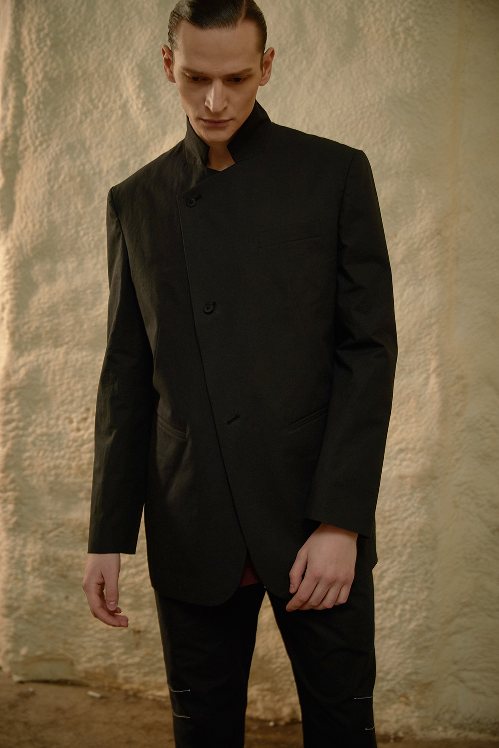 70% cotton, 30 % linen의 고급 일본 수입원단으로 만들어진 반안감 자켓. 러프한 표면 느낌이 상당히 매력적인 자켓. 원단 자체가 굉장히 얇고 또한 반암감으로 내부를 마무리하여 한여름을 제외하면 활용도가 높은 자켓. 자켓의 앞중심이 기울어져 있기 때문에 시크한 매력을 낼 수 있음. 카라를 세워서도, 접어 내려서도 스타일링이 가능함. 다트와 앞의 jet pocket(입술포켓)도 살짝 기울어져 있음. 비스듬하게 뚫린 단추구멍 디테일. 좌우 모두 안주머니 있음.