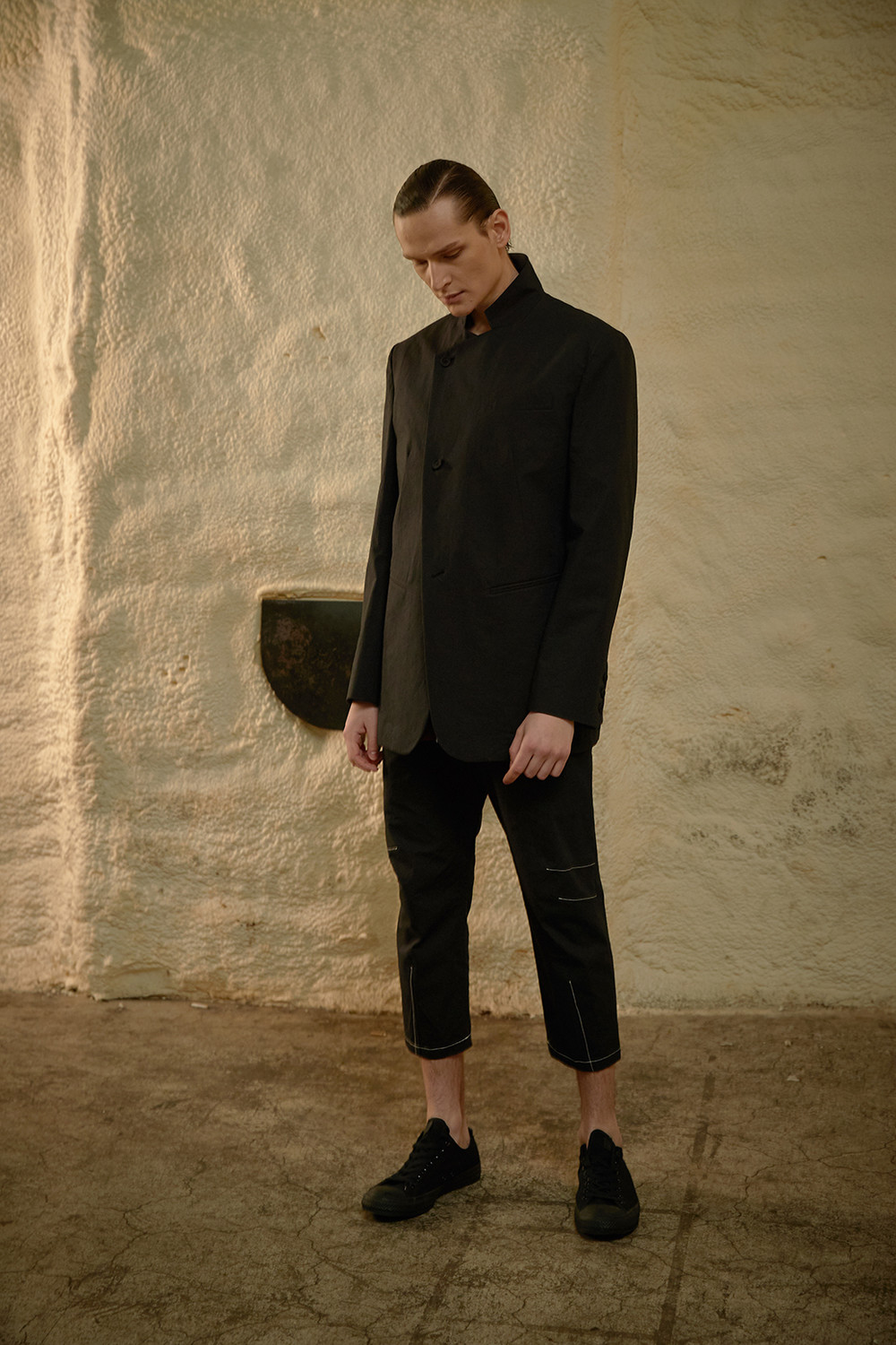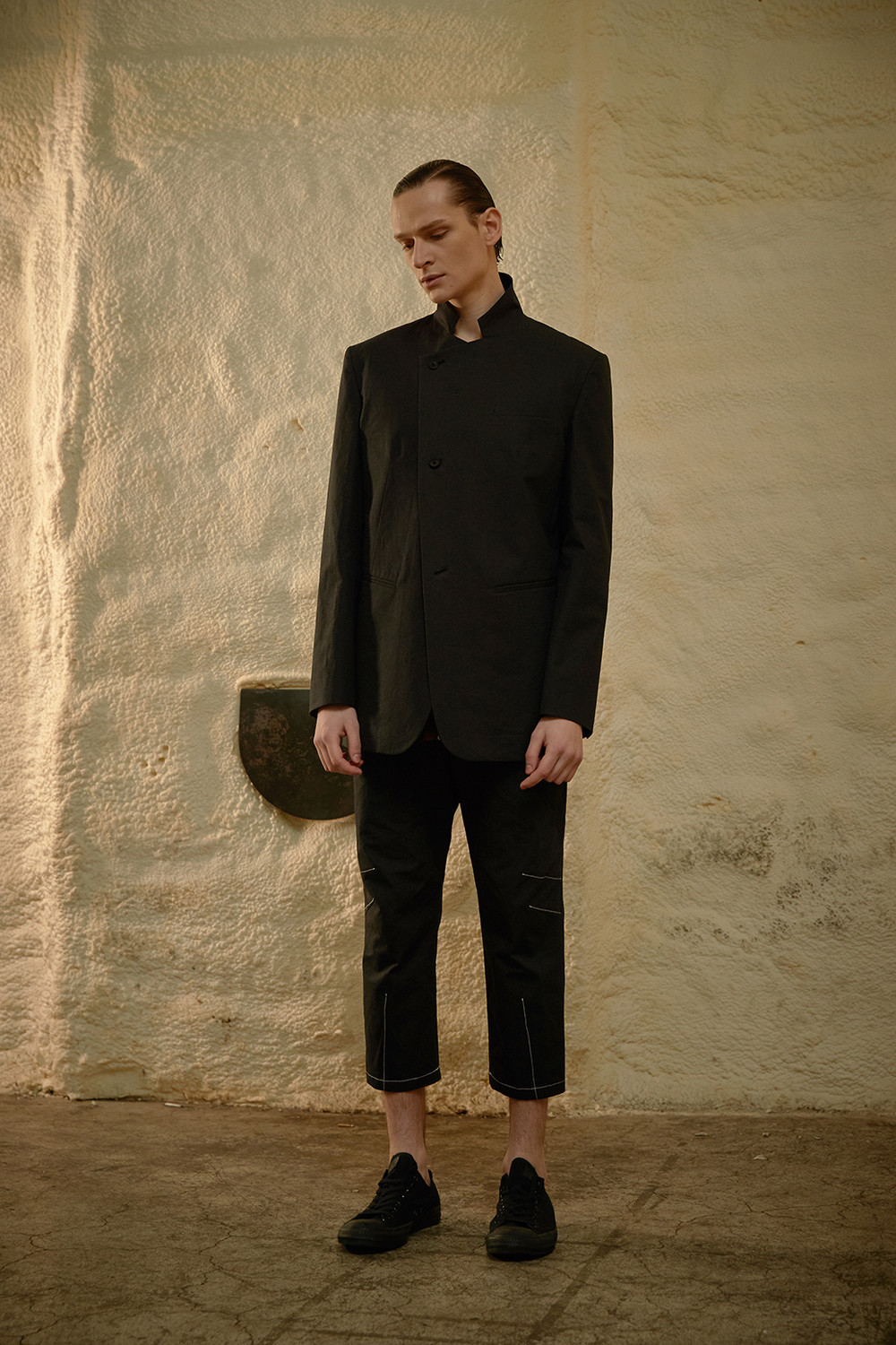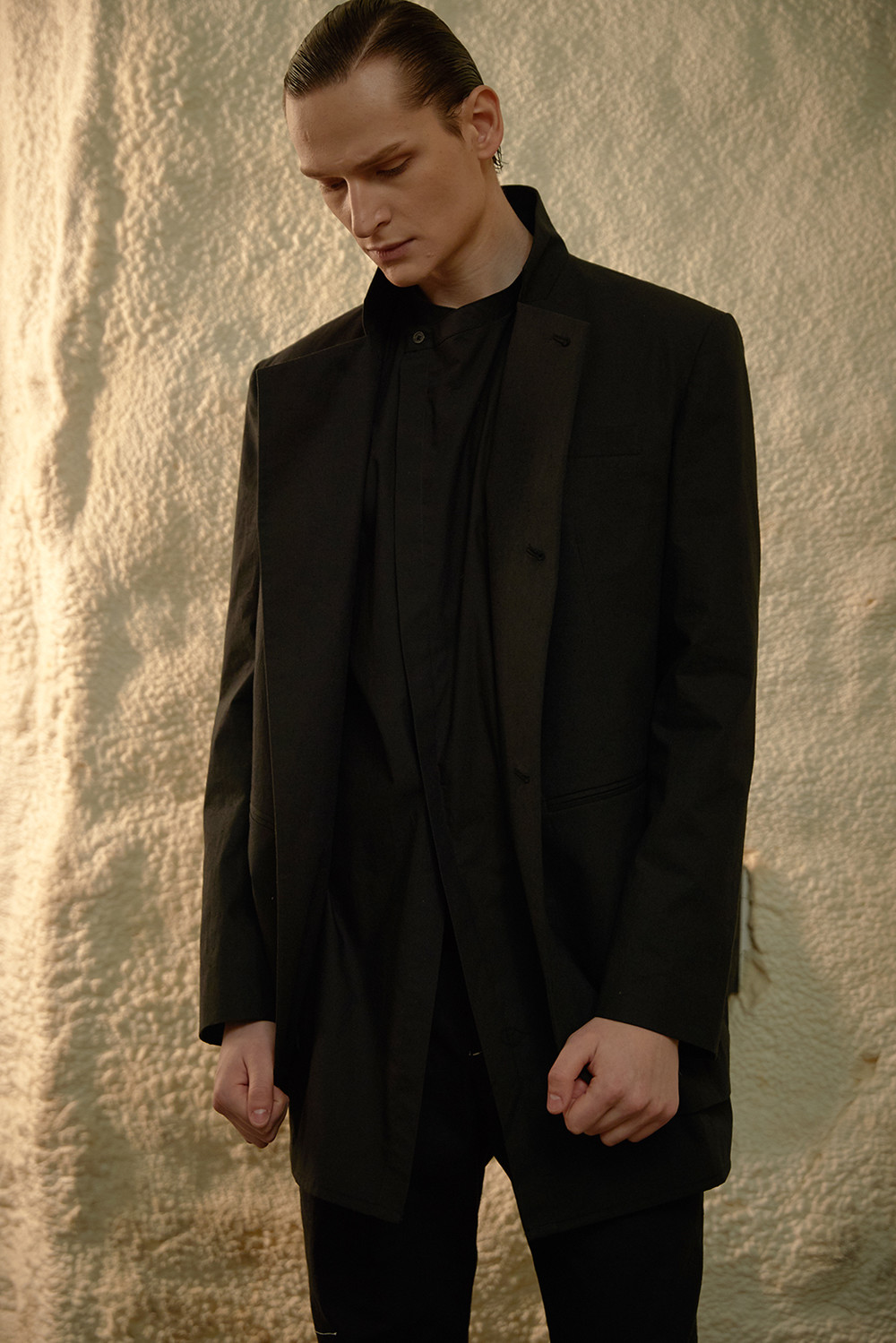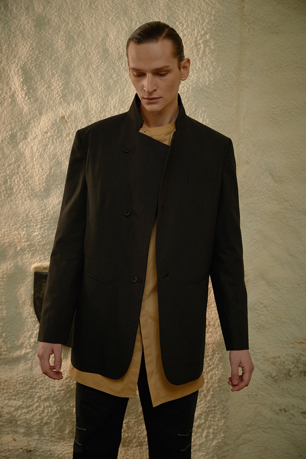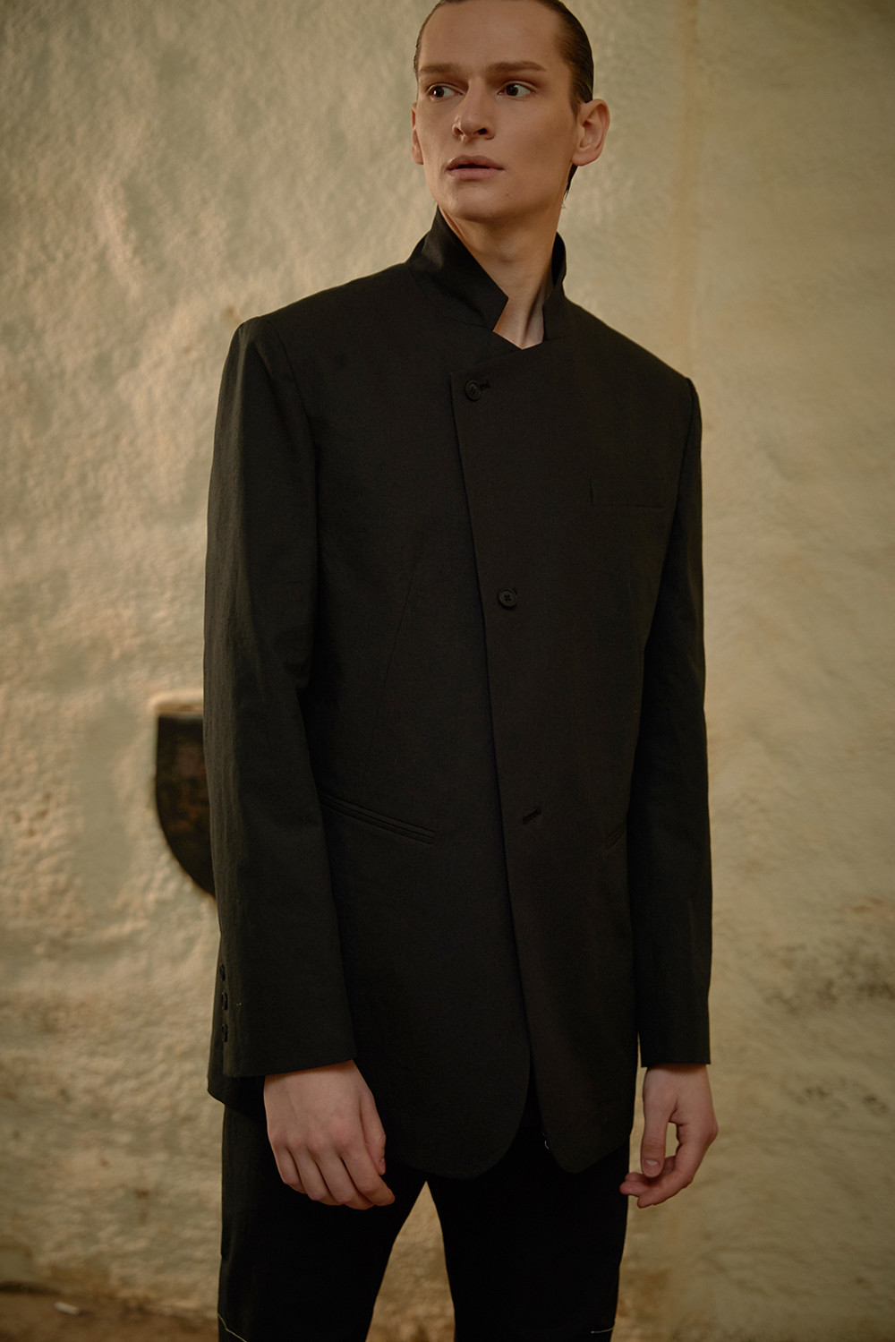 70% cotton, 30 % linen의 고급 일본 수입원단으로 만들어진 반안감 자켓. 러프한 표면 느낌이 상당히 매력적인 자켓. 원단 자체가 굉장히 얇고 또한 반암감으로 내부를 마무리하여 한여름을 제외하면 활용도가 높은 자켓. 자켓의 앞중심이 기울어져 있기 때문에 시크한 매력을 낼 수 있음. 카라를 세워서도, 접어 내려서도 스타일링이 가능함. 다트와 앞의 jet pocket(입술포켓)도 살짝 기울어져 있음. 비스듬하게 뚫린 단추구멍 디테일. 좌우 모두 안주머니 있음.