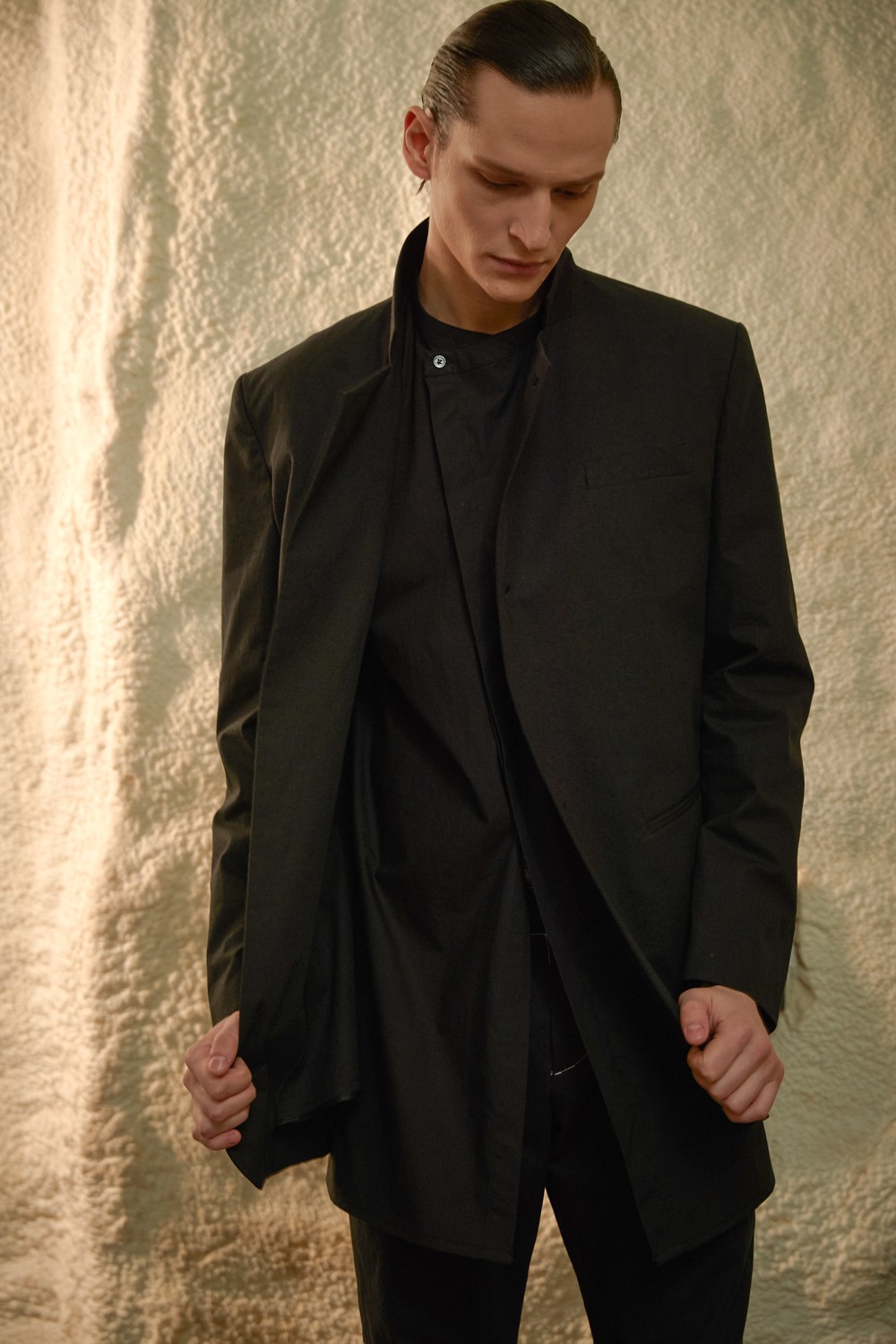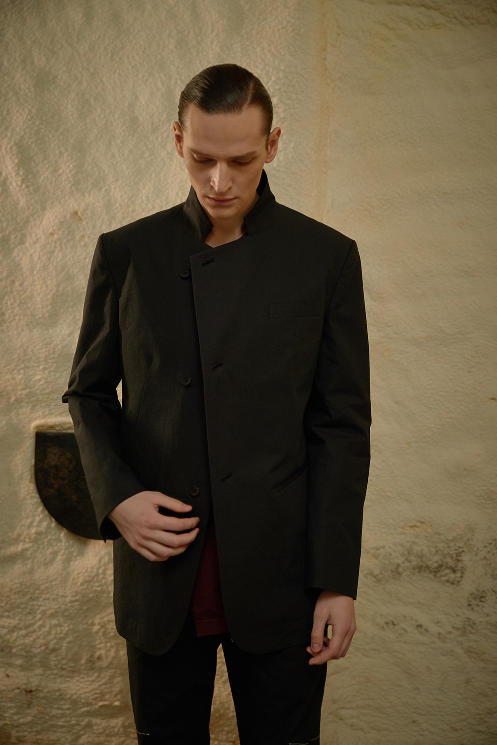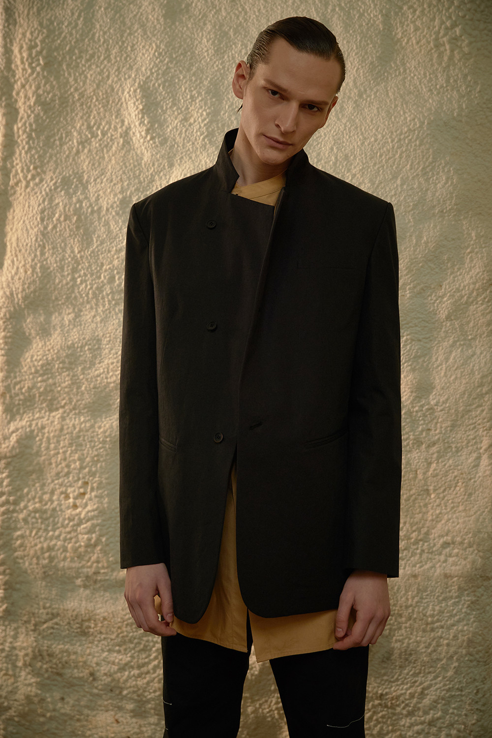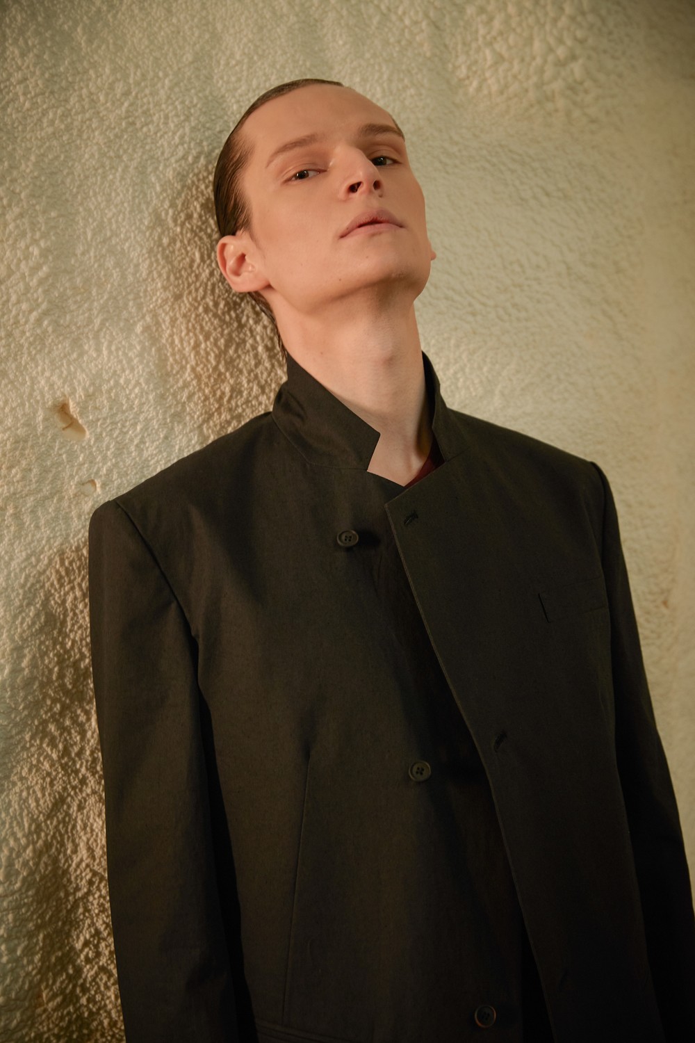 70% cotton, 30 % linen의 고급 일본 수입원단으로 만들어진 반안감 자켓. 러프한 표면 느낌이 상당히 매력적인 자켓. 원단 자체가 굉장히 얇고 또한 반암감으로 내부를 마무리하여 한여름을 제외하면 활용도가 높은 자켓. 자켓의 앞중심이 기울어져 있기 때문에 시크한 매력을 낼 수 있음. 카라를 세워서도, 접어 내려서도 스타일링이 가능함. 다트와 앞의 jet pocket(입술포켓)도 살짝 기울어져 있음. 비스듬하게 뚫린 단추구멍 디테일. 좌우 모두 안주머니 있음.