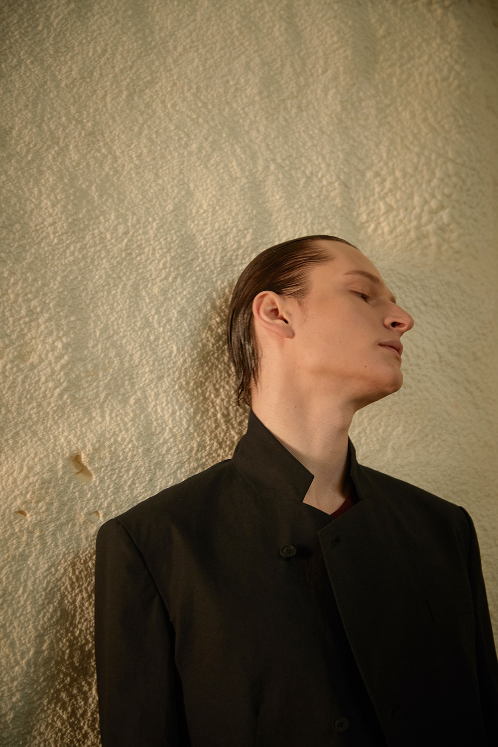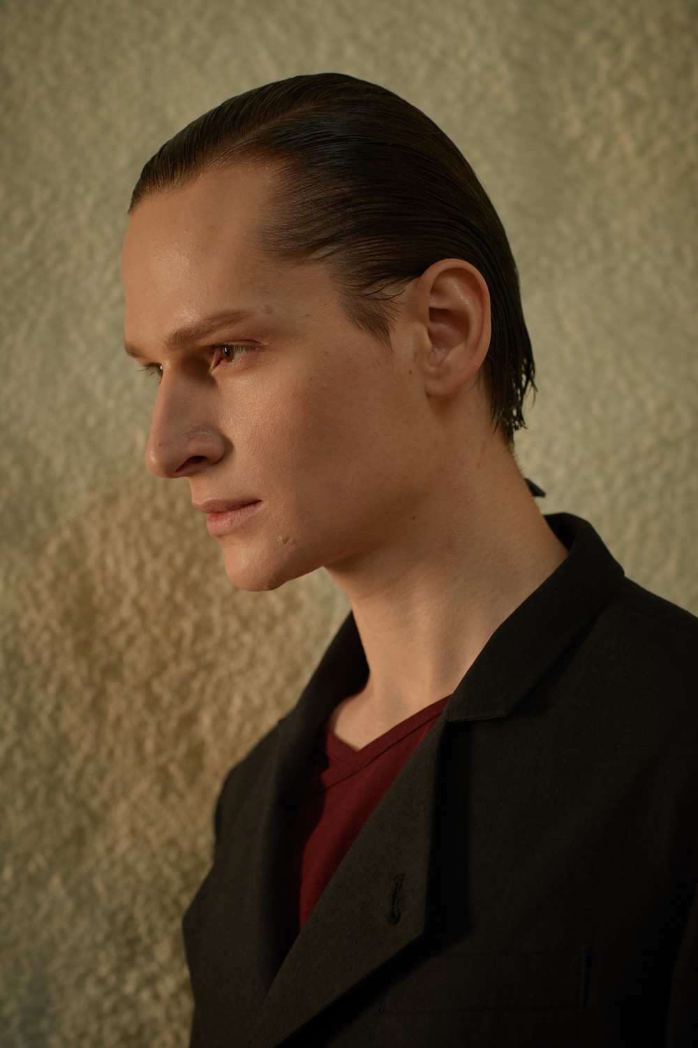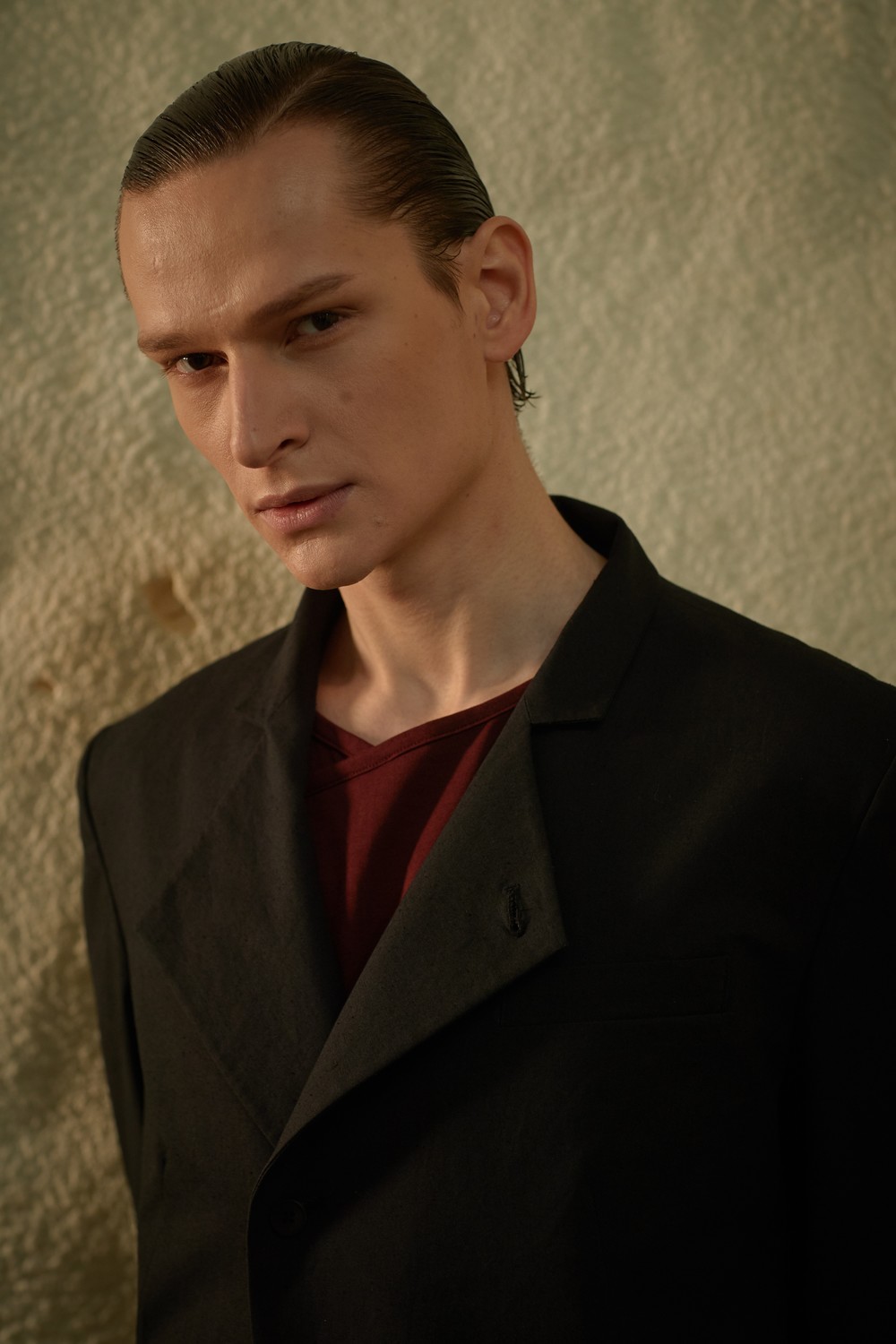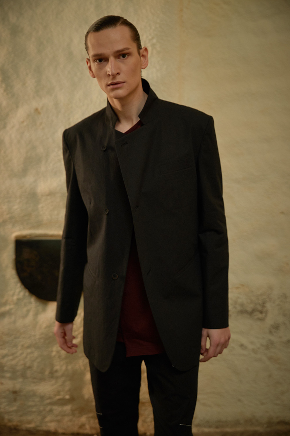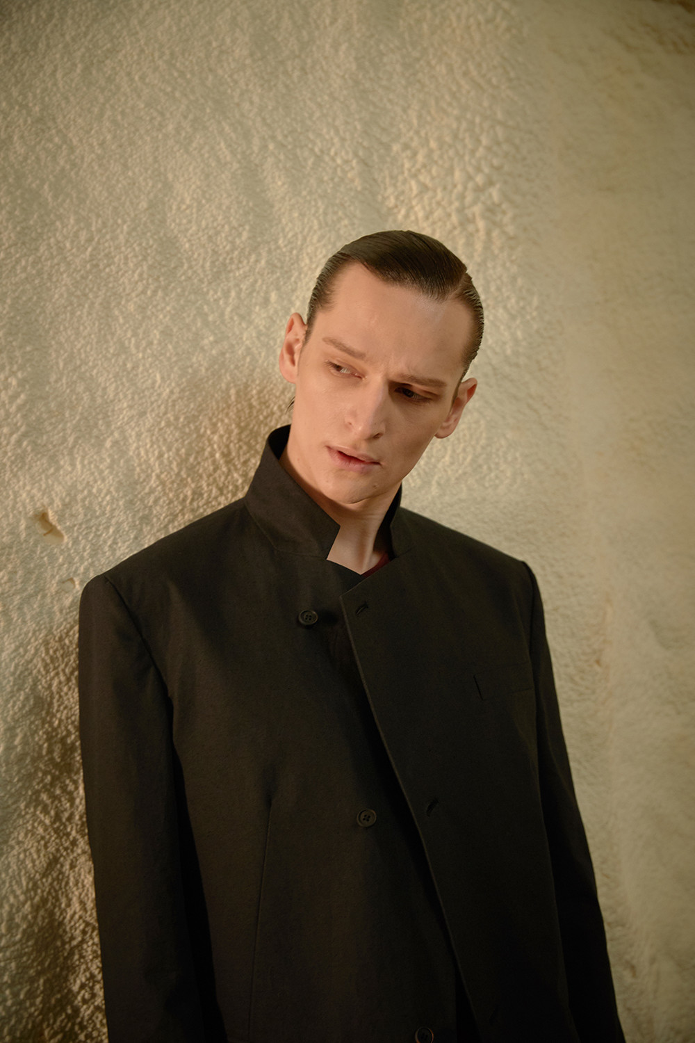 70% cotton, 30 % linen의 고급 일본 수입원단으로 만들어진 반안감 자켓. 러프한 표면 느낌이 상당히 매력적인 자켓. 원단 자체가 굉장히 얇고 또한 반암감으로 내부를 마무리하여 한여름을 제외하면 활용도가 높은 자켓. 자켓의 앞중심이 기울어져 있기 때문에 시크한 매력을 낼 수 있음. 카라를 세워서도, 접어 내려서도 스타일링이 가능함. 다트와 앞의 jet pocket(입술포켓)도 살짝 기울어져 있음. 비스듬하게 뚫린 단추구멍 디테일. 좌우 모두 안주머니 있음.
