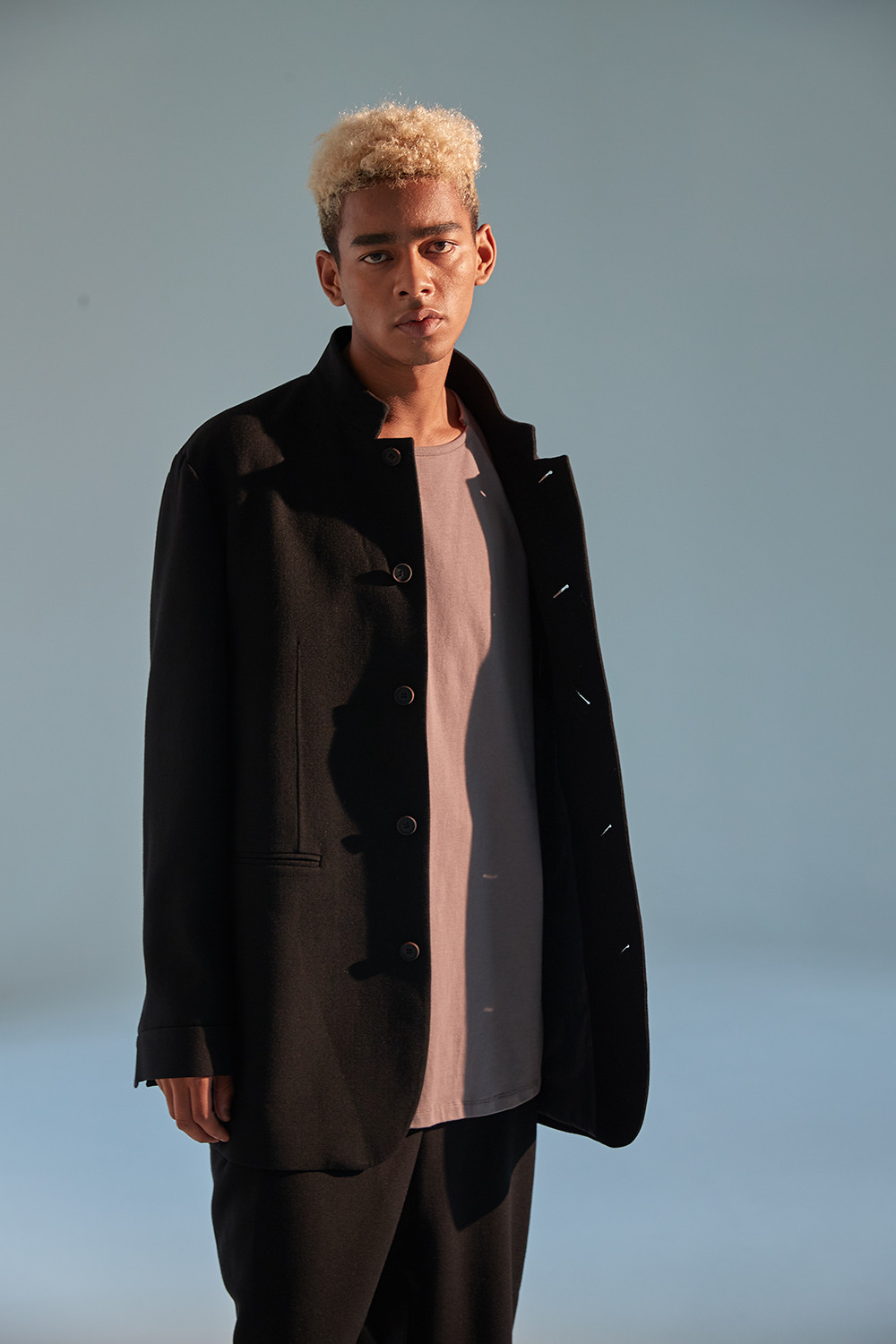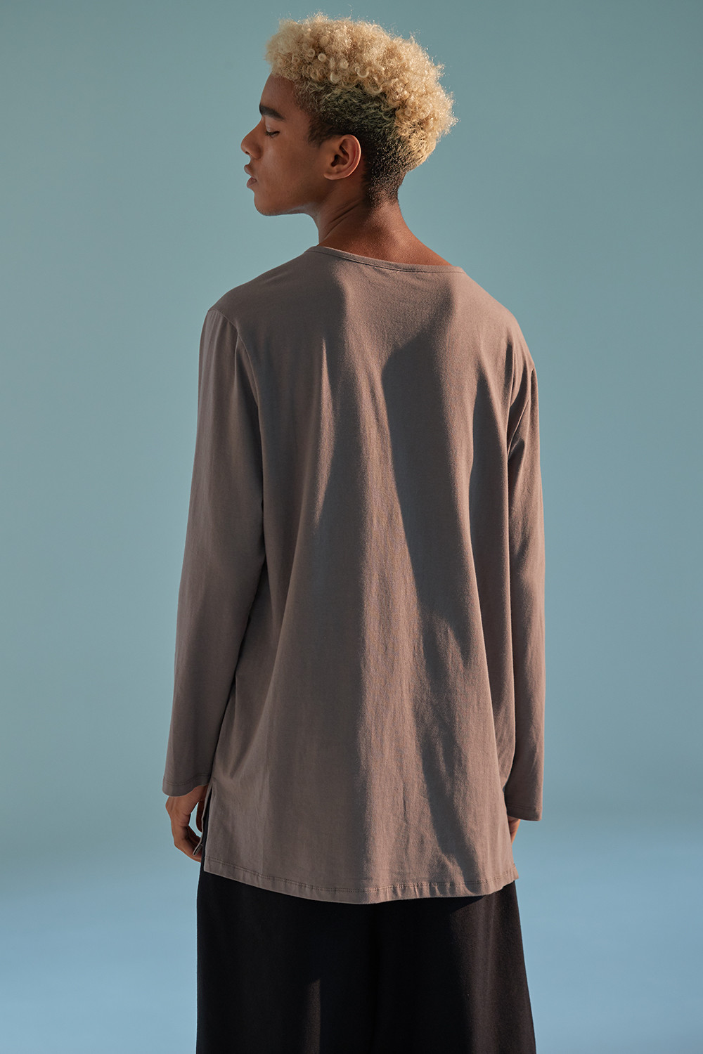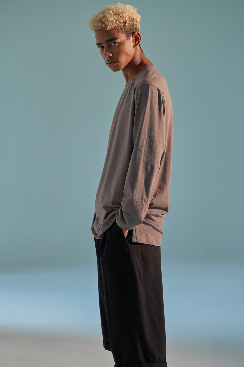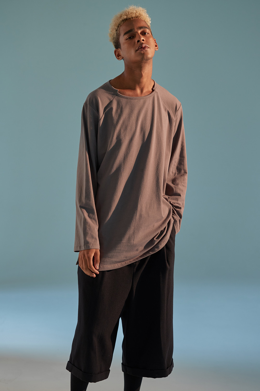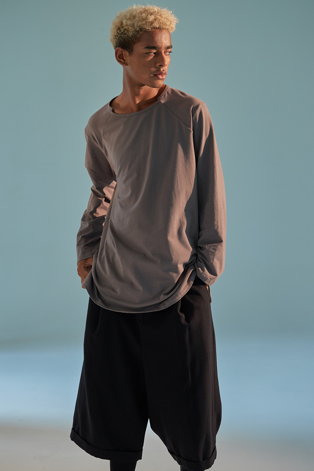 텐션이 많이 들어가 활동성이 좋은 40수 일본 저지 원단 사용. 층진 neck line이 디자인 포인트. 어깨 seam(절개)가 밑으로 드롭됨. 늦여름부터 입기에 좋은 두께감.