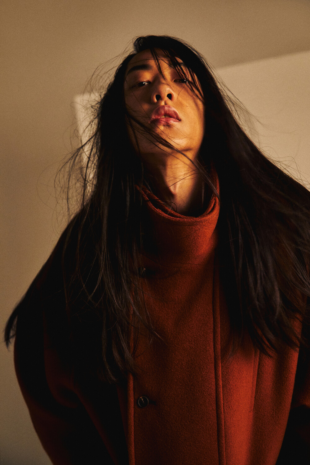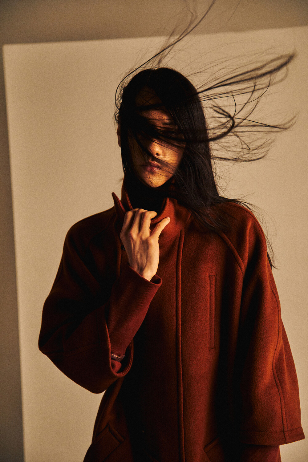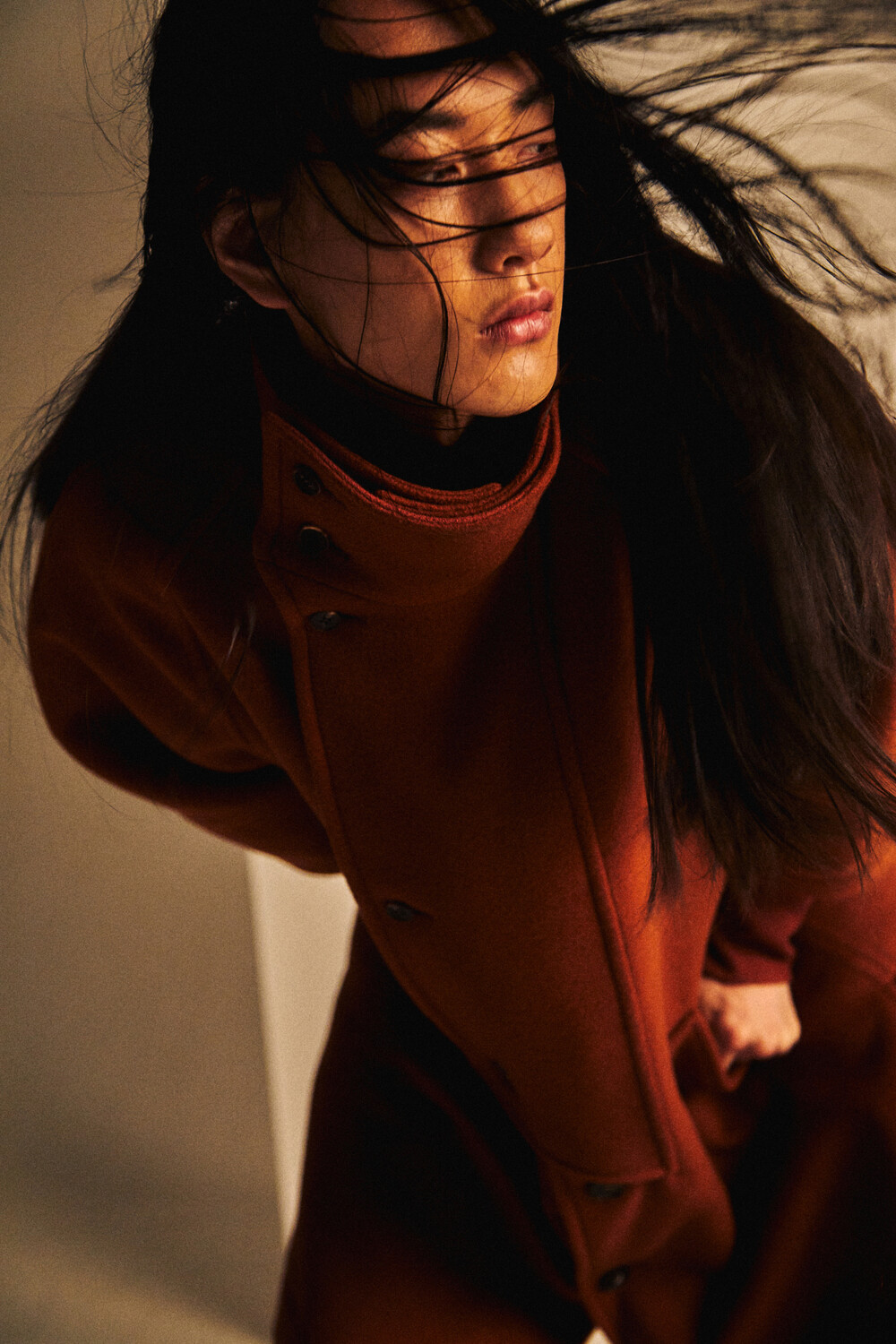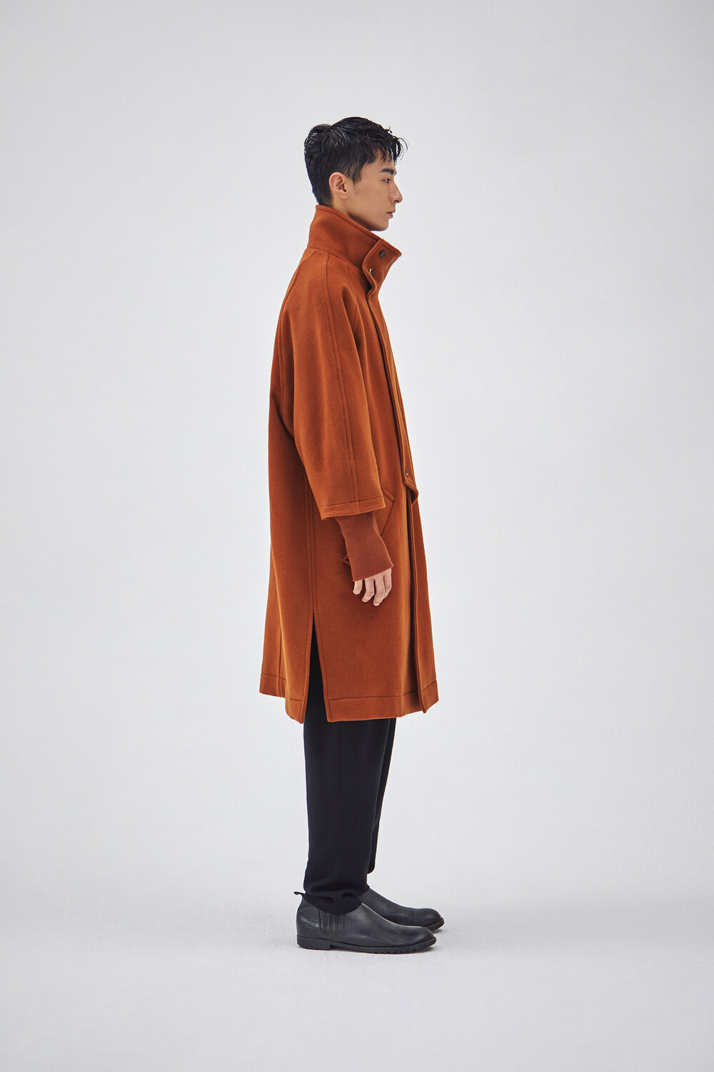 코트 전면부에는 덮개와 같은 덧단이 있어서 이를 활용한 스타일링이 가능합니다.