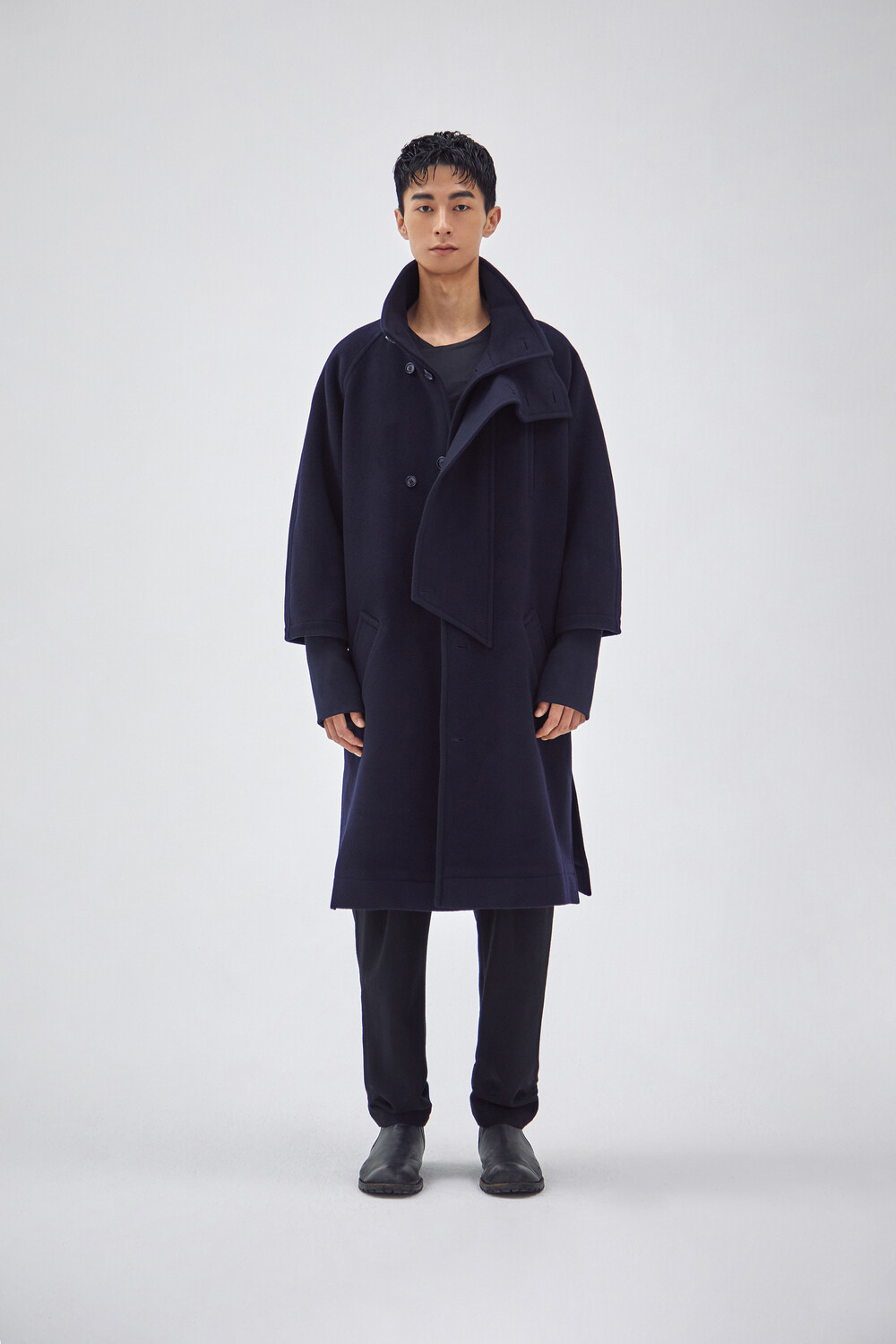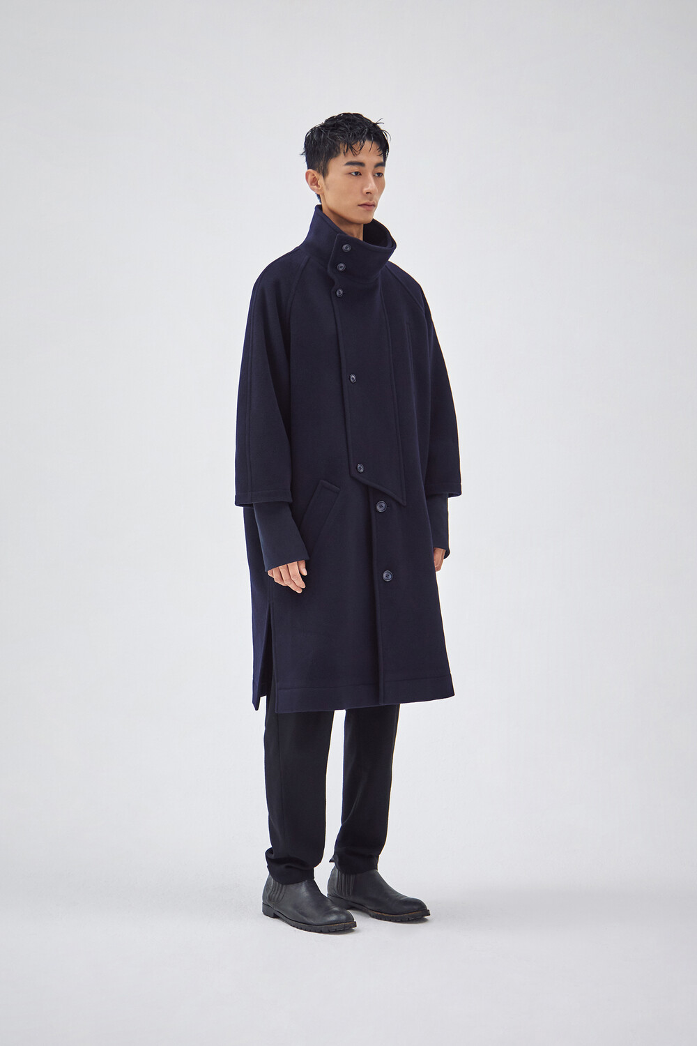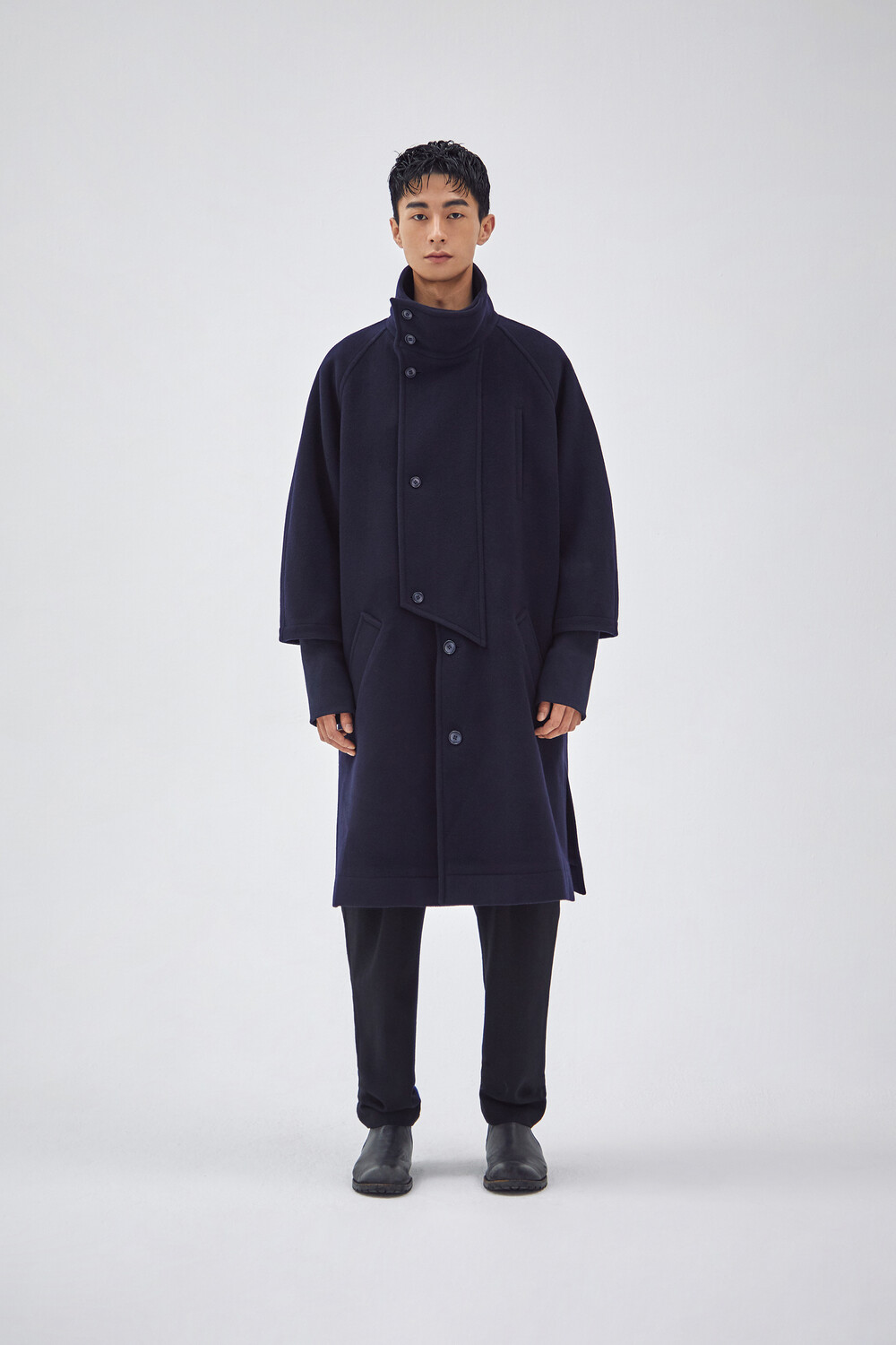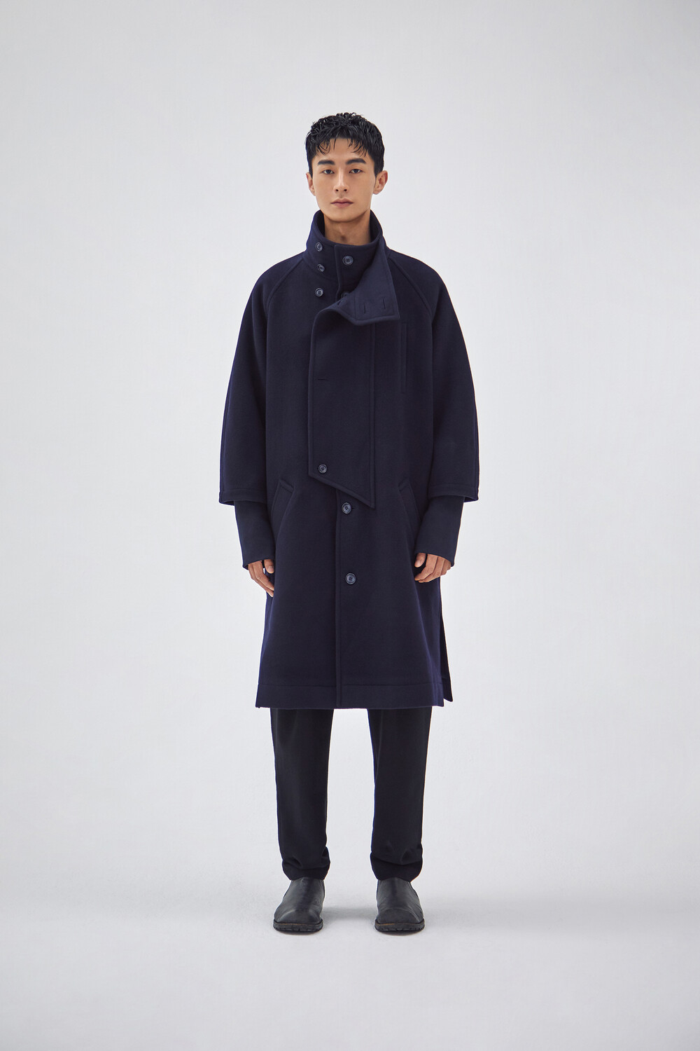 코트 전면부에는 덮개와 같은 덧단이 있어서 이를 활용한 스타일링이 가능합니다.