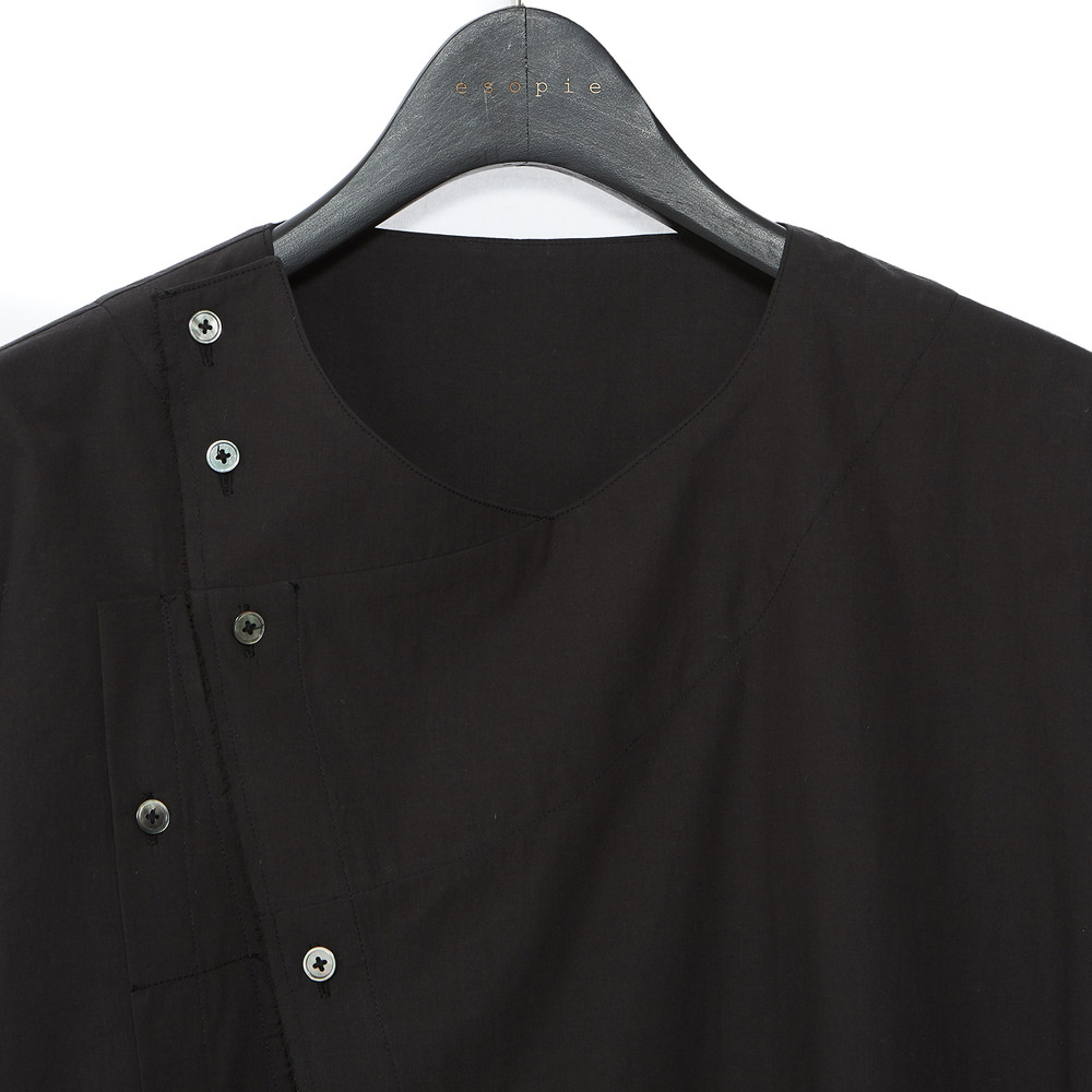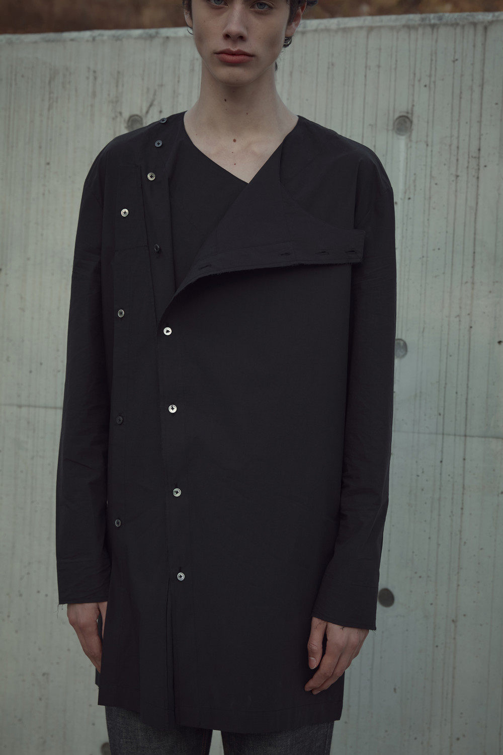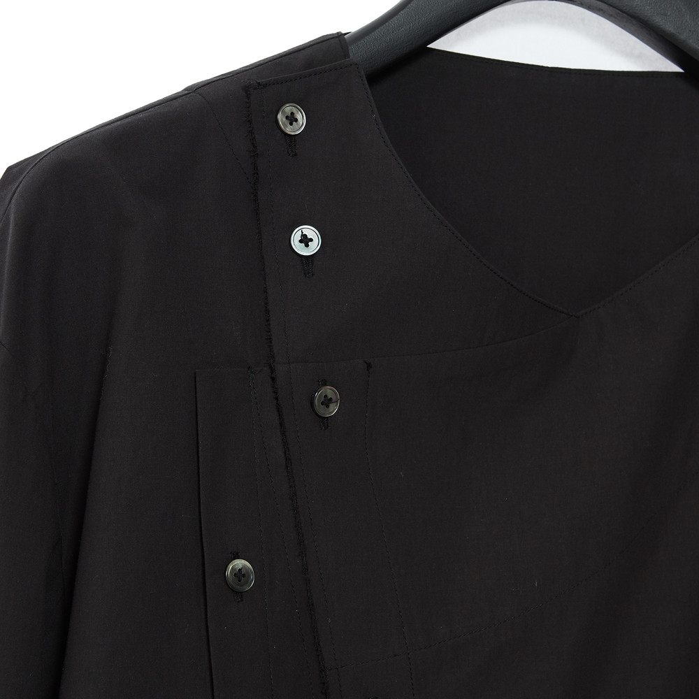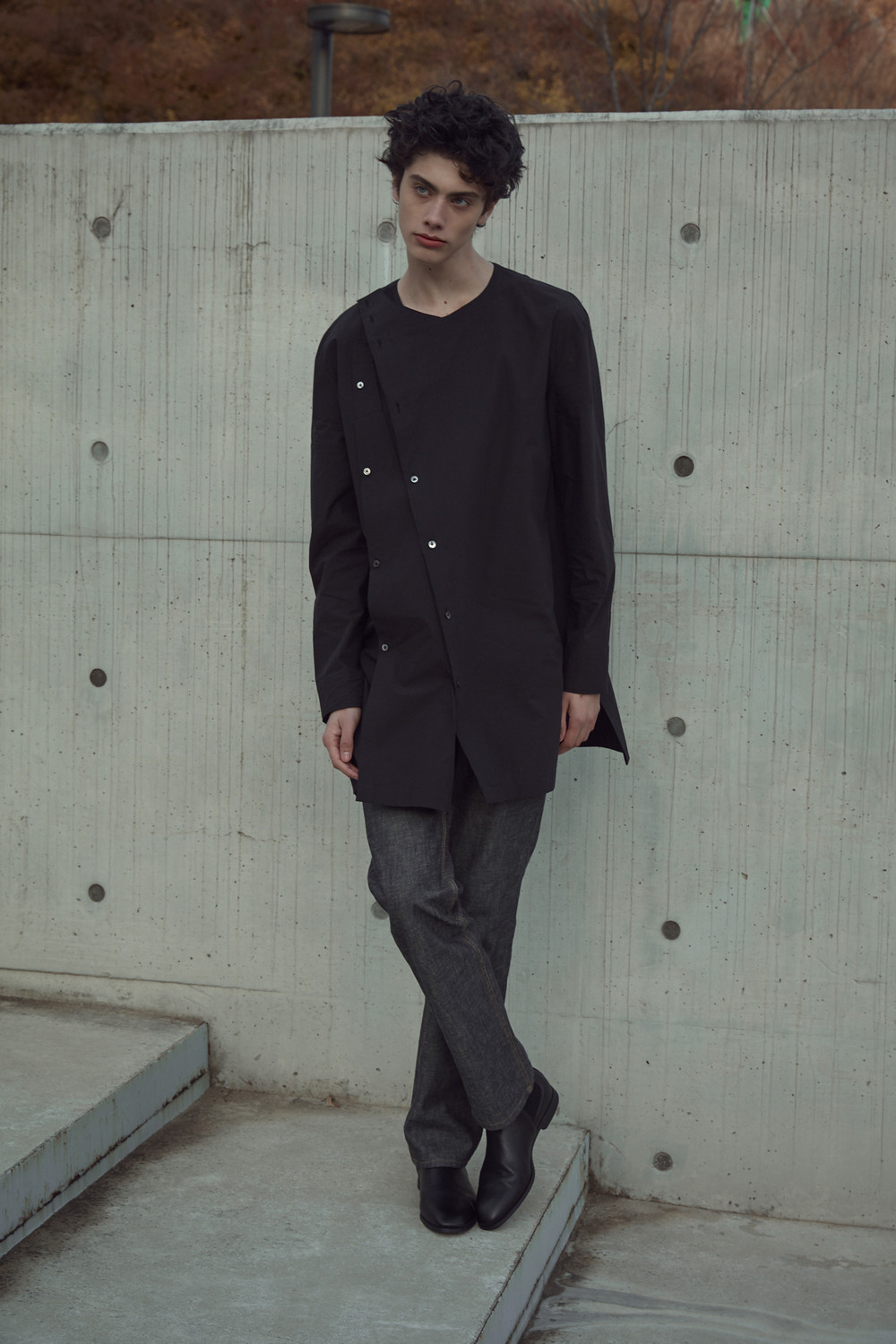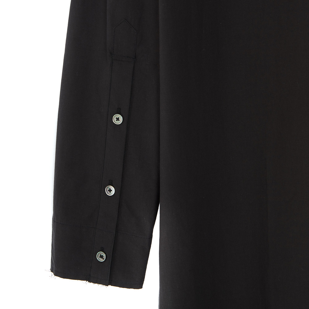 raw edge finishing으로 인하여 러프한 매력을 가미하였고, 소매 단추가 달린 플라켓(Placket)이 일반적인 셔츠의 플라켓보다 긴 것이 디테일 포인트입니다.