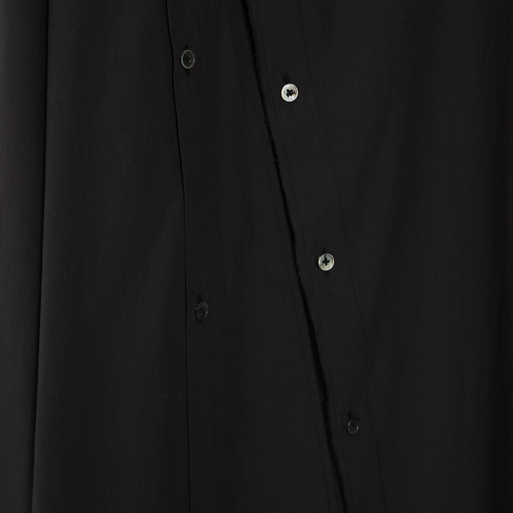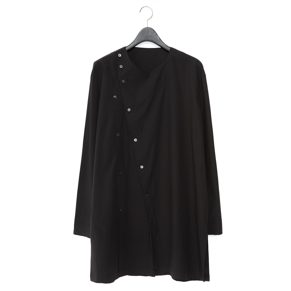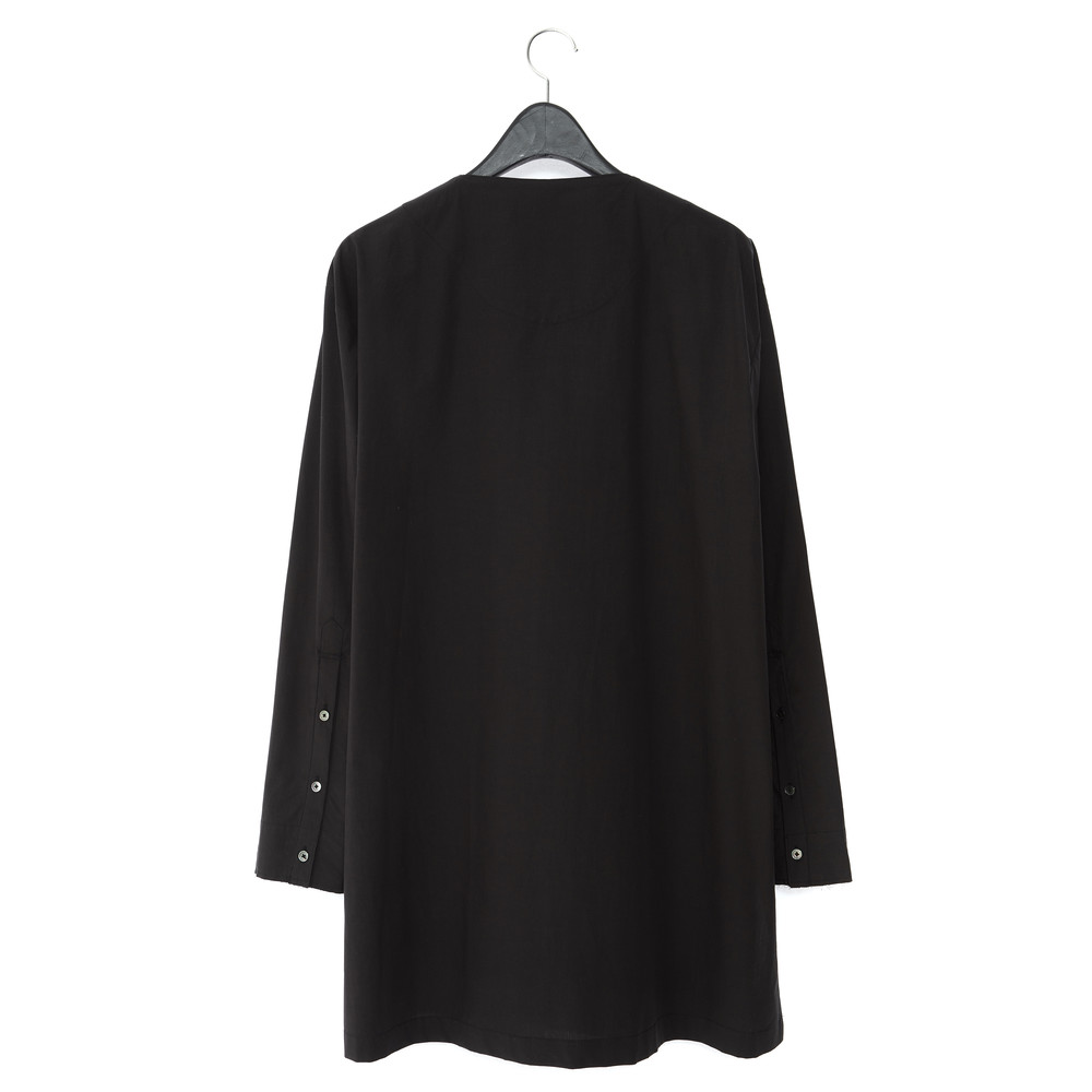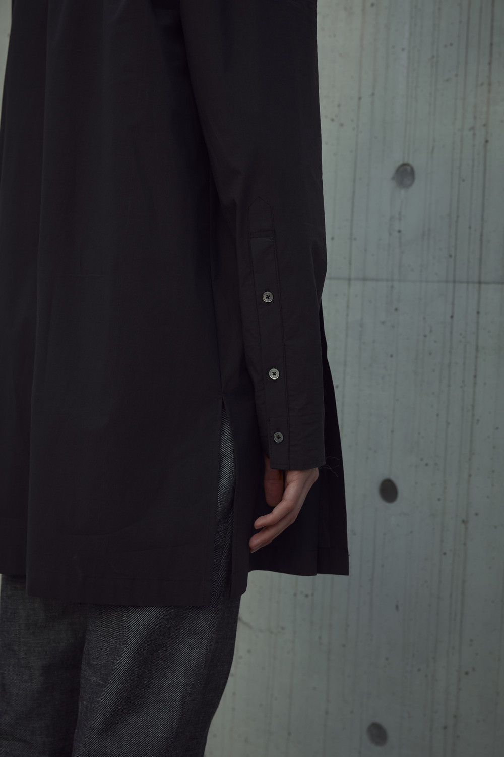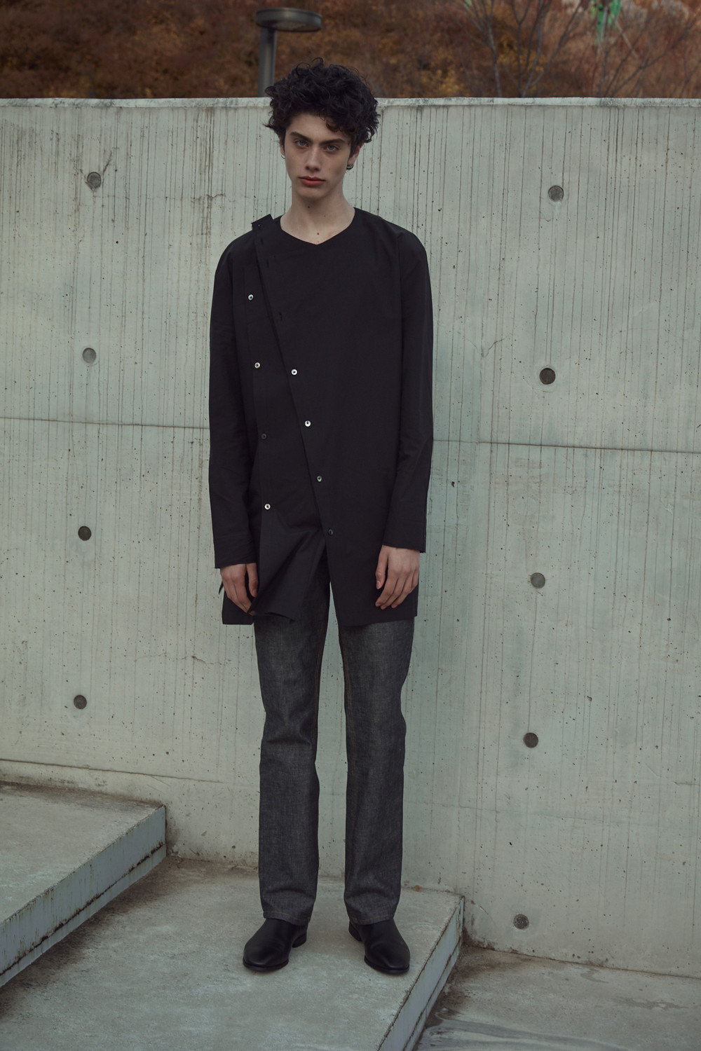 raw edge finishing으로 인하여 러프한 매력을 가미하였고, 소매 단추가 달린 플라켓(Placket)이 일반적인 셔츠의 플라켓보다 긴 것이 디테일 포인트입니다.