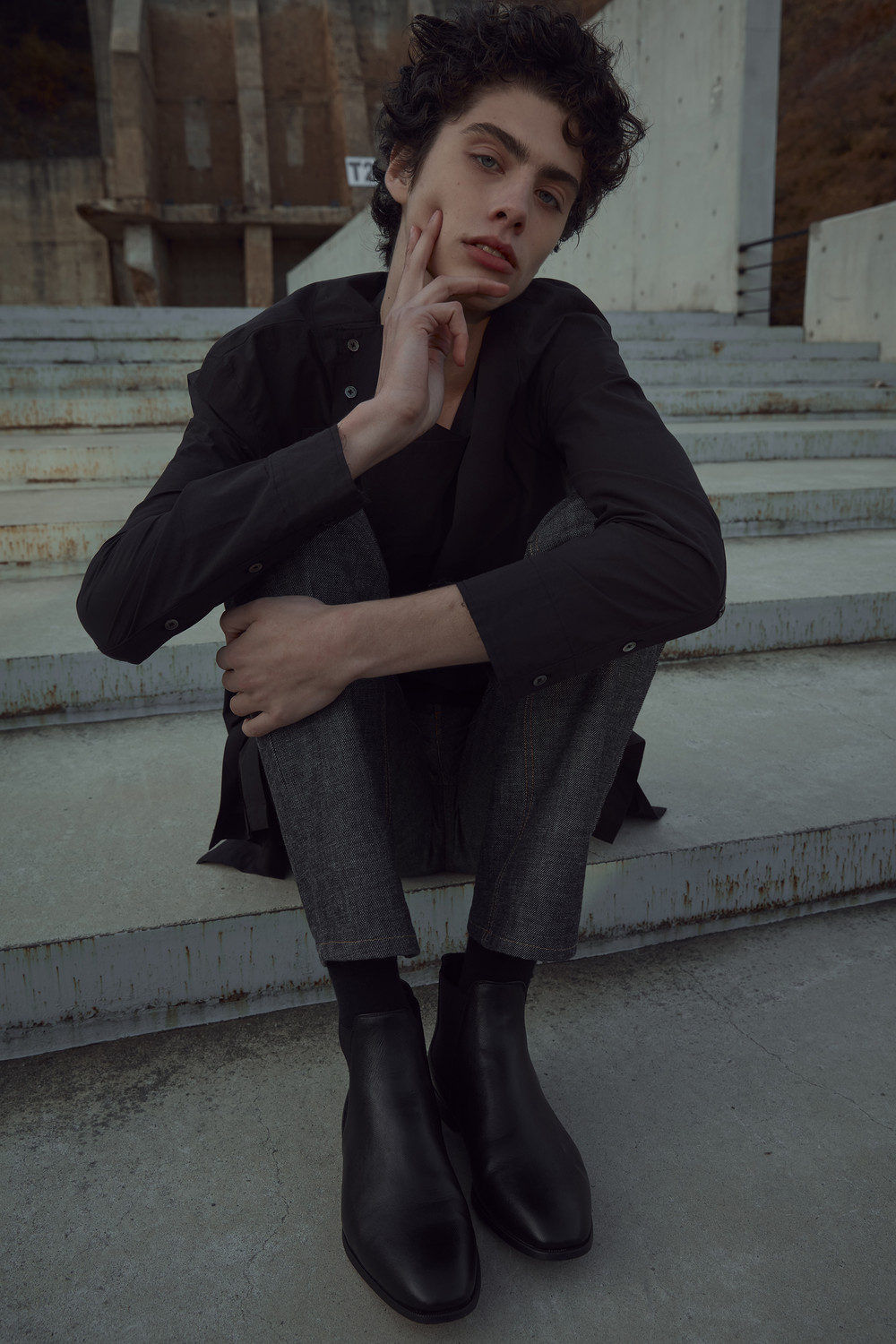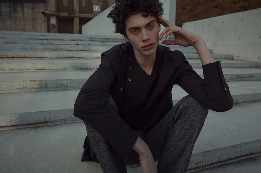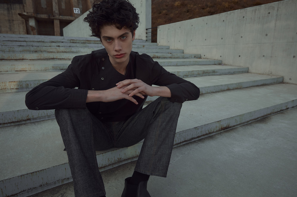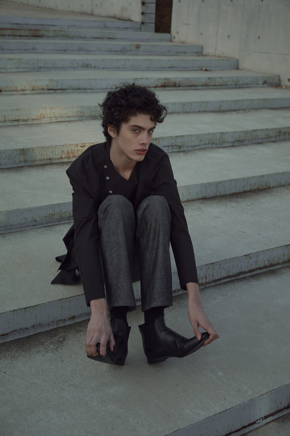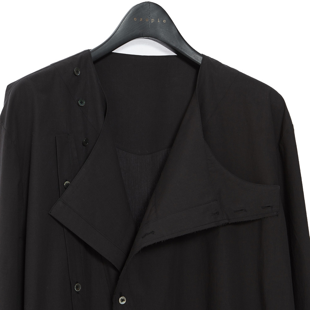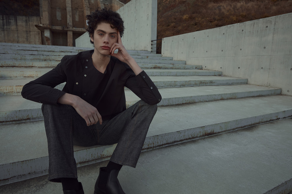 raw edge finishing으로 인하여 러프한 매력을 가미하였고, 소매 단추가 달린 플라켓(Placket)이 일반적인 셔츠의 플라켓보다 긴 것이 디테일 포인트입니다.